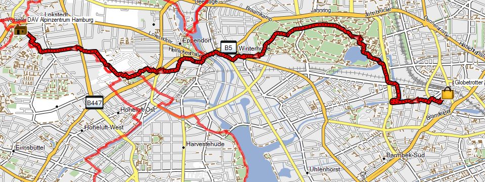 Diese Tour startet vom DAV Partner „Globetrotter“ in Barmbek. An dem Osterbek Kanal entlang führt der Weg zur Saarlandstraße und dann in den Stadtpark und direkt um den Stadtparksee herum. Rechts davon liegt der Rosengarten und weiter geht es in westlicher Richtung bis zum Planetarium. Der Stadtteil Winterhude wird durchwandert und man überquert die Alster in Höhe des Winterhuder Fährhauses und Alma Hoppes Lustspielhauses. Über die Hahnemannstraße erreicht man den Eppendorfer Marktplatz und von da wandert man über die Kümmelstraße zum Eppendorfer Park, dann durch das UKE Gelände zum Lokstedter Wasserturm und bis zum Lohbekpark, weiter in die Döhrnstraße zum DAV Kletterzentrum Hamburg mit dem Edelweiß Bistro.