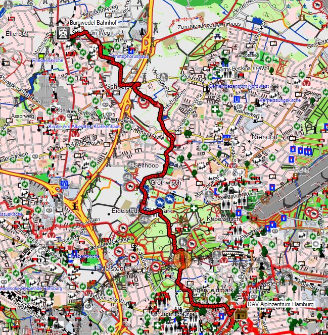 Von der S1-Station Hoheneichen führt der Weg durch den Friedhof Ohlsdorf zum Bramfeldersee, weiter zur S-Bahnstation Ohlsdorf und dann an der Alster entlang bis zur Ludolf Straße, von da zum Eppendorfer Park um das UKE herum zum DAV Kletterzentrum Hamburg mit dem Edelweiß Bistro.