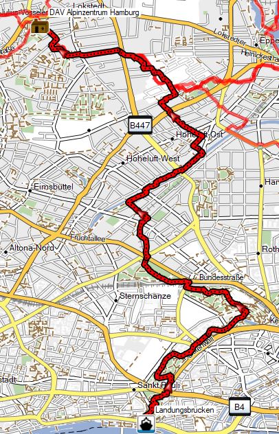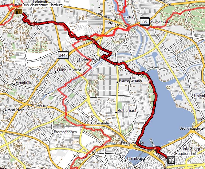 Die Route beginnt auf der Ostseite des Hauptbahnhofes in Hamburg, führt über den "Heidi-Kabel-Platz" zur Außenalster. Über die "Kennedybrücke" wird in Richtung Norden am Alster Westufer entlang gewandert.  In Richtung "Klosterstern" wird die Alster verlassen und das "UKE" angesteuert. Durch die UKE Anlage führt die Strecke zum Lokstedter Wasserturm und dann weiter über die "Brunsberg" Straße zum Weg "An der Lohbek". Von da folgt die Route der "Lohbek" zur "Döhrnstraße", wo sich das DAV Kletterzentrum Hamburg mit dem Edelweiß Bistro befindet.
