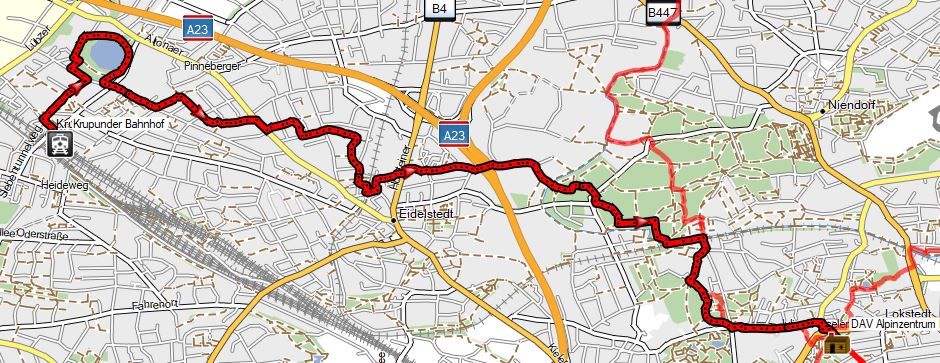 Von der S-Bahn Station Krupunder führt diese Strecke fast um den Krupunder See herum, durch Eidelstedt,  weiter über das Autobahndreieck Nordwest in die Eidelstedter Feldmark.  Das Niendorfer Gehege wird durchschritten bis an die Kollau. Den Kollau Wanderweg verlässt man in Höhe des Deelwisch und geht dann durch die Stellinger Feldmark. Am Gazellenkamp geht es östlich um die NDR-Gelände herum und überquert die Julius- Vossler-Straße, dann geht es geradeaus direkt in die Döhrnstraße zum DAV Kletterzentrum Hamburg mit dem Edelweiß Bistro.