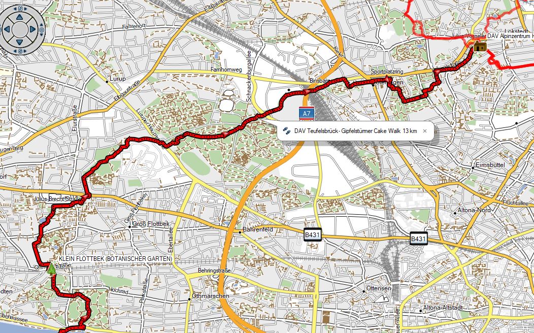 Vom Elbanleger Teufelsbrück führt die Route durch den Jenischpark zur S-Bahnstation Klein Flottbek und dann um den Botanischen Garten westlich herum zum "Ziegeleiteich" und dann am  "Friedhof Groß Flottbek" vorbei zum Lise-Meitner-Park am "DESY" - Gelände. Durch den "Dahliengarten Hamburg" im Volkspark, dann am Volksparkstadion zur Überquerung der Schnackenburgerallee weiter entlang geht es dann zum S-Bahnhof Stellingen. Über die Jugendstraße weiter zur Basselstraße und da links ab zu den "Gartenfreunde Wittkamp e.V." Nach der Gartenanlage erreicht man die Eisbahn Stellingen und die U-Bahnstation "Hagenbecks Tierpark". Weiter geht es am "Schillingsbek" zum DAV Kletterzentrum Hamburg mit dem Edelweiß Bistro.