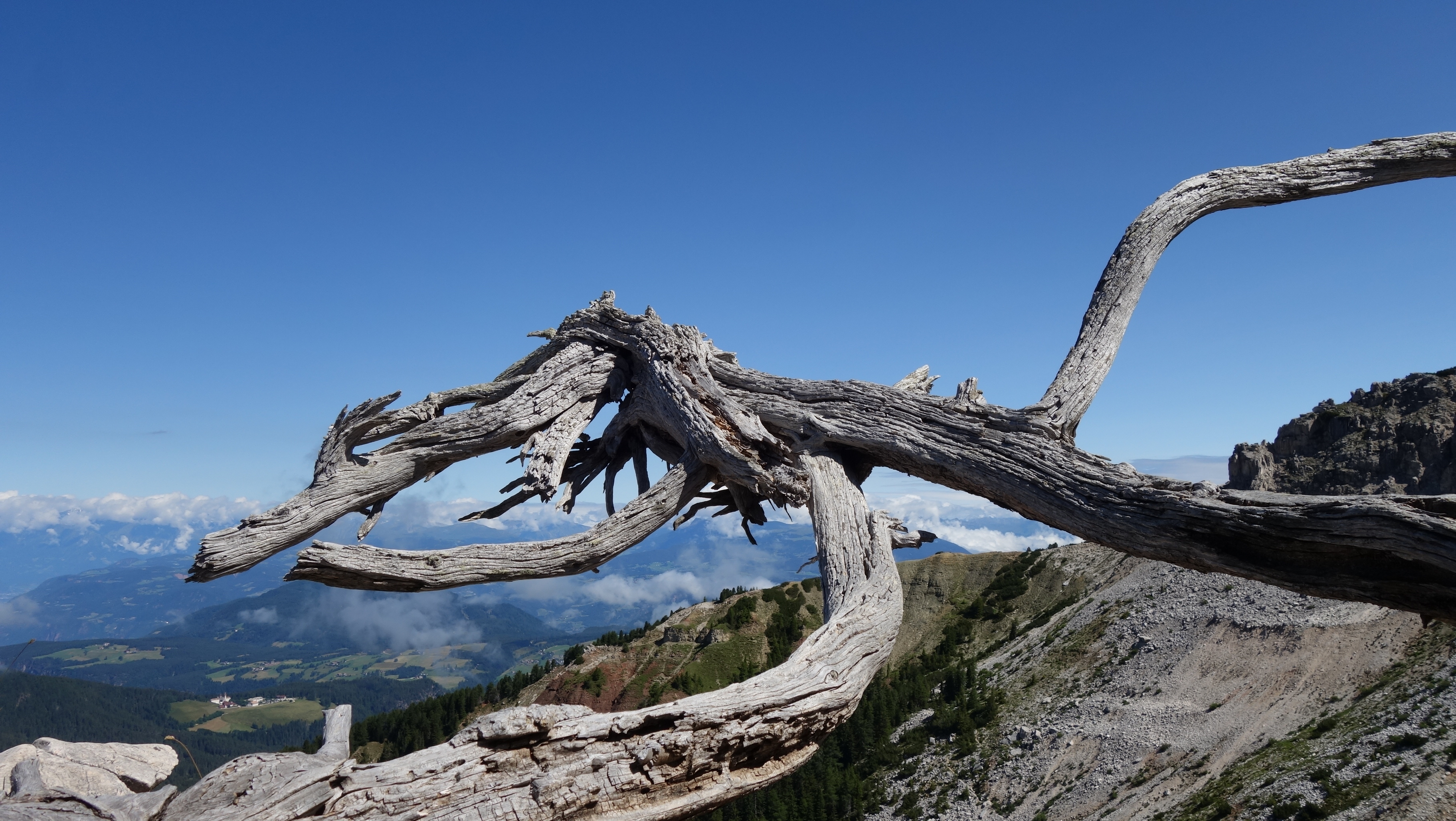 Nun beginnt schon die 6. Tagesetappe (ATG3-23) vom Karerpass am Latemar Gebirge entlang durch das Latemar Labyrinth. Einige urige Waldwege und ein steiler Wiesenabstieg zur Zischgalm auf diesem Weg ermöglicht unterwegs viele Panoramablicke. Die Tour wird durch das Latemar Labyrinth etwas verlängert aber auch deutlich verschönert. Der Panaoramablick geht auch auf den Rosengarten. Einige Lifte bringen weitere Touristen zu den ausgebauten Wegen mit tollen Pausenplätzen – z.B. eine Bank zum Drehen und Liegestühle. Eine besondere Ruhe herrscht hier in den Bergen. Am Ende ist der Abstieg zur Zischgalm über eine steile Wiese mit vielen Löchern nicht ungefährlich.