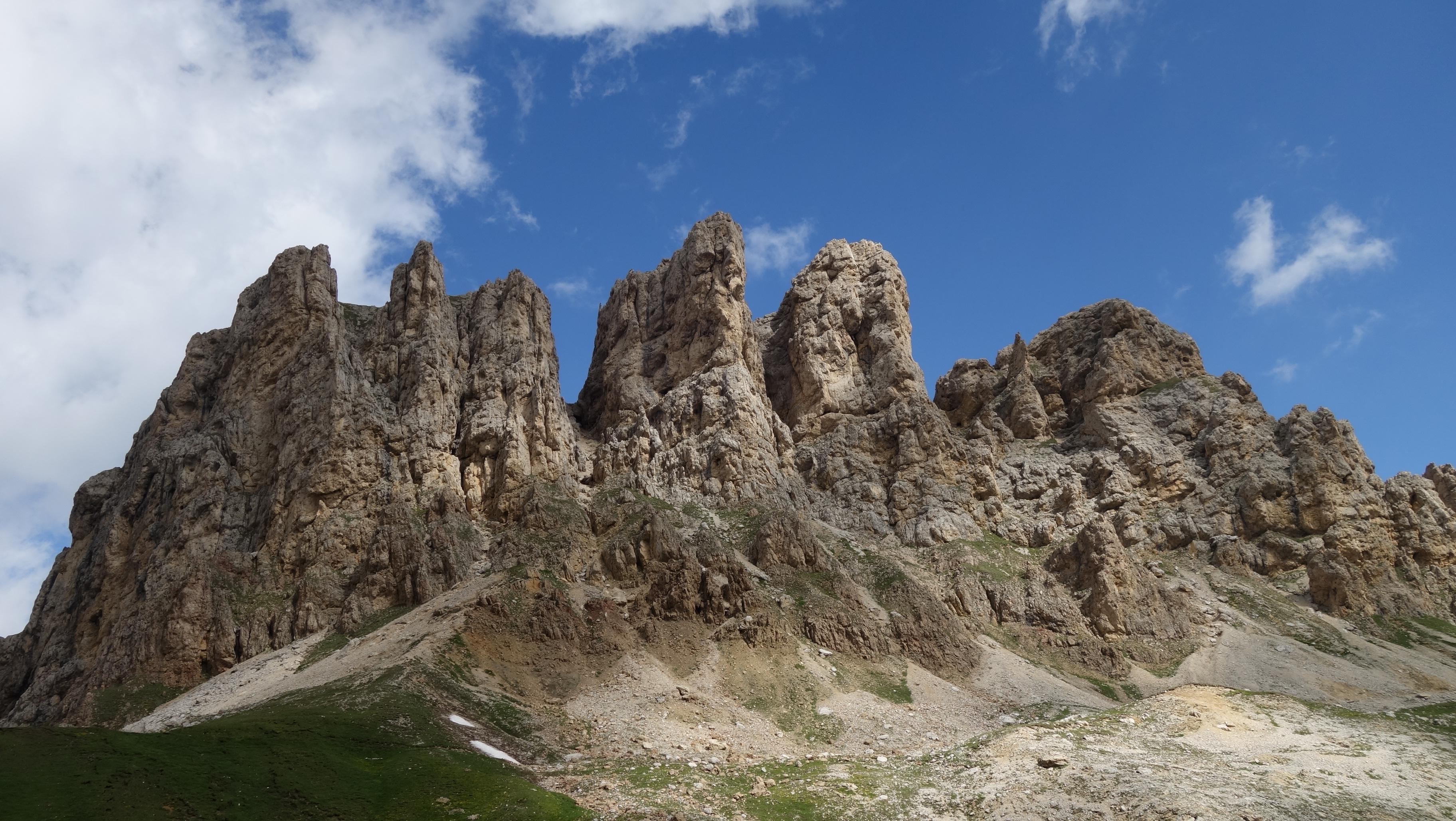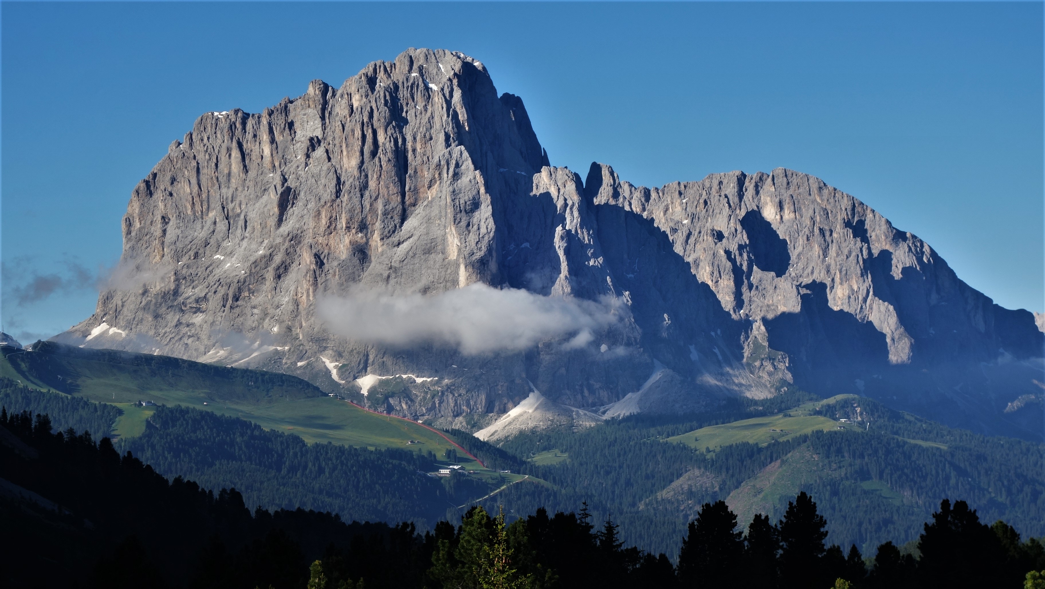 Am nächsten Morgen ging es dann von der Plattkofelhütte (Rifugio Sasso Piatto) relativ flach über das Mahlknechtjoch zur Tierser Alp Hütte als Start des 4. Tages (ATG3-21). Dann erfolgt der Aufstieg zum Molignonpass durch den Catinaccio Kessel zur Grasleitenpasshütte und hinunter zur Unterkunft in der Vajolethütte. Die ersten 2 Stunden geht es flach auf gleicher Höhe an Ausgrabungen, Wiesenwegen mit Blumen zur Tierser Alp Hütte. Dann schließt sich ein steiler Anstieg an, der am Molignonpass endet. Nun kann man - nach den verzogenen Nebelwolken - einen fantastischen Blick in den Catinaccio Kessel genießen. Mehrere Schneefelder sind zu durchschreiten, die Spur ist gut und relativ flach gehalten - unglaublich: der Abschnitt wird auch als Ultra Marathon Strecke genutzt. Am Ende wird die Grasleitenpasshütte hinter dem Pass erreicht. Es ist wirklich eine abwechslungsreiche Route, die dann noch zur CAI Hütte Rifugio Vajolet führt.