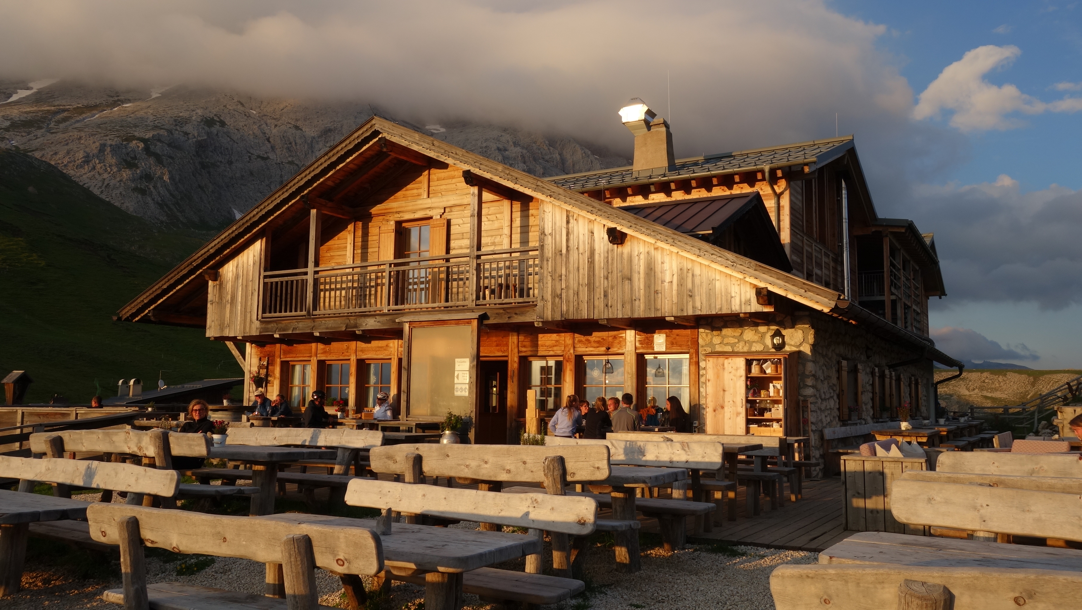 3. Tag (ATG3-20). Vom Rifugio Firenze (Regensburger Hütte) mit der Unterstützung von 2 Seilbahnen (Col Raiser, und Monte Pana/ Seggiova -Bergbahn) ist diese Strecke über die Langkofelhütte zur Plattkofelhütte unter 7 Stunden zu begehen. Dieser Bereich ist durch die Infrastruktur auch gut von weiteren wandernden Personen besucht. Dafür bietet sich aber eine super 360 ° Sicht oben an der Plattkofelhütte und auf den Wiesen begegnet man Pferden, Eseln und Schweinen. Es ist eine entspannte, zum "Naturbaden" einladende Etappe.