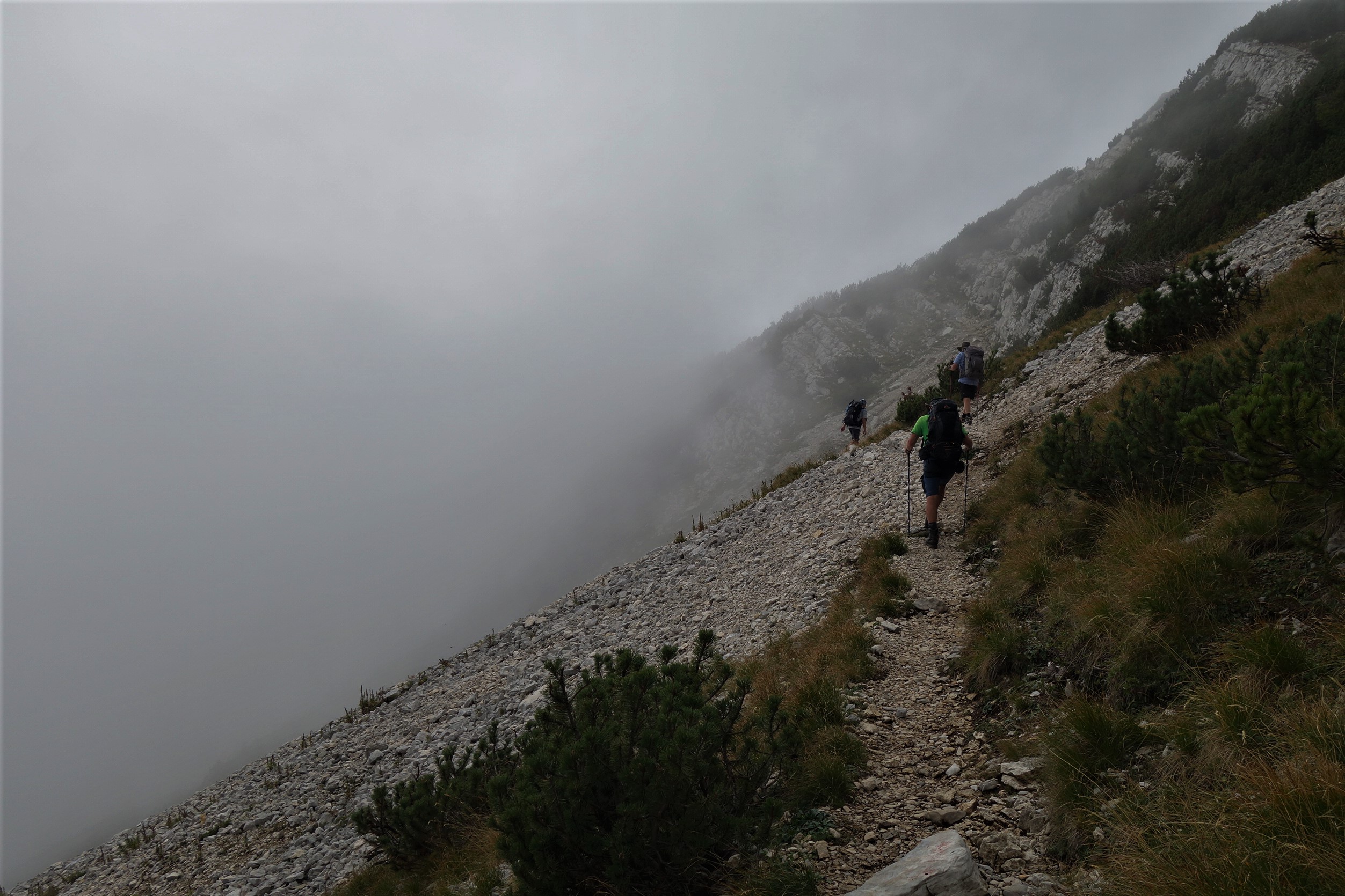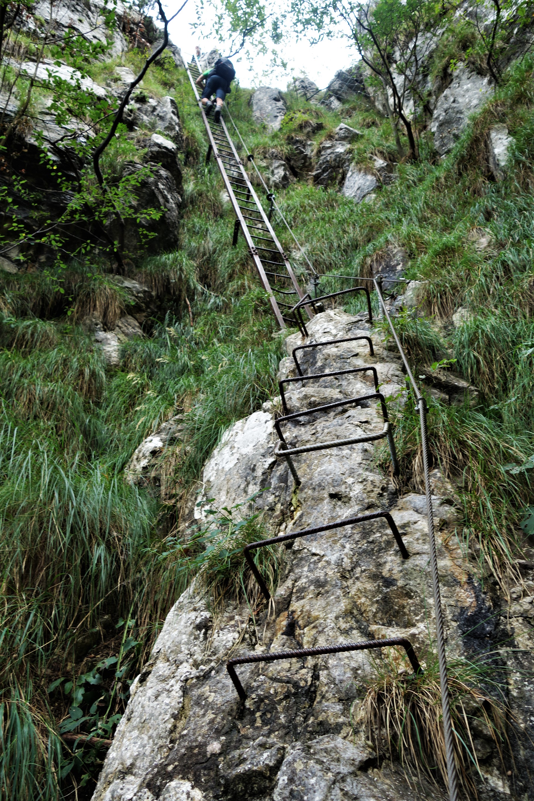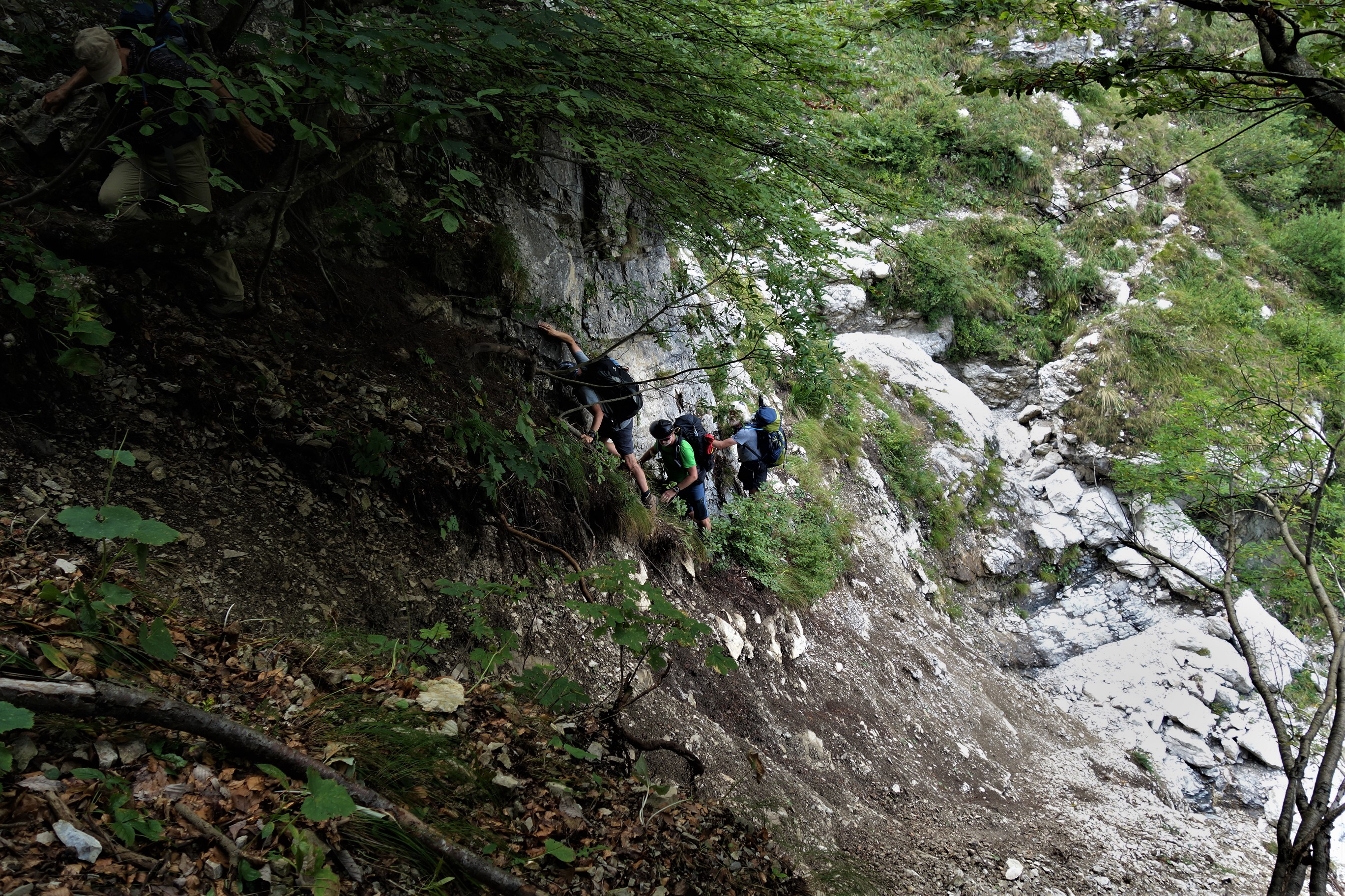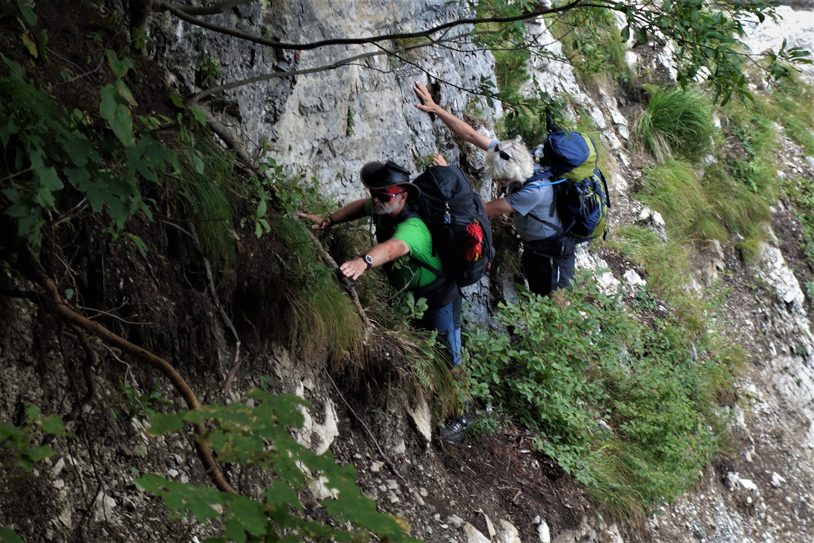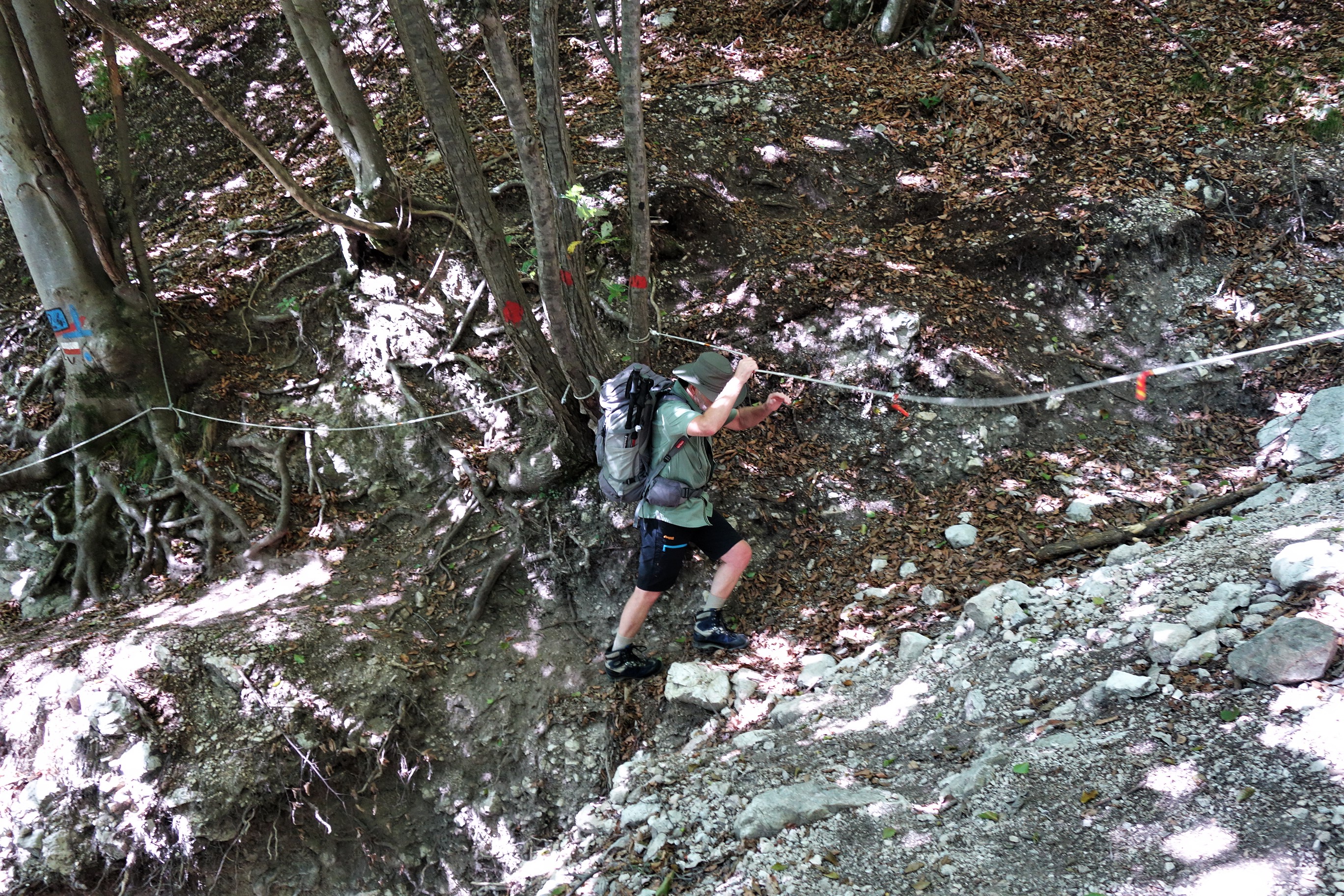 Diese 8. Etappe (ATG4-35) von Tenno See zum Rifugio „Bocca Di Trat Nino Pernici“ hatte wieder eine Besonderheit auf dem Weg 445 parat. Am Anfang stand ein Schild: „Sentiero per escursonisti esperti“, „Wanderweg für Wanderexperten“ als eine kleine Indikation, was uns erwarten würde. Ein langer gerader Aufstieg unter Bäumen auf Waldwegen hatte am Anfang Vertrauen für diesen Weg geschaffen. Die Beschaffenheit dieser Strecke war angenehm, wenige Wanderer, eher Trail Runner waren in dieser stillen Region anzutreffen. Nach einem Drittel des Weges folgten wir einem Hangwiesenweg von einer Breite von einem schmalen Schuh, zugewachsen von Ginster und Jungbuchen, sollte das die Warnung für den Wanderexperten sein? Die Kartenwegangabe bezeichnete diesen Abschnitt mit T3. Nun trafen wir auf den einzigen Wanderer, der uns entgegen kam mit der Anmerkung: „Brutale“. Dann war es soweit: an einer Bachschneise waren Wegmarkierungen zu finden, jedoch der Weg nicht mehr und der Aufstieg hier von 3 -5 m war nur zu erahnen. Mit Hilfe von abgestorben Bäumen und Ästen, die als Aufstiegshilfe nutzbar waren, war diese Stelle nur zu überwinden. Nun war der Begriff „Sentiero per escursonisti esperti“ auch für uns deutlich geworden. Der Karteneintrag T3 ist somit nicht korrekt. An dieser Stelle fehlen hier die Seilsicherung und Eisen im Fels. Das Problem was sich hier versteckt ist der fehlende Wegewart in der Sektion SAT Trentino. Die Schilder sind mit dem Auto an beiden Seiten schnell installiert, jedoch ist die Interpretation nicht überall bekannt. Es gibt mehre Wege mit dieser Kennung im Gebiet der Sektion Trentino. Wir hoffen, dass sich hier bald ein Wegewart finden lässt. Fazit: Bei diesem Weg 445 mehr Zeit einplanen! Das Rifugio „Bocca Di Trat Nino Pernici“ ist eine ehemalige Kaserne und hält einige Militärfunde als Dekoration im Haus bereit.