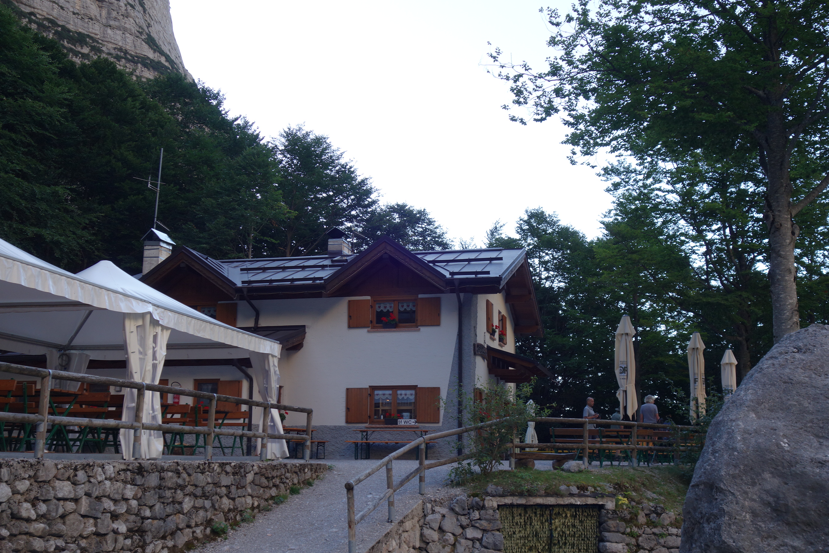 3. Tag (ATG4-30). Vom Rifugio Croz dell'Altissimo geht es nach kurzer Zeit bereits zum 2. Frühstück auf dem Rifugio Selvata. Der Weg verläuft überwiegend im Wald und ist somit auch schattig, dafür aber mit Waldlücken versehen für das Betrachten der Bergpanoramen. Kurz vor dem Rifugio Tommaso Petrotti wird die Wegführung wieder anspruchsvoll, auch durch Seile gesichert. Diese Hütte dient den Klettersteig-gehenden für die vielen Touren in der Umgebung. Wir staunen über die mächtige Anzahl von Wespen auf dieser Höhe von 2500 hm. Ein kleiner Ausflug zur Bocca di Brenta (2552 m)mit dem Blick auf den Ortler ergänzt den Tag.