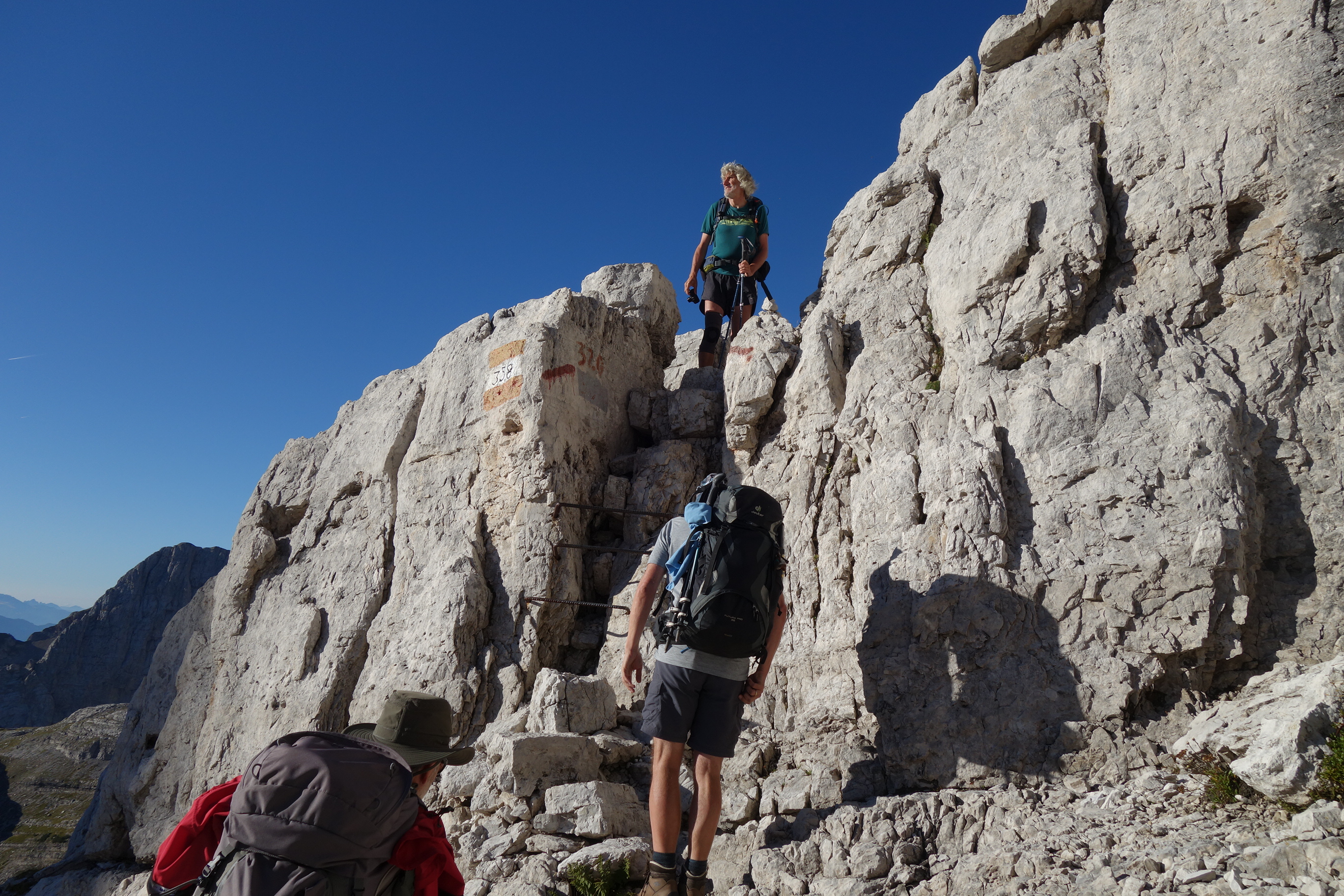 4. Tagesetappe (ATG4-31). Ein „Hamburger Gate“ für Wandernde eröffnet diese Tagestour zum Rifugio Cacciatore. Junge Pfadfinder pausieren in der Bocca Cacciatore über eine längere Zeit, was bei dem Bergpanorama gut zu verstehen ist. Leider begegnen wir einer Hundehalterin, die die Kontrolle über ihren Hund nicht hatte, und wir erschrecken uns bei der Begegnung Auge in Auge mit dem Hund. Murmeltierpfeifen wird mit lautem Hundegebell beantwortet, neue Geräusche in den Bergen. Auf der Rifugio Val D' Ambiez - Silvio Agostini ist eine schmackhafte Einkehr zu empfehlen. Gämse und Murmeltiere, sowie das pure Brenta Bergpanorama zeichnen dieses Klettersteigparadies aus.