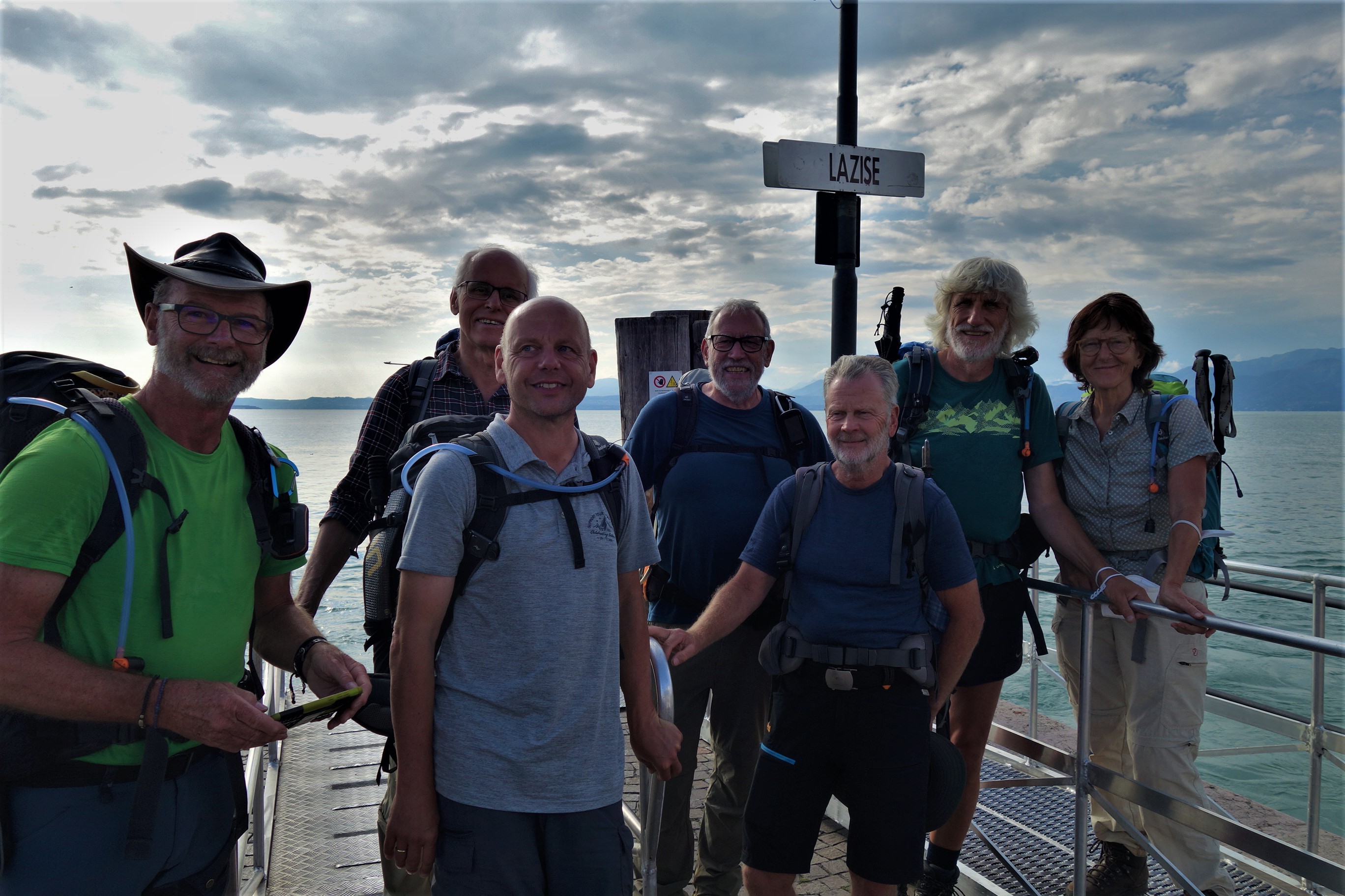 Die 11. Etappe beginnt in Prada Alta und endet dann in Lazise, dem Zielort. Der direkte Weg wäre die Straße. Wir gehen aber einen Wanderweg über Wiesen und Weiden im offenen Gelände. Ab hier sind Kuhglocken zu hören, Eselherden säumen den Weg. Weidezäune müssen mit Hilfe von aufgestellten Leitern überwunden werden, was aber zu dem Weg gehört. An einer Stelle ist eine Wegsperre aus Moniereisengitter zu überwinden, die aber auch in den Karten vermerkt ist. Rechts daneben rutscht man unterdurch oder man geklettert darüber, was noch ein letztes Mal den alpinen Charakter dieser Etappe verdeutlicht. Ein Bus von Costermano kann die letzte 5 km Asphalt bis zur Schiffanlegestelle in Garda ersetzen. Der Küstenweg von Garda nach Lazise wird von sehr vielen E-Bikern und Badegästen genutzt, was dem Wandern abträglich ist. Ersatzweise geht ein Schiff von Garda nach Lazise, wo sich am Ausgang des Hafenbeckens die Kommunale Verwaltungsstelle befindet und damit diese „Alpen Traverse Gemellato“ (Partnerstadt) vollendet ist.