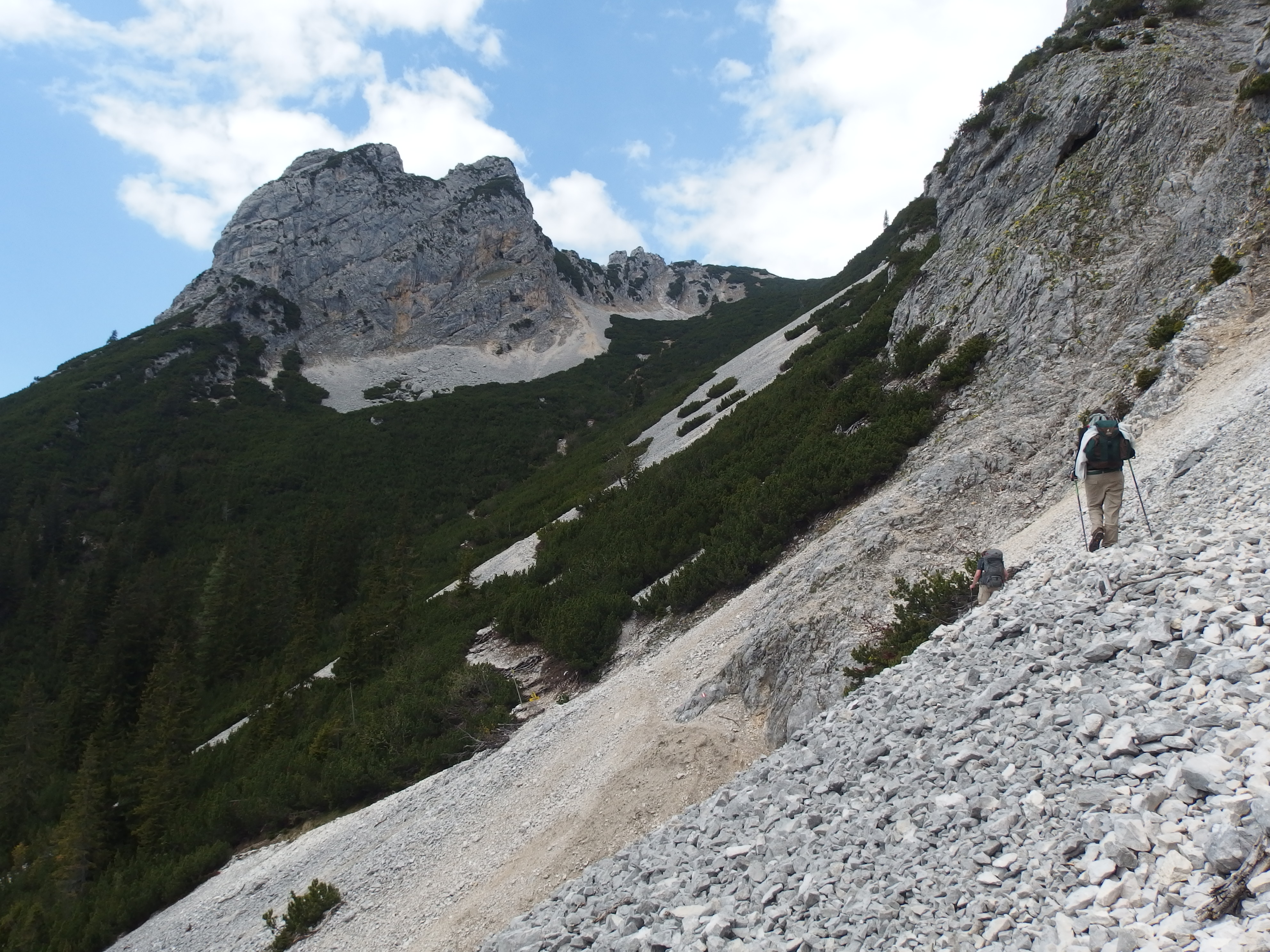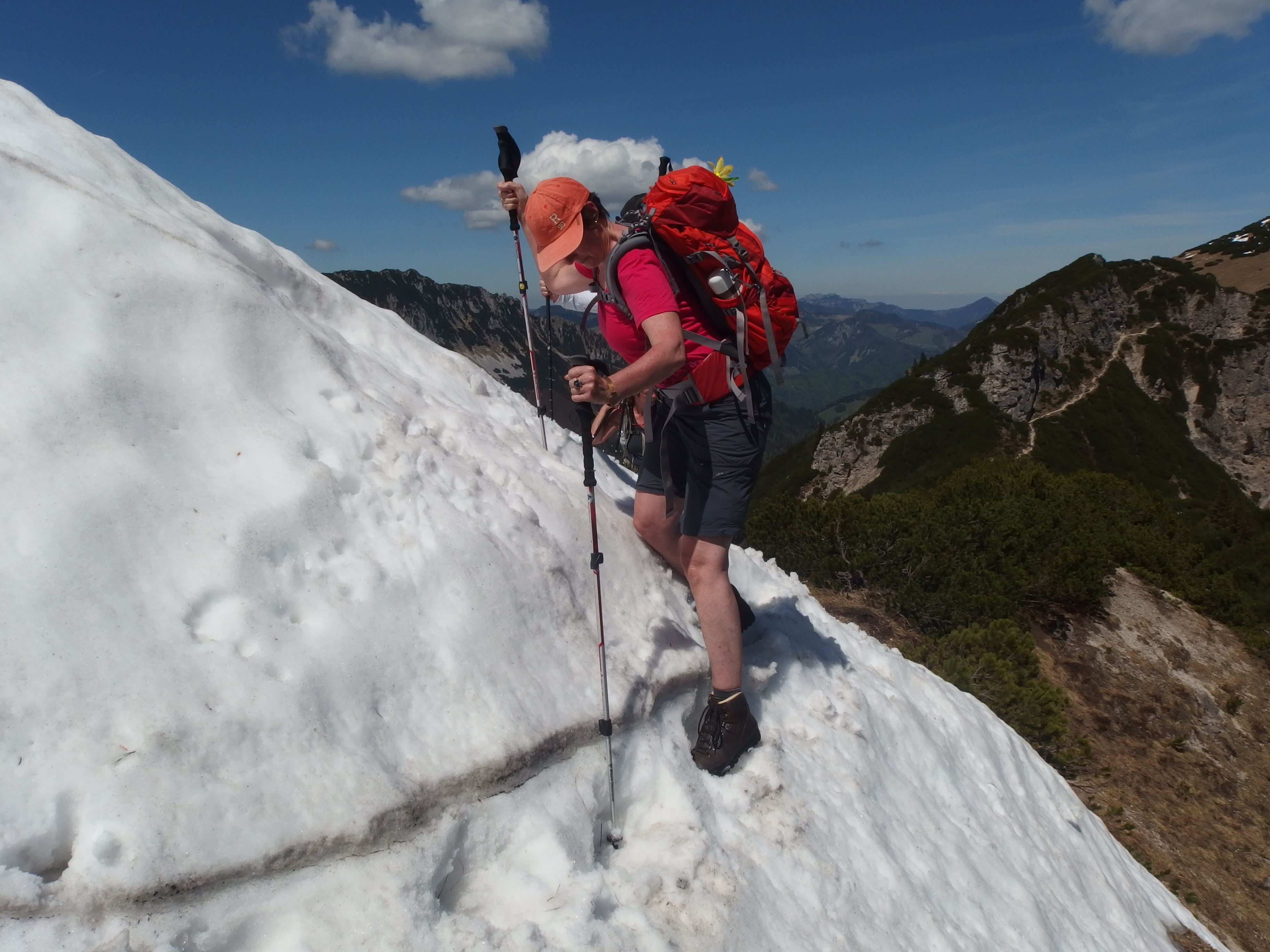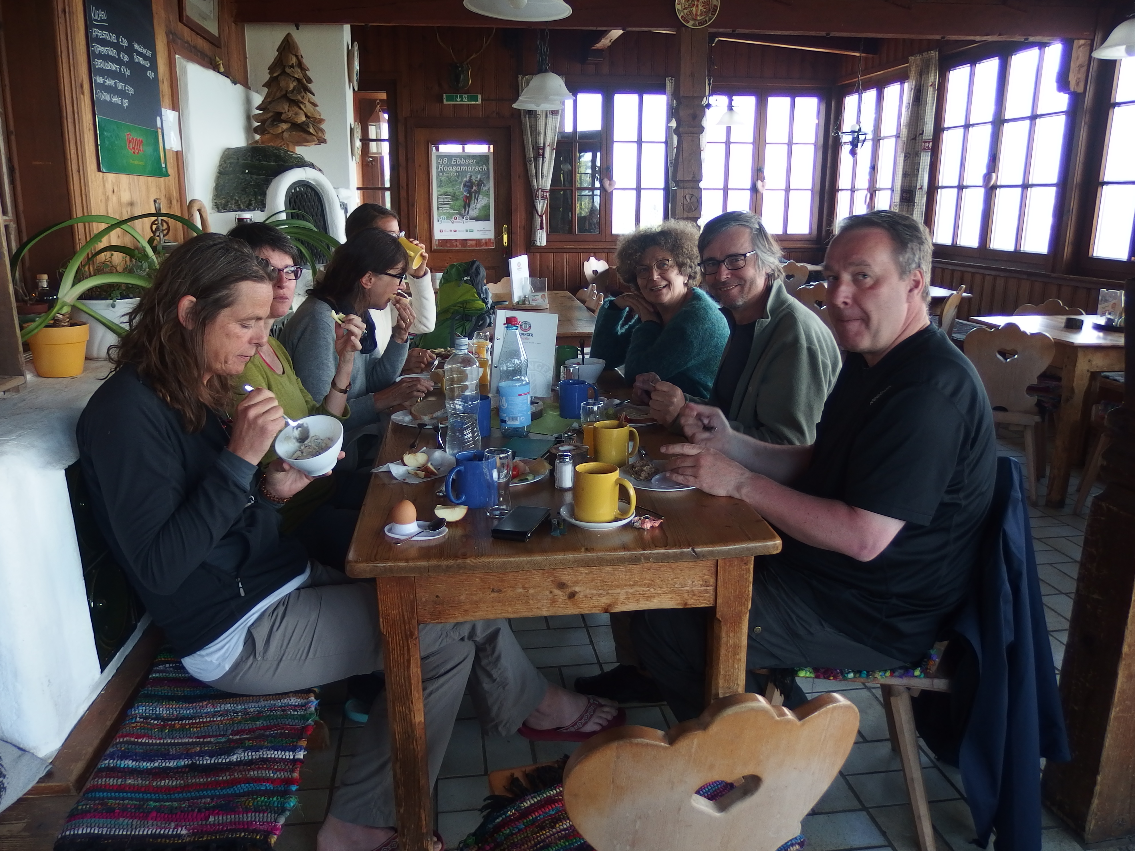 Donnerstag soll die längste Tour werden. Über den Feldalmsattel verlassen wir den Wilden Kaiser, um auf halber Höhe dem Zahmen Kaiser entlang zu wandern. Auch hier noch letzte Schneefelder, die vorsichtig überwunden werden müssen. Und auch Geröll erfordert unsere volle Aufmerksamkeit. Aber alle halten wacker durch, niemand macht schlapp. Diese letzte gemeinsame Etappe endet in der Vorderkaiserfeldenhütte. Unsere bisherigen ausgesprochen guten Erfahrungen bekommen hier dann doch einen Dämpfer. Freiwillig wollen wir auch mal die Erfahrung eines Matratzenlagers machen. Wir waren ja nur zu acht, aber die Vorstellung, hier im Sommer vielleicht auf extrem engen Raum unter dem Dach mit gut vierzig Leuten zu liegen, ist eher gruselig. Auch das Essen war wenig überzeugend! Der Blick auf Kufstein und Inntal ist jedoch traumhaft. Schön auch der liebevoll angelegte Alpengarten, der in Zusammenarbeit mit der Uni München die Flora der Alpen zeigt. Ein letztes Mal „Mäxle“ am Abend, ein letztes gemeinsames Frühstück am nächsten Morgen und dann trennen sich unsere Wege.