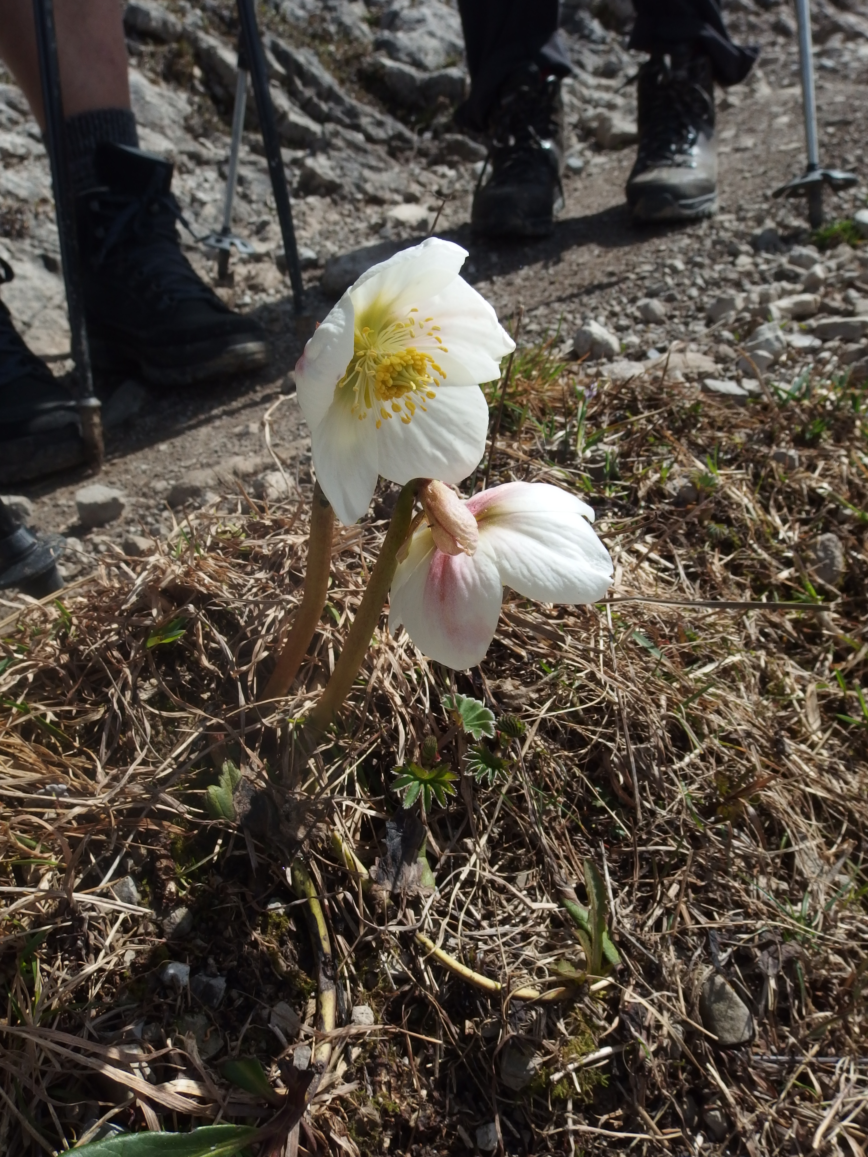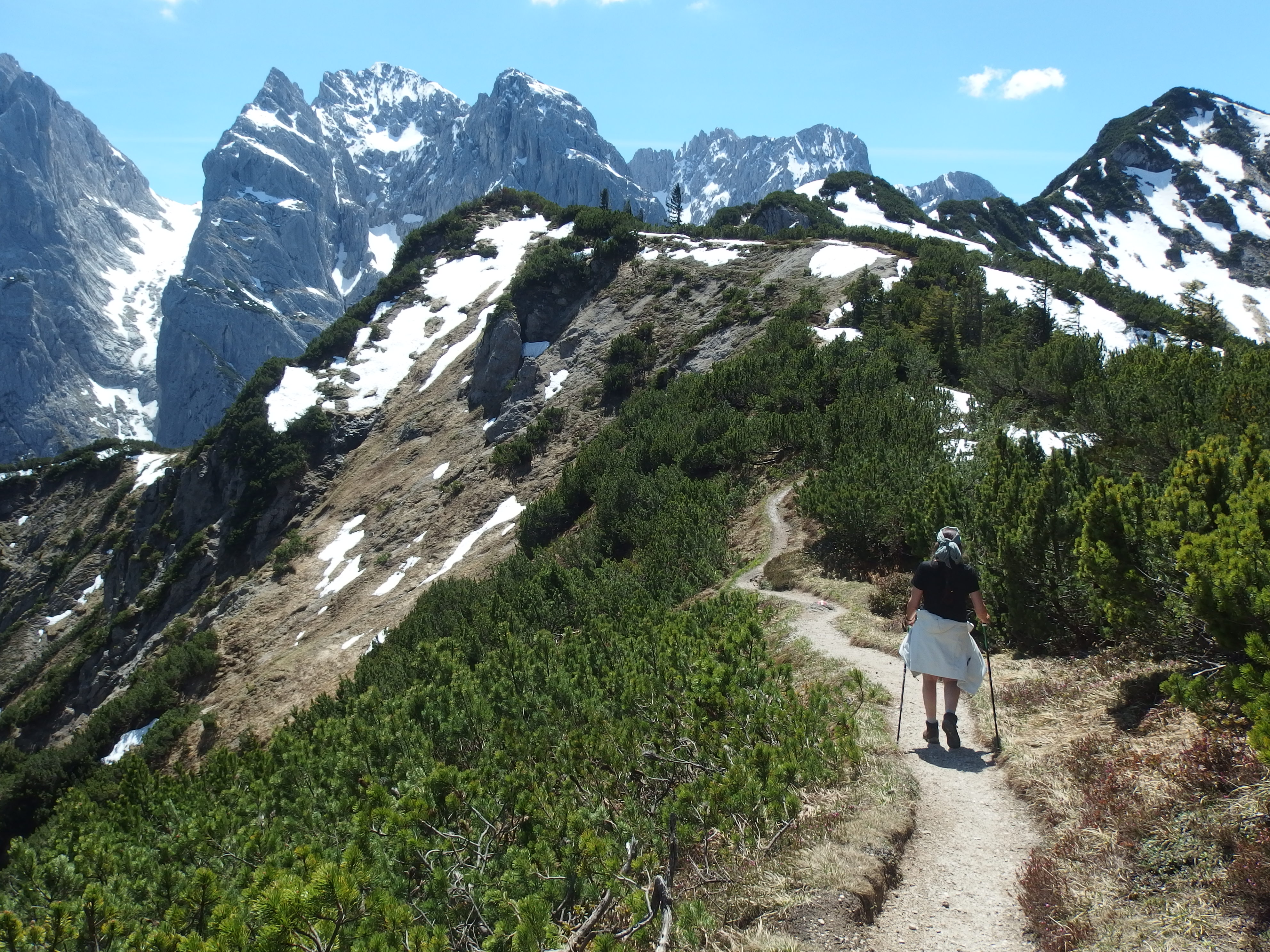 Kufstein, Sonntagmorgen. Es ist noch früh und es ist ziemlich frisch. Die Seilbahn bringt uns zum Brentenjoch, um halb zehn ist dort oben der Treffpunkt für unsere sechstägige Hüttenwanderung im Kaisergebirge. Alle sind (fast) pünktlich und wir erkennen uns wieder, hatten wir uns doch einige Wochen vorher zu einem Vorbereitungstreffen zum ersten Mal gesehen. Auf dem Adlerweg geht es gemütlich zur Kaindlhütte, nach eineinhalb Stunden beziehen wir unser erstes Quartier. Die Saison hat gerade begonnen, vor kurzem lag hier noch Schnee. Wir haben komfortable Zimmer mit frischbezogenen, kuschelig warmen Decken. Nachmittags machen wir noch eine Tour zur Walleralm, zum Einlaufen und Warmwerden, über Almen mit Tausenden von Christrosen, die nur hier wild wachsen.