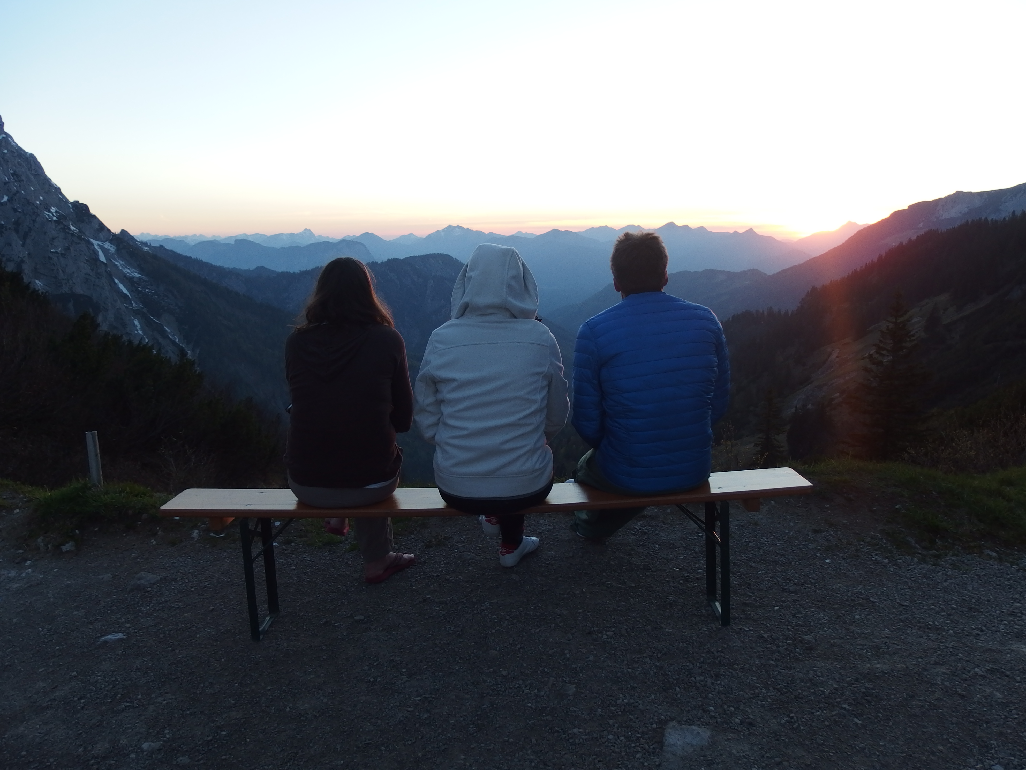 Am nächsten Tag machen wir uns auf zum 340m höher gelegenen Feldberg. Es gibt noch Schneefelder, die wir überwinden müssen, aufregend und schön. Auf dem Gipfel schmeckt ein wunderbares Picknick und der Blick in das Voralpenland ist grandios, der ferne Chiemsee glänzt silbern in der Sonne.