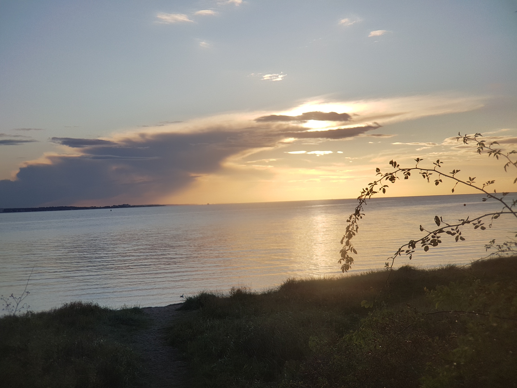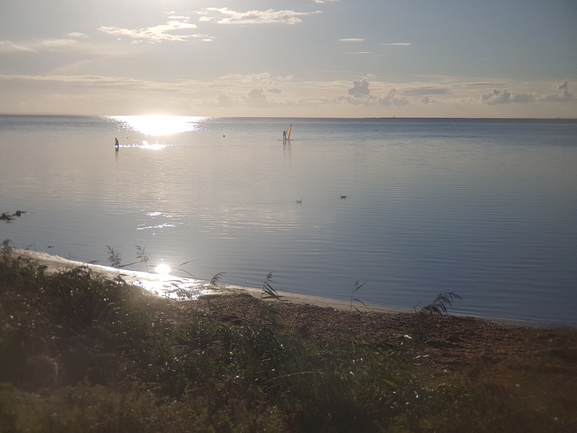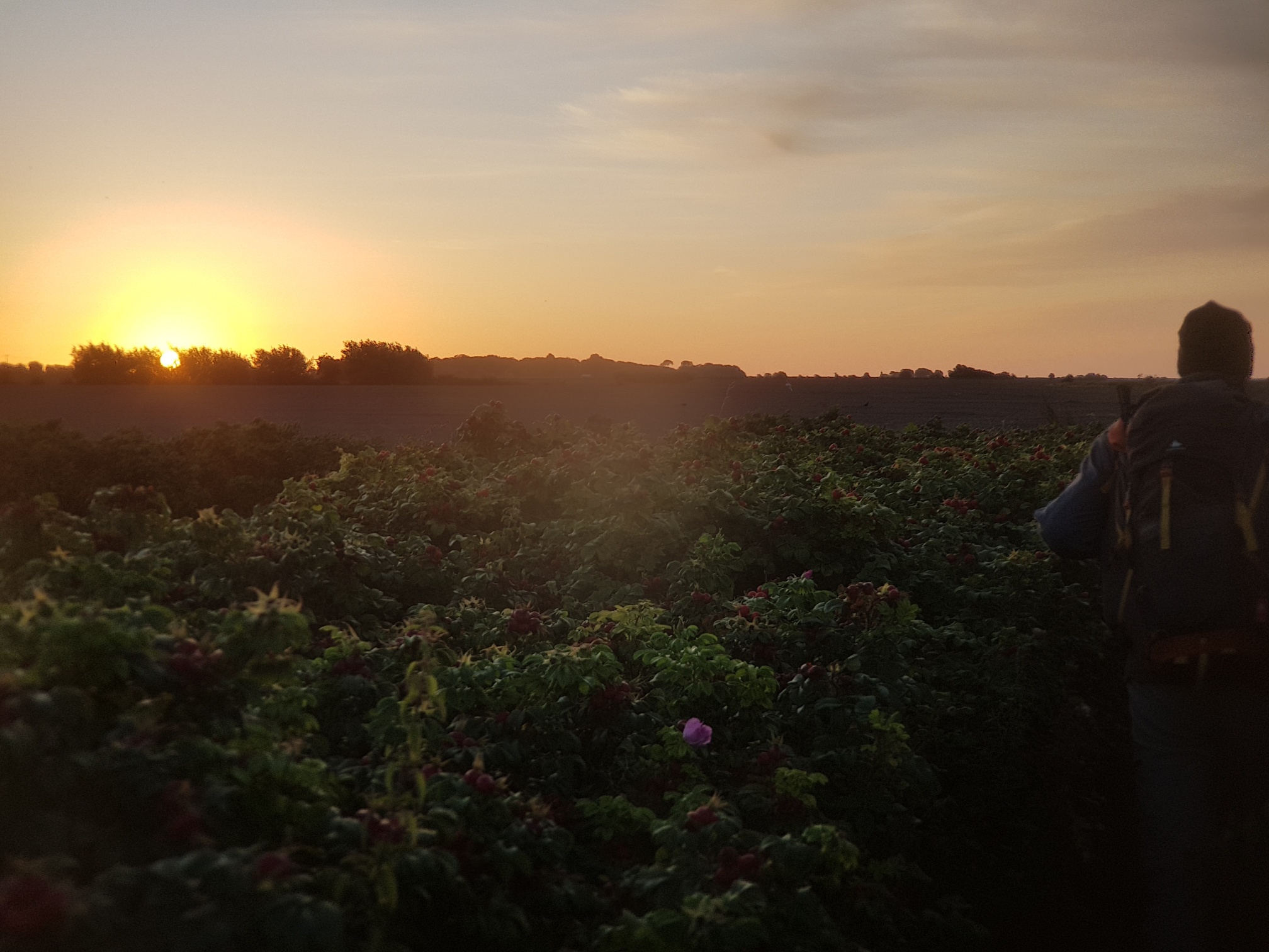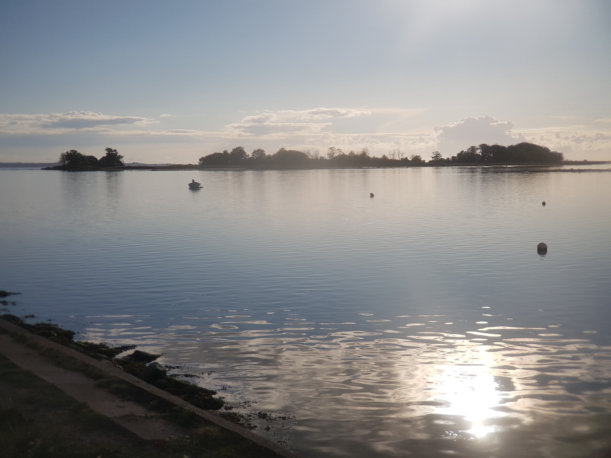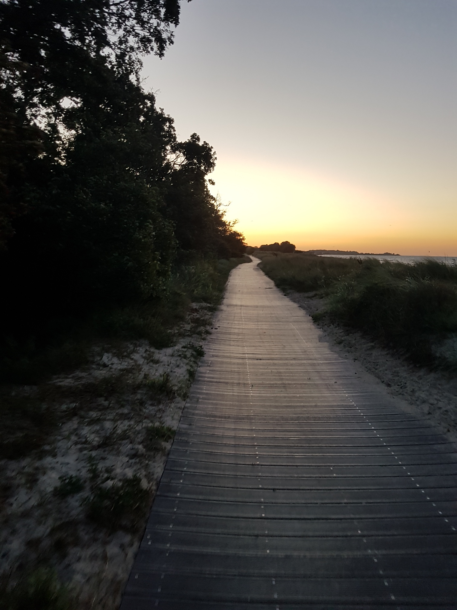 Acht Wanderer starten in die Morgendämmerung in die 68 km Fehmarnumrundung. Vorbei am Sahrensdorfer Binnensee(**Foto) und an den Hochhäusern vom Südstrand vorbei kommen wir auf dem Bohlenweg an der Südküste zügig voran. Kurz vor dem Staberhuk als östlichstem Punkt unserer Runde scheint uns die Sonne ins Gesicht. Typisch Fehmarn: Die ist gerade über einem Kohlfeld aufgegangen.