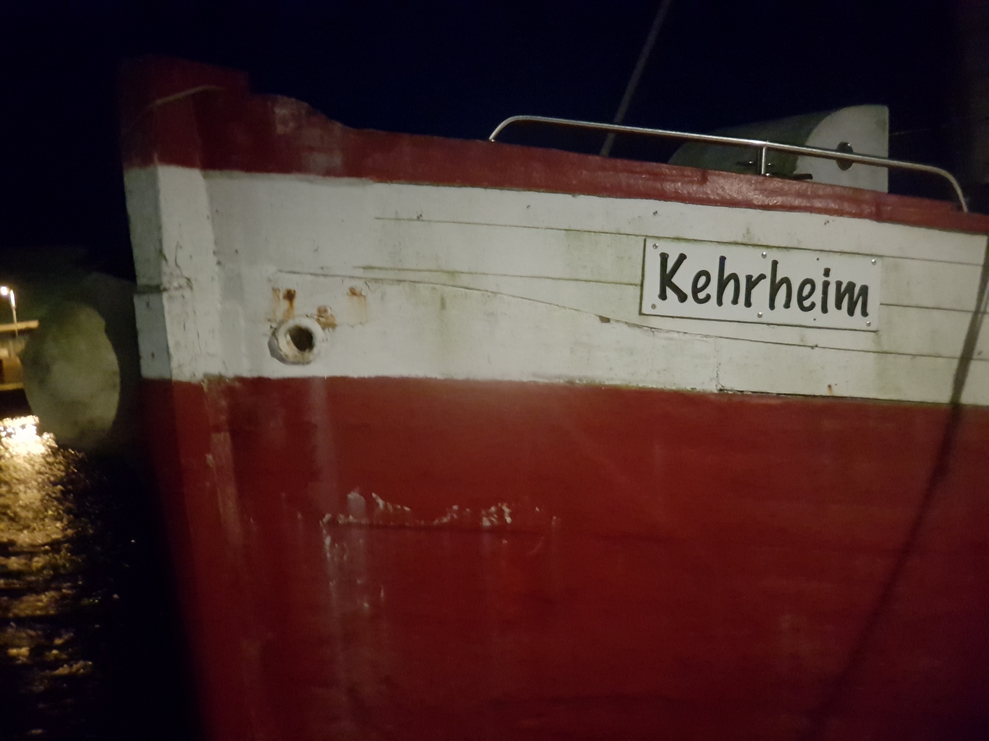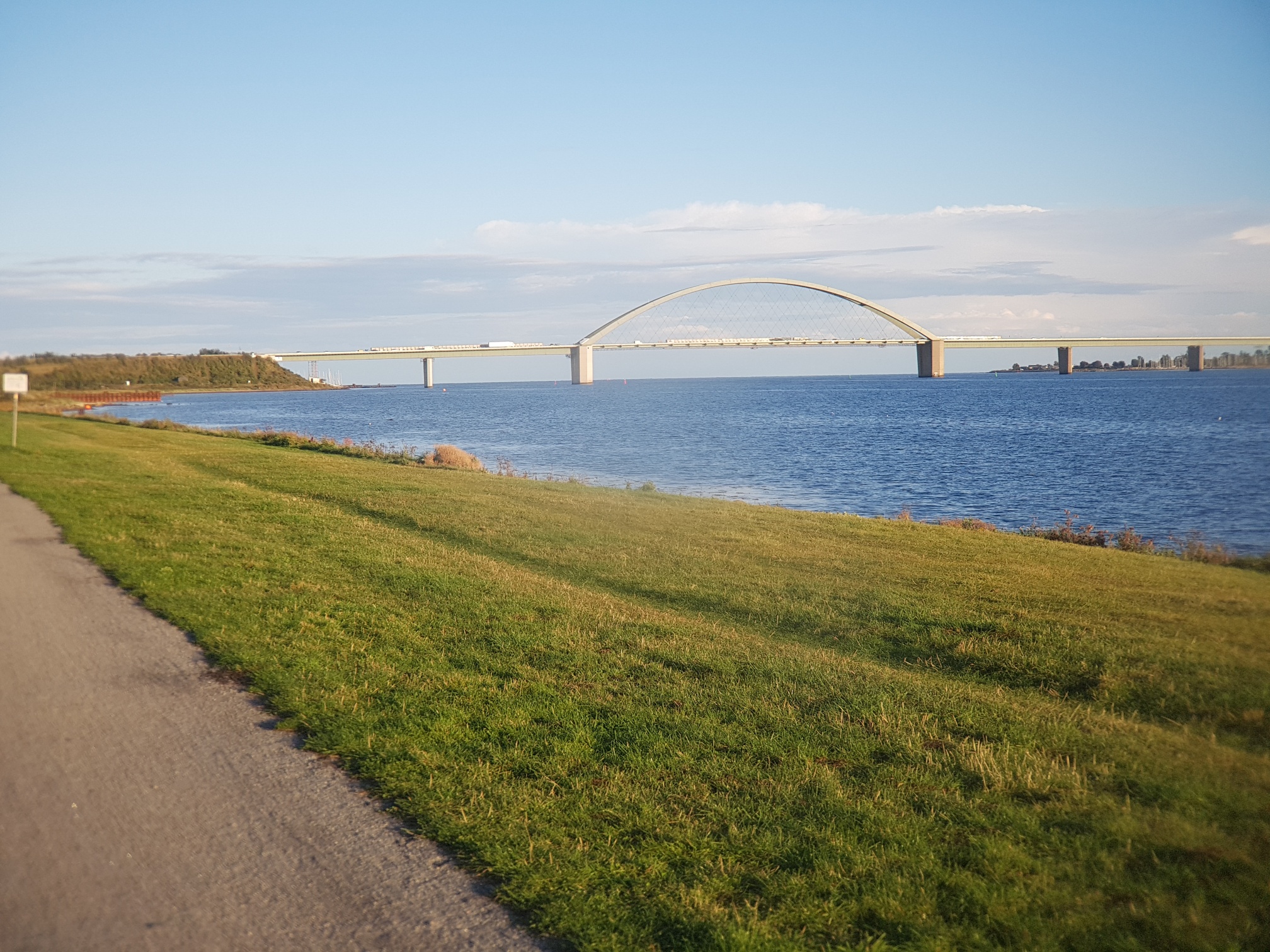 Ein erster Blick auf die Fehmarnsundbrücke kündigt die letzte Etappe unserer Rundwanderung an. Die Sonne steht inzwischen tief im Westen. Als wir nach einer letzten kurzen Pause die Brücke bei etwa km 60 unterqueren, können wir noch die Sonnenuntergangsstimmung genießen. Gegen 20:45 erreichen wir den Hafen von Burgstaaken wieder. Der Bootsname „Kehrheim“ im Hafen scheint dazu passend.