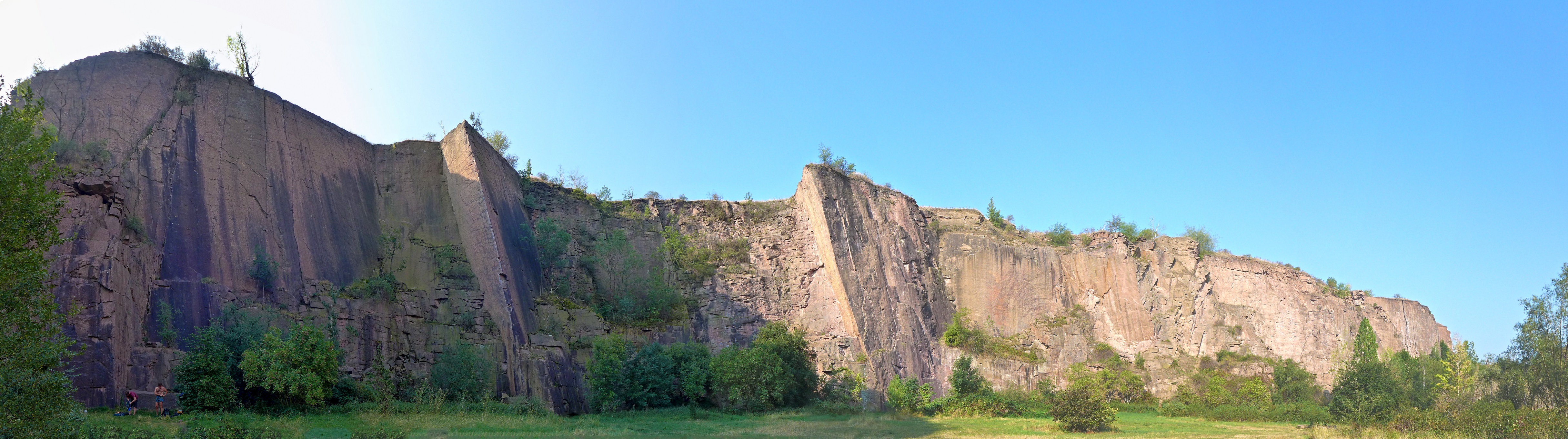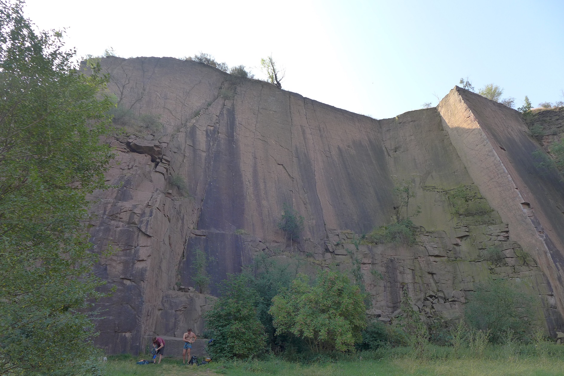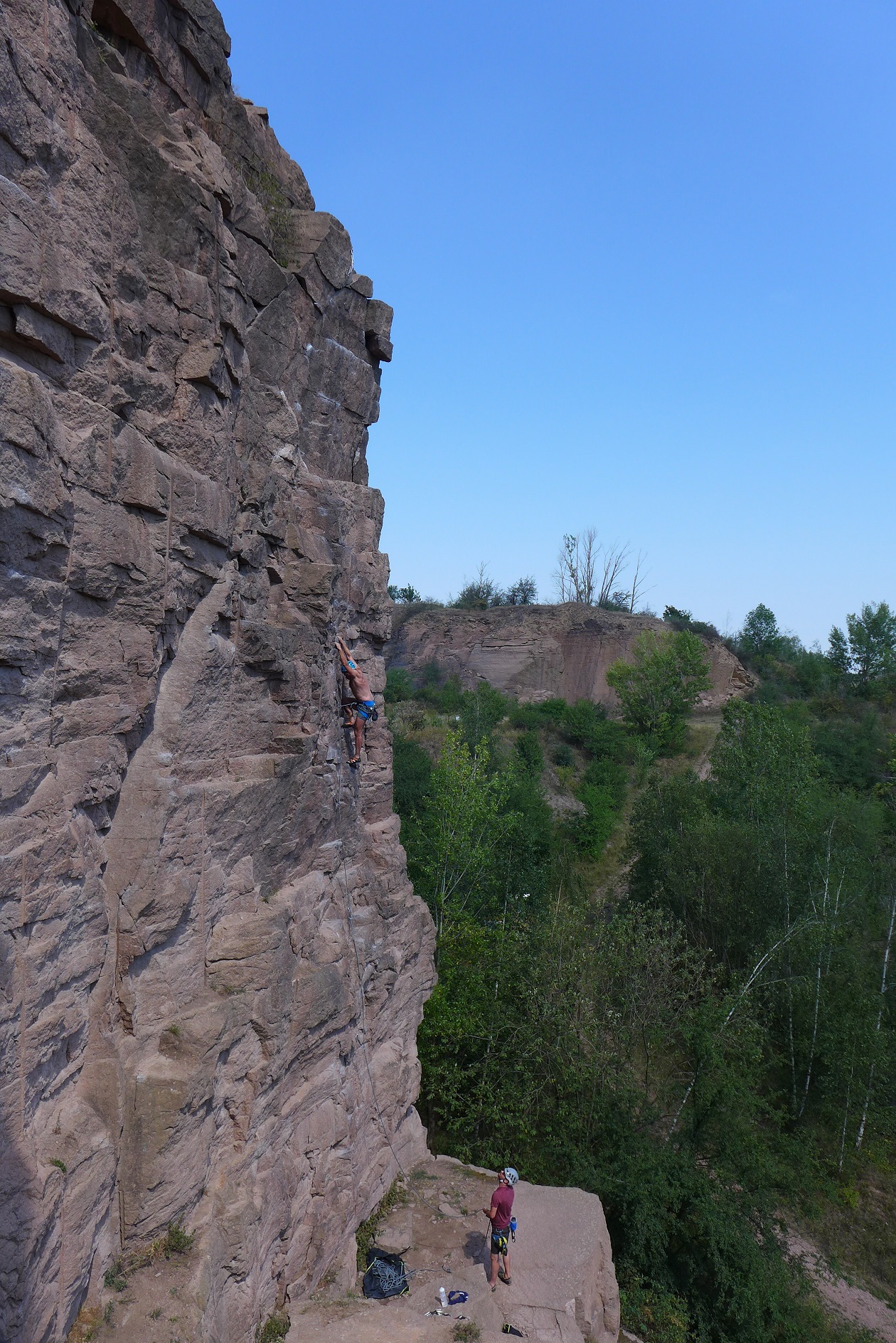 Der Regen hatte gute Arbeit geleistet – wir waren alleine in der großen Kletterarena. Das ansonsten rotgelbe Phorophyrgestein war grau vor Nässe. Nur wenige der ca. 200 eingebohrten Touren leuchteten trocken vor uns auf – die waren zumeist überhängend und damit zum Aufwärmen wenig geeignet. Im Sektor Altherrenwand fanden wir dann doch noch leidlich trockne Einstiegstouren und es ging los. Der Fels ist geprägt durch Leisten und gute Reibung. Die meisten Touren sind brauchbar gesichert – der erste Bohrhaken ist allerdings oft hoch gesetzt, so dass die mitgebrachten Klemmgeräte auch zum Einsatz kamen. Einige Touren scheinen nach der Erstbegehung keine weiteren künstlichen Absicherungen erhalten zu haben und sind entsprechend ernst. Überhaupt ist die Schwierigkeitsbewertung dort konservativ. Wer nur auf Schwierigkeit klettern möchte, um eine Zahl zu erreichen, sollte woanders hinfahren. In Löbejün ist ein Sechser auch ein Sechser wie er früher einmal war – keine Inflation. Das ist auch gut so.