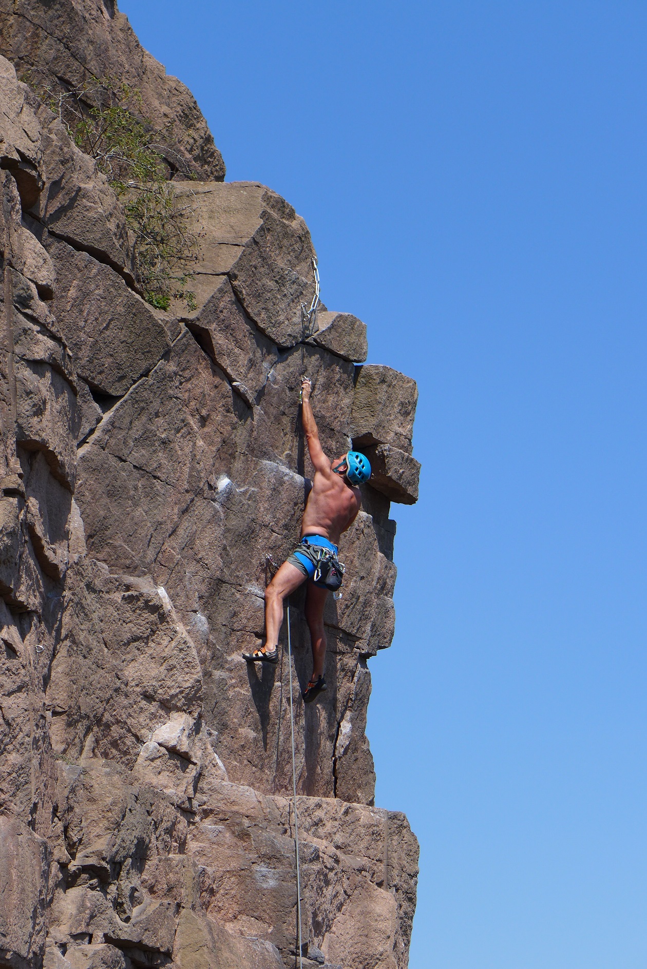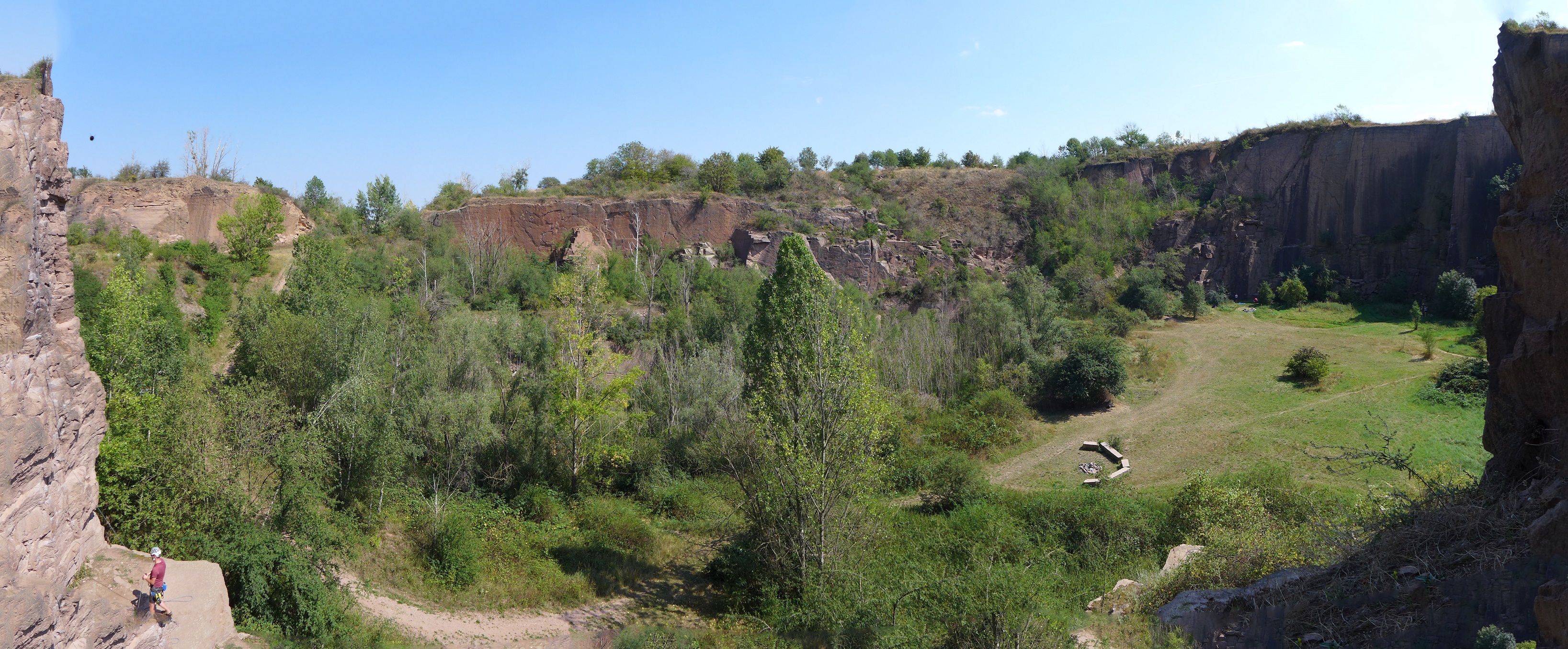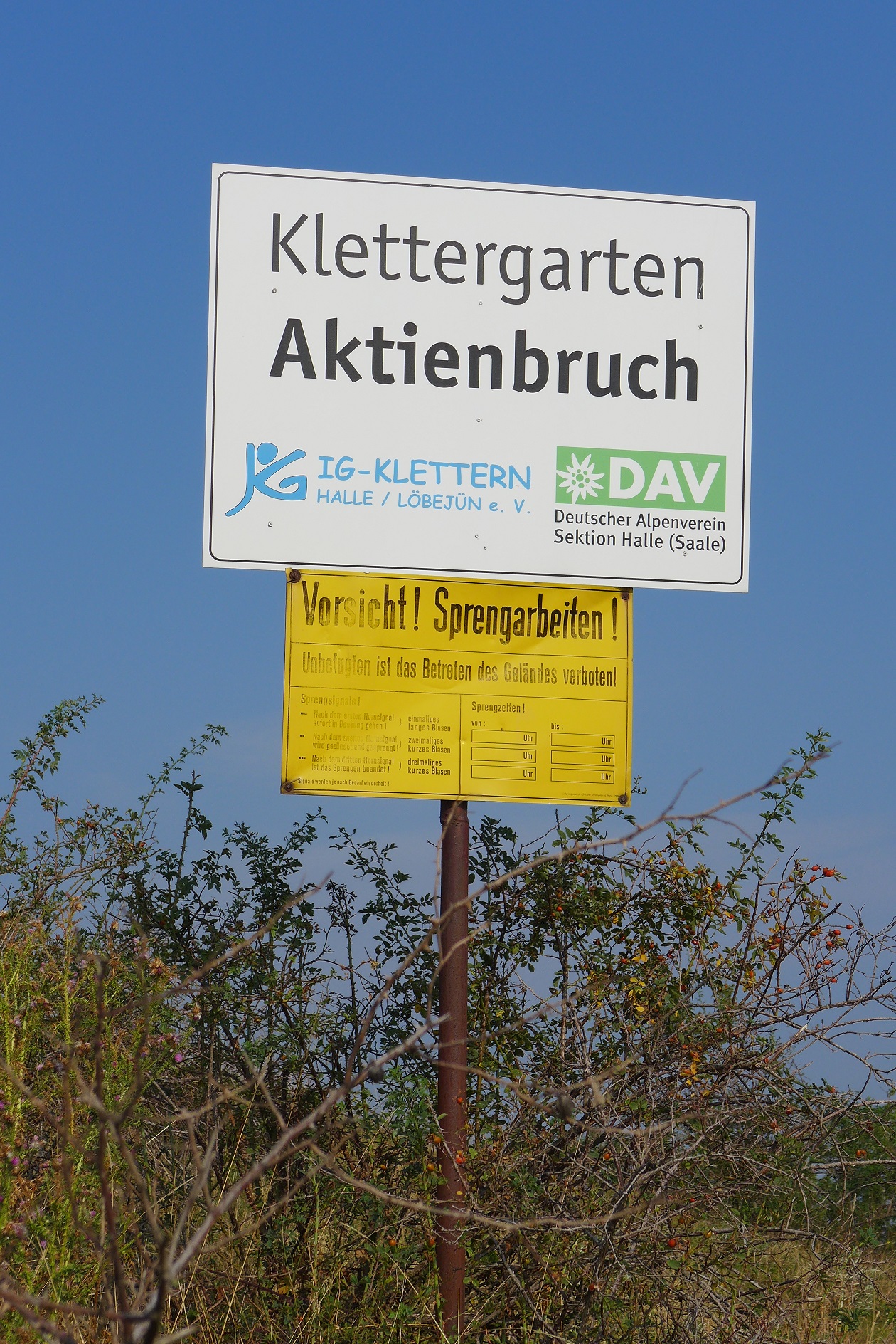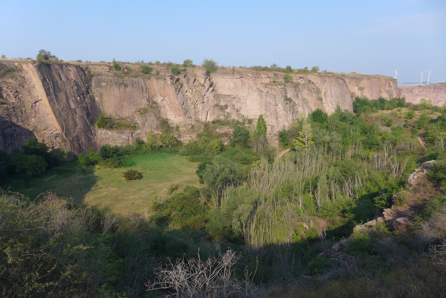 Der Regen hatte gute Arbeit geleistet – wir waren alleine in der großen Kletterarena. Das ansonsten rotgelbe Phorophyrgestein war grau vor Nässe. Nur wenige der ca. 200 eingebohrten Touren leuchteten trocken vor uns auf – die waren zumeist überhängend und damit zum Aufwärmen wenig geeignet. Im Sektor Altherrenwand fanden wir dann doch noch leidlich trockne Einstiegstouren und es ging los. Der Fels ist geprägt durch Leisten und gute Reibung. Die meisten Touren sind brauchbar gesichert – der erste Bohrhaken ist allerdings oft hoch gesetzt, so dass die mitgebrachten Klemmgeräte auch zum Einsatz kamen. Einige Touren scheinen nach der Erstbegehung keine weiteren künstlichen Absicherungen erhalten zu haben und sind entsprechend ernst. Überhaupt ist die Schwierigkeitsbewertung dort konservativ. Wer nur auf Schwierigkeit klettern möchte, um eine Zahl zu erreichen, sollte woanders hinfahren. In Löbejün ist ein Sechser auch ein Sechser wie er früher einmal war – keine Inflation. Das ist auch gut so.
