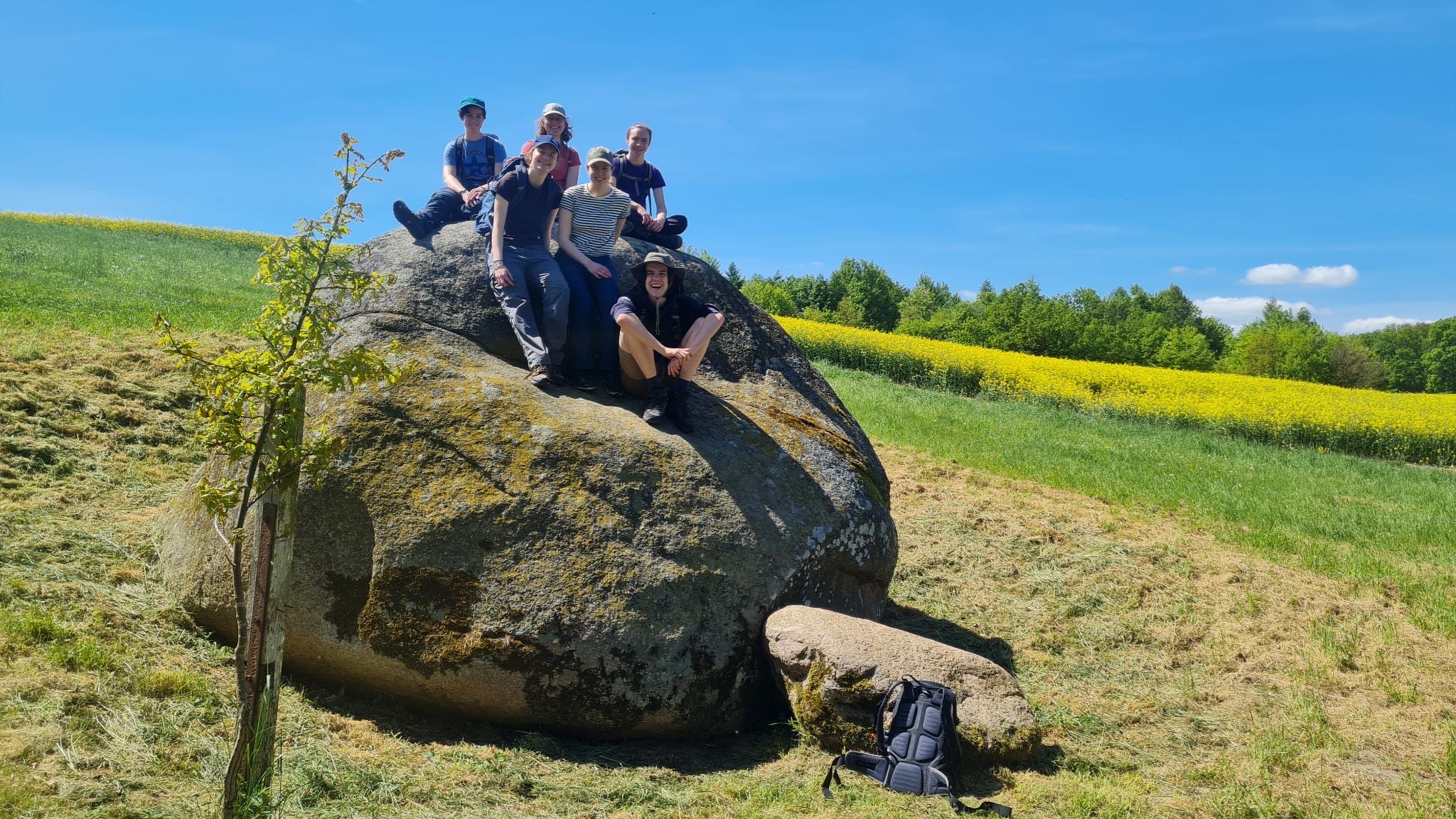Der letzte Tag, Sonntag, den 12.5.24, startete für die meisten der Gruppe um 7.25 Uhr mit Beethovens Musik als Wecker. So konnte der Tag ja nur gut werden! Frühstück gab es mit Rührei und zum ersten Mal auch mit Brötchen - lecker! Sodass die Truppe sich um 10:00 Uhr auf zum höchsten Gipfel Brandenburgs machen konnte. Den Kutschenberg, der mit seinen 201 m. ü. NN. der höchste Berg dieser Ausfahrt war. Dort bestiegen am Ende die mutigsten Gipfelstürmer sogar den säulenartigen Gipfelstein. Nur mithilfe eines Kompasses ging es anschließend wieder zurück zum Jugendbus. Nachdem ein Teil der Gipfelstürmer (die quasi Eltern) beim Campingplatz ausgeladen wurde, um dort weiter Urlaub zu machen, machte sich der Rest auf den Weg zurück nach Hamburg. Zwischendurch gab es die traditionelle und allseits geliebte Snacktime und die Fahrt wurde durch klassische Musik und deutsche Pop-Hits versüßt. Endlich wieder zu Hause angekommen, wurde nur noch schnell alles ausgeladen, bevor man sich auch schon wieder verabschieden musste.