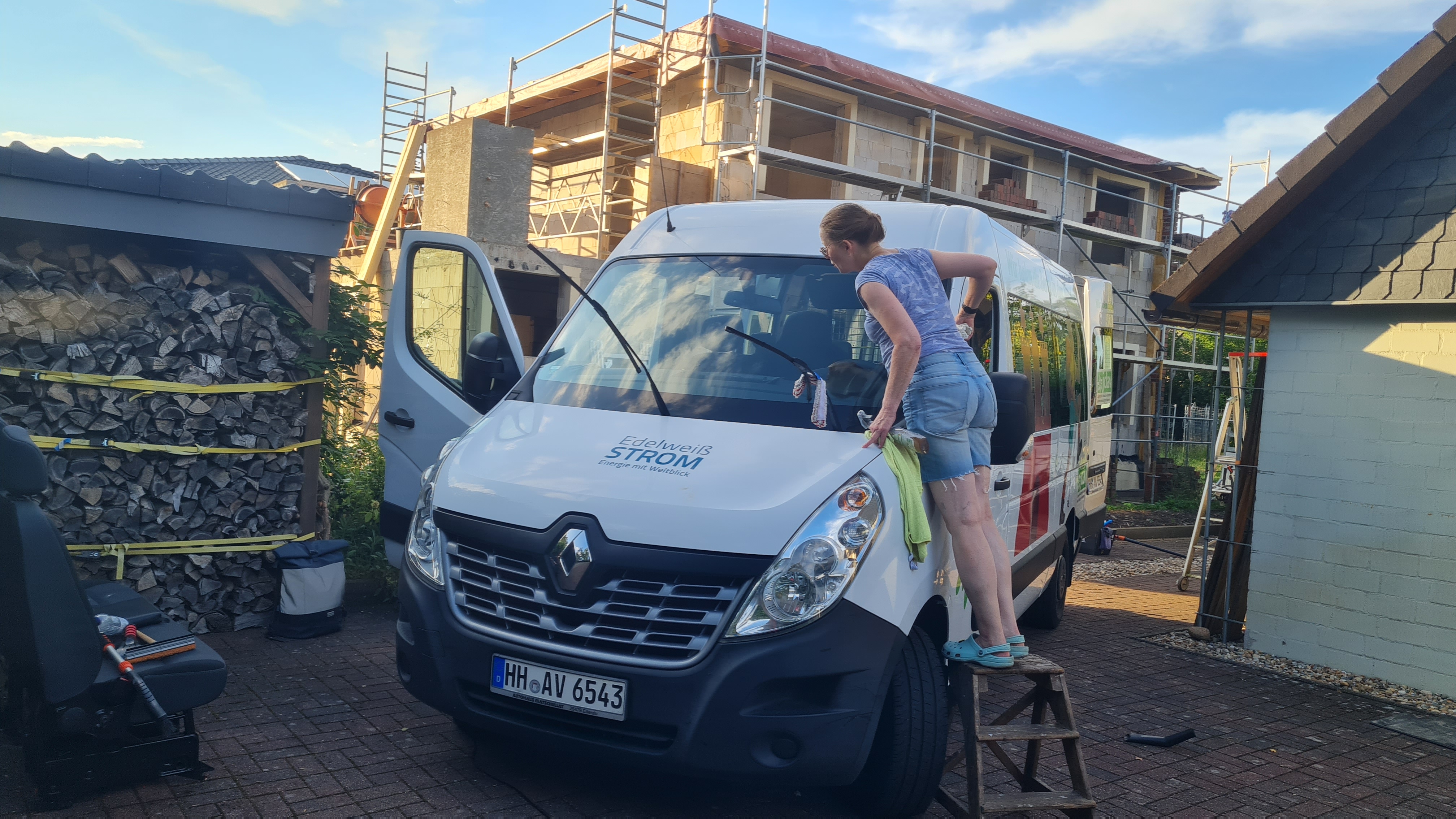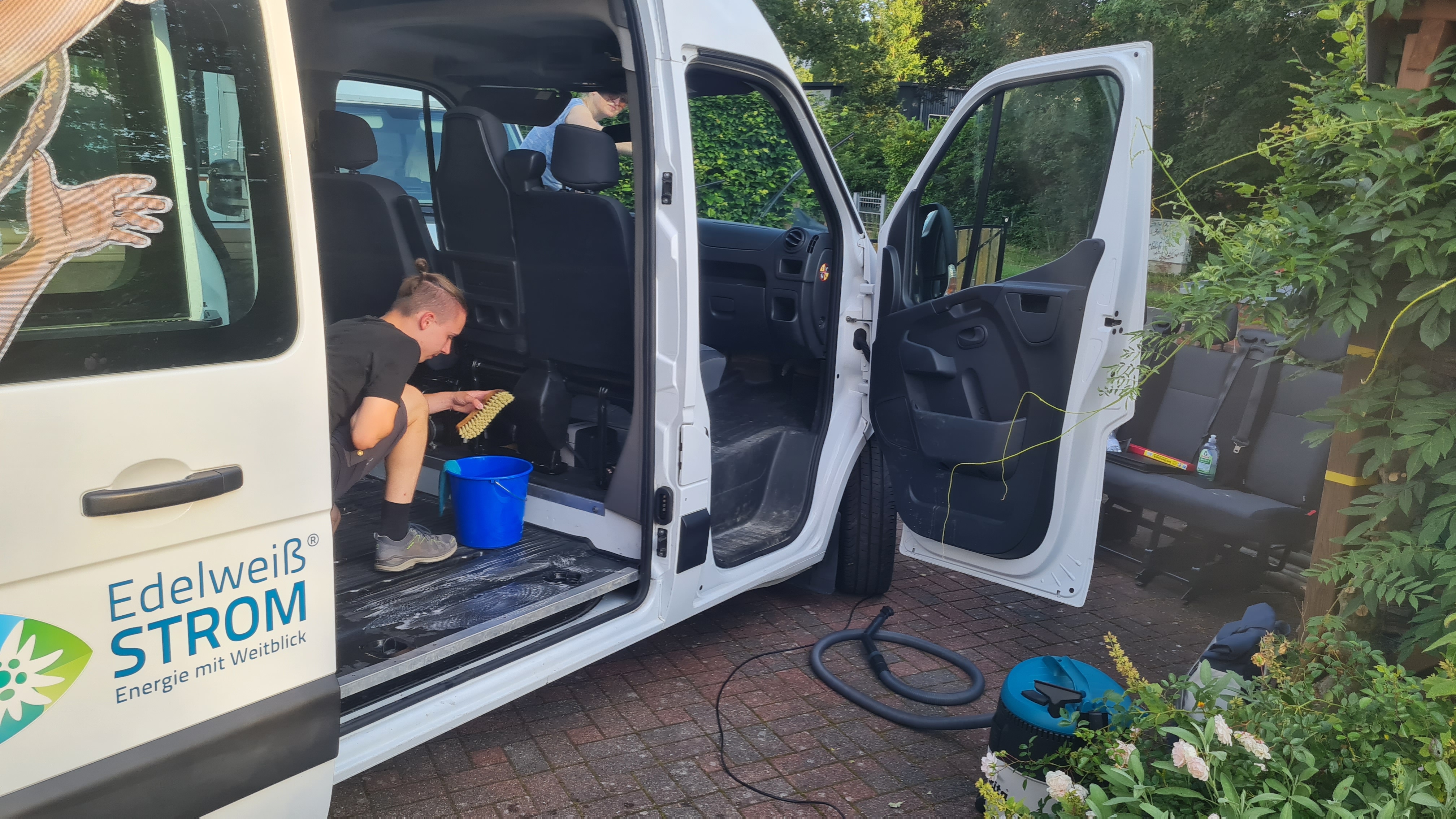 Ich, Euer Jugendbus, stehe vor dem Kletterzentrum und befördere hauptsächlich Jugendgruppen. Aber auch andere Gruppen erfreuen sich meiner Transportmöglichkeiten. Ich bin ein Neunsitzer und habe hinten sehr viel Platz für Gepäck, Klettergeraffel, Skier, Snowboards, Wanderrücksäcke, Essensbevorratung und ihr glaubt nicht, was ich noch so alles transportieren kann. Hier sei nur mal das alljährliche Pfingstcamp erwähnt. Da bin ich immer mittendrin und voll dabei. Ich komme viel rum und weit weg. Leider finden es alle blöd wenn ich dreckig bin. Aber wenn die Gruppen heimkommen, haben sie nicht unbedingt meine Säuberung im Fokus. Nun, mein neuer Betreuer Joost fand, dass ich mal eine Grundreinigung verdient habe, welch Glück tirili. In Kaltenkirchen wurde ich über zwei Stunden mit Schrubbern bearbeitet. Auch und gerade von oben, wo sich ja schon Moos angesiedelt hatte. Von dem Saharastaub und Blütenstaub ganz zu schweigen. Mein Reinigunstrupp, Jörg und Joost, haben sich danach erstmal mit Crêpes bei den Kochs´s gestärkt. Währenddessen konnte ich mich etwas an dem neuen Glanz erfreuen. Mit neuem Elan widmete sich nun der Putztrupp, verstärkt durch Rike, meinem Innenraum. Alle Schapps und alles was nicht niet- und nagelfest war, wurde ausgeräumt. Selbst die Sitzbänke haben sie ausgebaut. Mit Staubsauger wurde alles Grobe entfernt. Danach war viel Wischwasser nötig, um mit Schruppbürsten und Lappen nun den Dreck zu entfernen. Viele Utensilien sind nun in beschrifteten Kisten verstaut. Abends um halb zehn, also über drei Stunden später, ging es zurück zum KLZ. Mein Putztrupp hat ganze Arbeit geleistet. So vertrete ich die JDAV gerne anstatt als Scheppelchese in der Ecke zu stehen. Mit einem netten Nachtreffen, nach einer Ausfahrt, könnte man doch regelmäßig eine Endreinigung gleich mit einplanen. Das würde mich als Jugendbus sehr freuen, wenn ich euch schon überall hinbringe. Oder halt mit einer Aktion Gruppen übergreifend, das wäre auch lustig. Was meint Ihr?