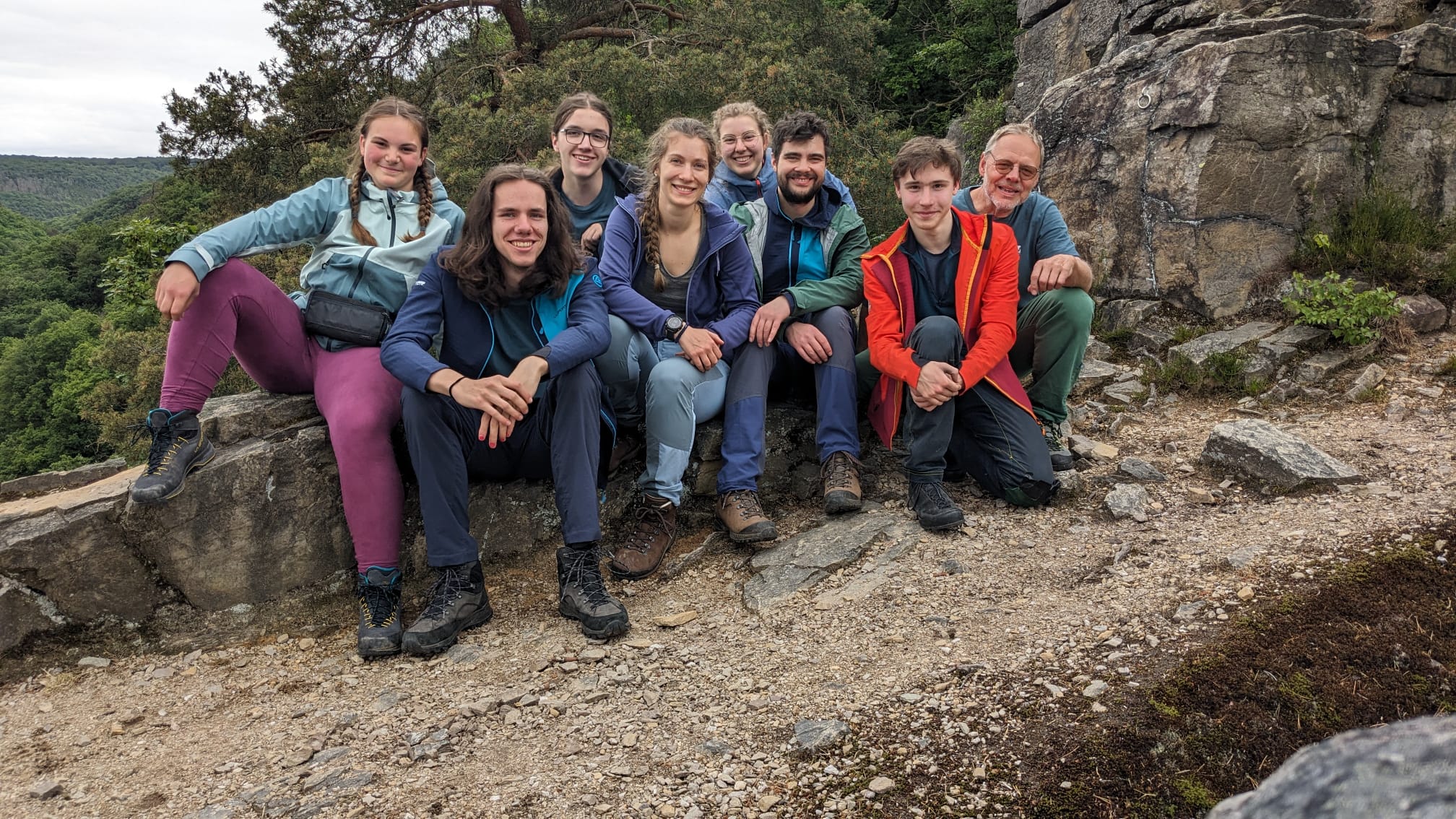 Beim Frühstück am nächsten Morgen wurde nicht nur von der äußerst gemütlichen Nacht geschwärmt sondern auch der Tag geplant. Es stand Klettern am Fels an. Nachdem der Jugendbus mit Kletterausrüstung beladen wurde, erreichten wir bald unser Ziel, die Hakenrisse im Morgenbachtal. Am Feld haben wir uns an mehreren Seilen richtig ausgepowert und es fielen Sätze wie: „Klettern ist wie Beachvolleyball, man benutzt alle Körperteile“, „am Fels kann man überall klettern“ und auf die Frage „wo muss ich lang?“ gab es die Antwort „Rechts, Links, einfach nach oben!“ Sehr hilfreich. Die schöne Aussicht wurde mit einem Gruppenfoto gewürdigt und anschließend ging es zurück zum Zeltplatz. Vor dem Schlafengehen spielten wir dann noch eine Partie Wizard.