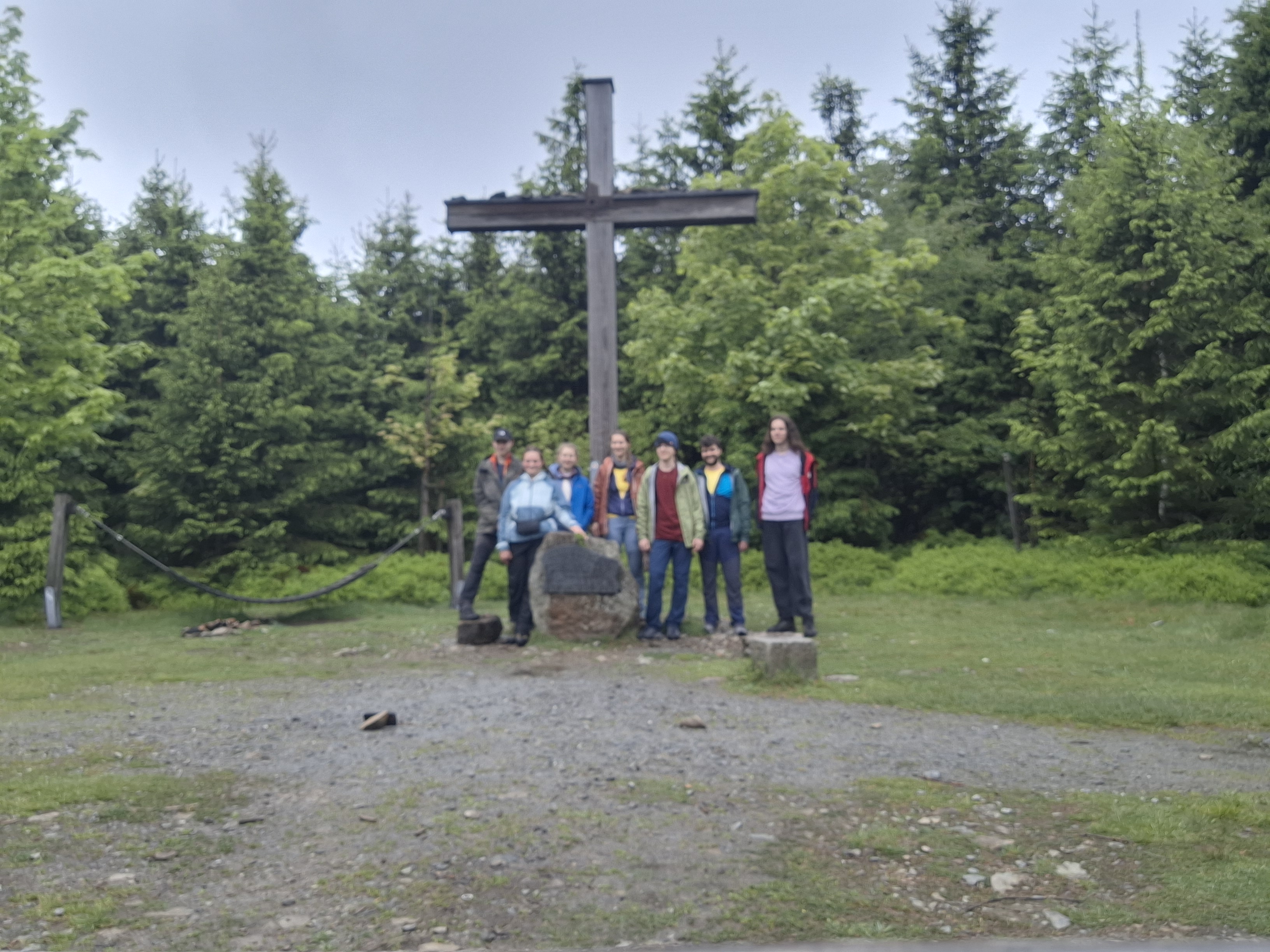 Und so ging es am nächsten Tag dann direkt nach dem Frühstück los. Doch sollte all die sorgfältige Planung umsonst gewesen sein, wenn wir schon auf den ersten 5 Metern an der Wegfindung scheitern und in die falsche Richtung loslegen? Die Orientierung nur anhand der Karte ist nicht so einfach, trotz der unübersehbaren Wegweiser. Aber bald haben alle Gipfelstürmer den Dreh raus und es wird sich mit vollen Elan auf die Umweltaufgaben gestürzt. Was man so alles entdecken kann. Und schwups die wups stehen wir oben auf dem Brocken. Der wirklich nicht viel an Schönheit hergibt. Da erschließen wir lieber den Gipfelstein über Normalweg und Verschneidungsroute. Für das Foto muss dann auch noch unser mobiles Wanderstock-Gipfelkreuz gerichtet werden. Ohne Kreuz kann man schließlich kein Gipfelfoto machen. Nach kurzer Mittagspause nehmen wir dann das nächste Gipfelziel in Angriff und machen uns auf den Weg zum Wurmberg. Doch als wir gerade, fröhlich witzelnd, wie immer, den Asphaltweg verlassen wollen, knickt einer unserer Mitstreiter um. Etwas ratlos stehen wir zusammen, doch schnell ist klar, runter geht es so erstmal nicht. Hoch aber schon, und so machen sich unser Verletzter mit einer Begleitung auf den Weg zurück zum Gipfel. Der Plan: von dort die Brockenbahn nehmen und mit was Umweg zurück zum Schullandheim fahren. Währenddessen begibt sich der Rest der Gruppe auf den steinigen Weg nach unten, nun deutlich vorsichtiger als zu Anfang. Doch, ohne dass alle es mitbekommen haben, ist unsere Gruppe an der nächsten Wegkreuzung wieder vollständig vereint. Das löste einige Verwirrungen und Telefonate über 3 Meter hinweg aus. Nach kurzer Zeit legt sich die Aufregung aber wieder. Der Fuß tat doch nicht mehr so dolle weh. Wir konnten also gemeinsam weiter über verschiedenstes Chemiewissen und andere Lebensweisheiten philosophieren, während der Wurmberg immer näher rückte. An einer Sommerbob-Bahn machten wir dann noch kurze Rast, bevor die entscheidenden Höhenmeter in Angriff genommen wurden. Als wir den Gipfel schon sehen konnten, kam nochmal das steilste Stück, was die tapferen Gipfelstürmer, egal ob über Treppen oder Serpentinen, natürlich ohne große Mühe bewältigten. Oben angekommen verhieß uns der weite Ausblick nichts Gutes, und der Blick auf den Wetterbericht macht eindeutig klar: Regensachen an, und nicht nur die Jacke, sondern auch die Hosen. Hätte man doch nur die Bettwäsche zu Hause gelassen, dann wäre dafür noch Platz gewesen im Rucksack … Schnell wurde noch ein Gipfelfoto gemacht und dann hieß es nichts wie runter, wir wollten schließlich alle trocken bleiben. Doch wie sich herausstellte, waren unsere Sorgen völlig umsonst gewesen. Das Gewitter schrammt haarscharf an uns vorbei und außer ein paar Tropfen bekamen wir gar nichts davon ab. Die Regenmontur wurde also recht schnell wieder abgelegt und wir liefen fröhlich und entspannt das letzte Stück, durch den diesmal nicht ganz so vom Borkenkäfer zerfressenen Wald, zurück. Im Schullandheim wurde dann erstmal ordentlich gejammert über die gesammelten Blasen und Schrammen der harten Wanderung, doch beim Essen waren alle in ausgelassener Stimmung und so ging der Abend mit singenden Fischen, träumenden Wölfen, wilden Malkünsten und einer Menge Gelächter zu Ende.