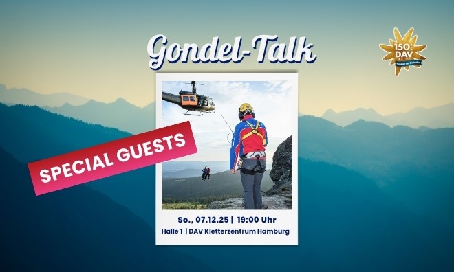 Beim nächsten Gondel-Talk am 07.12.25 um 19:00 Uhr im DAV Kletterzentrum Hamburg erwartet euch ein spannender Einblick in die Welt der alpinen Rettung und Krisenbewältigung. Zu Gast sind Roland Ampenberger (Pressesprecher Bergwacht Bayern) und Stefan Winter (DAV-Ressortleiter für Sportentwicklung und Koordinator des DAV-Krisenteams). Gemeinsam berichten sie aus erster Hand von Einsätzen in den Alpen, Herausforderungen im Ernstfall und der Bedeutung professioneller Vorbereitung und Teamarbeit.