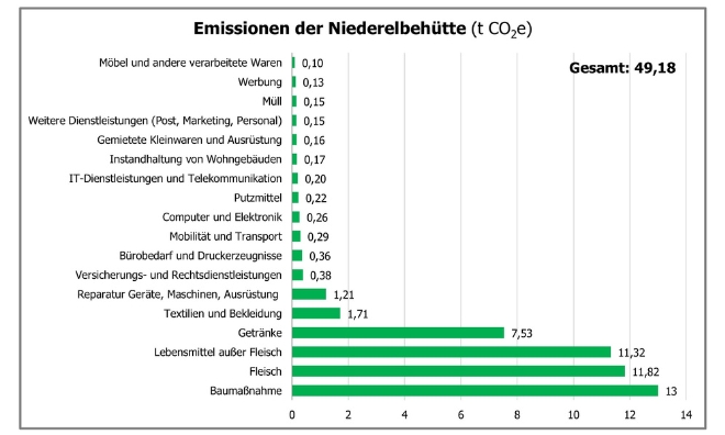 Auf der Niederelbehütte wurden 49,18 t CO₂e emittiert. Die Hütte ist autark und die elektrische Energie wird mithilfe einer Wasserkraftanlage gewonnen, die vom See neben der Hütte gespeist wird. Durch eine Druckwasserrohrleitung fließt das Wasser durch eine Turbine, die einen Generator antreibt und so Strom erzeugt. Im Rahmen der Erneuerung der Druckwasserrohrleitung kam es zu erhöhten Emissionen. Mehr als ein Viertel der Emissionen der Hütte sind durch diese Baumaßnahme entstanden. Neben der Baumaßnahme ist ein großer Teil der Emissionen der bewirtschafteten Hütte durch Lebensmittel und Getränke entstanden. Weitere Waren und Dienstleistungen, wie beispielsweise Reparaturen, Post und Druckerzeugnisse, haben dagegen nur wenige Emissionen verursacht. 24 % der Emissionen der Hütte sind auf den Fleischkonsum zurückzuführen. Fleischkonsum ist mit besonders hohen Emissionen verbunden. Bei der Tierhaltung entstehen viele Treibhausgase, da hierfür große Mengen an Futter, Wasser und Land benötigt werden. Hinzu kommt das Methan, das u. a. bei der Verdauung von Kühen entsteht.