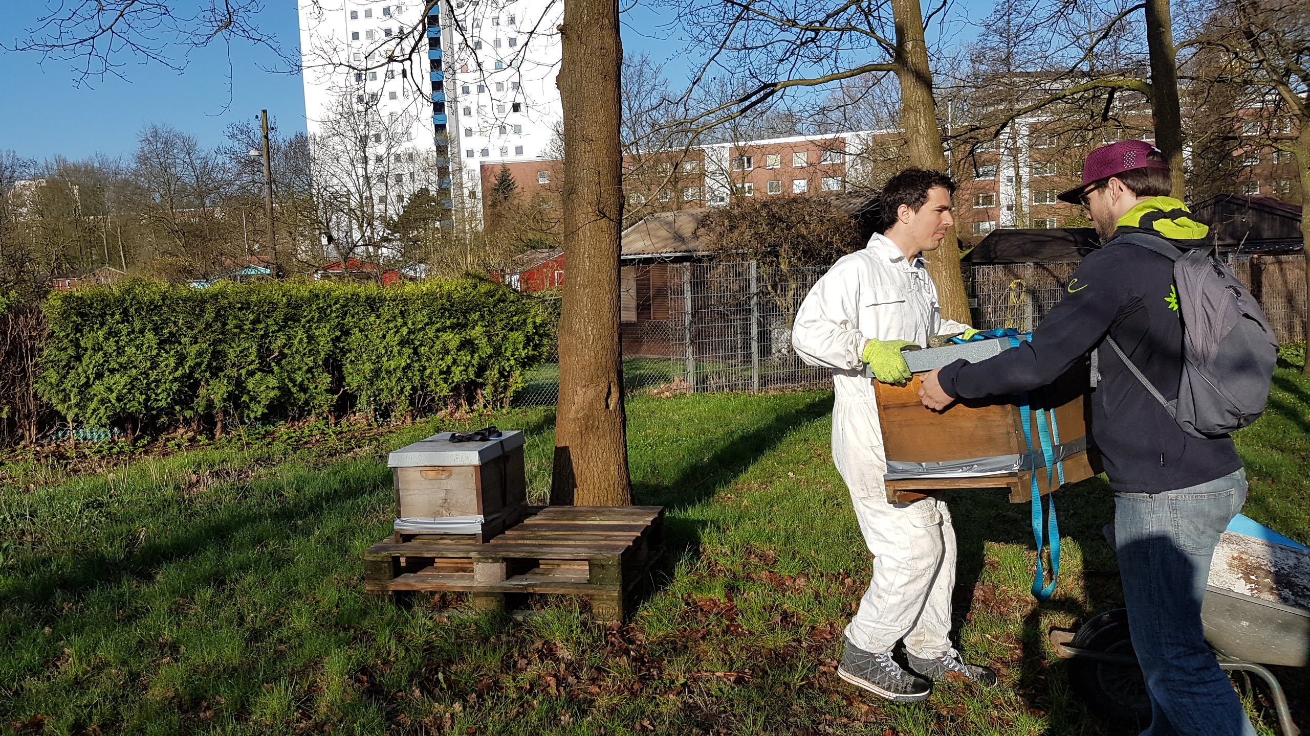 Diese Verbindung wird nun mit dem Einzug von zunächst zwei und später weiteren zwei Bienenköniginnen und ihren Völkern gekrönt. Seit dem 17. April 2018 sind die fleißigen Bienen in unserer näheren Nachbarschaft in den Kleingärten unterwegs und bestäuben Blüten, sammeln Nektar und helfen fleißig bei der Produktion von Honig.