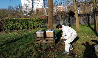 Am 17. April 2018 übergab Bestäubungs-Imker Wolfgang Reuter, Co-Founder des Hamburger Start-ups Bee-Sharing, zwei Bienenvölker an unsere Sektion. Udo Solich, unser Referent für Natur- und Umwelt im Vorstand der DAV Sektion Hamburg und Niederelbe, begleitete den Einzug der zwei Bienenstöcke.