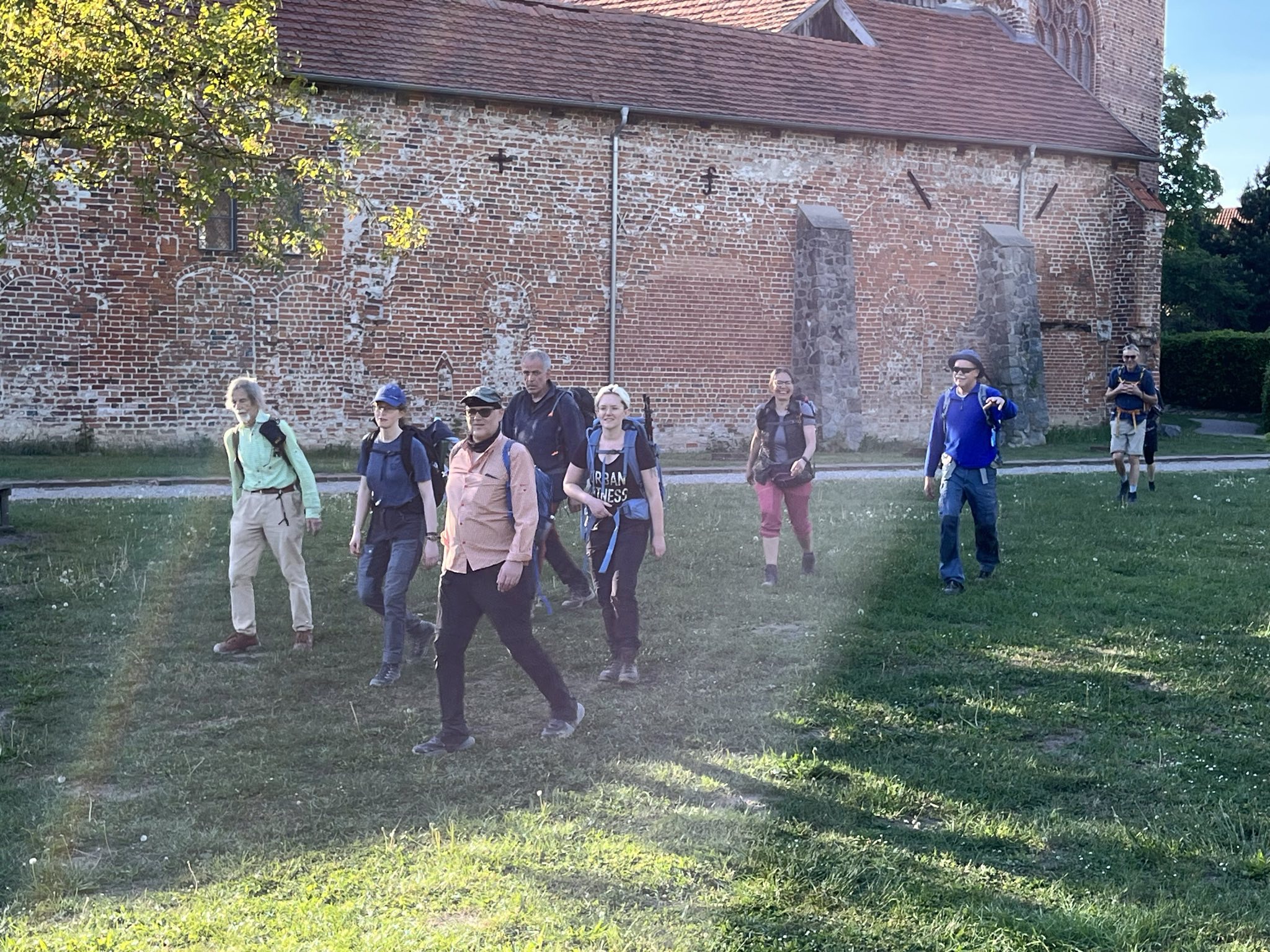 Für die knapp 40 km lange Nachtrunde kam hier Susanne dazu. Nur am Koster Rehna war die Gesamtgruppe mit 12 Personen zusammen. An diesem besonderen Ort konnten wir uns mit den T-Shirts zum hundertjährigen Jubiläum der Bergsteigergruppe des DAV Hamburg & Niederelbe zu einem Fototermin zusammenfinden.