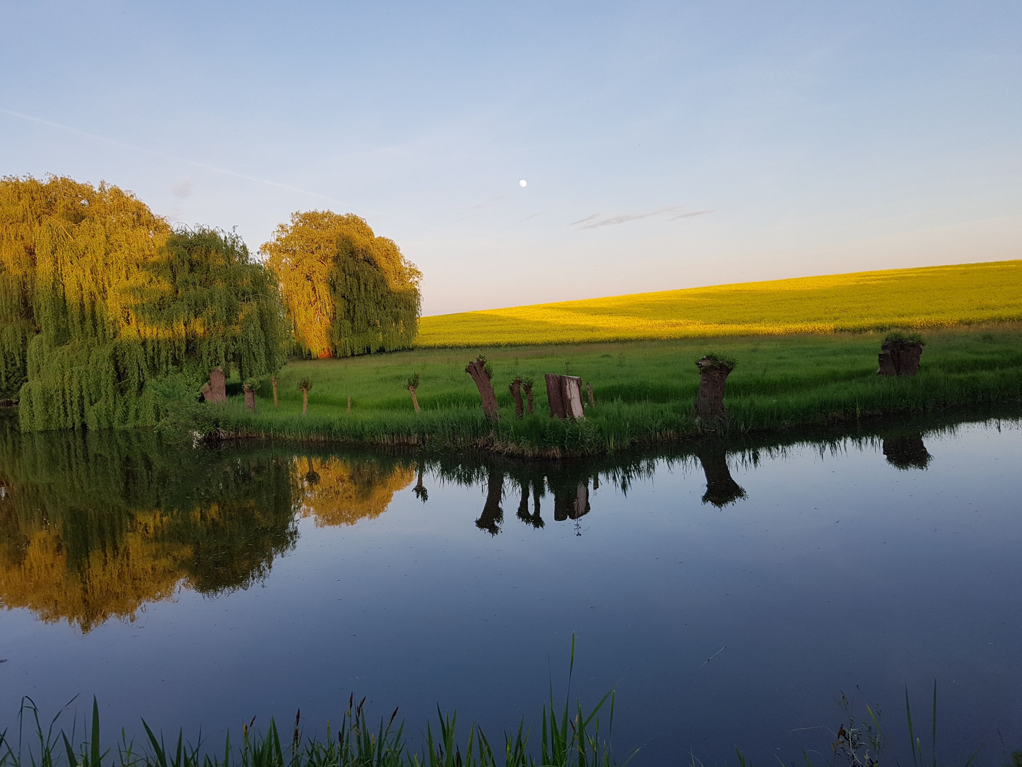 6 Menschen beenden hier ihre Wanderung aus verschiedenen Gründen und ebenso viele starten von hier gegen 19.20 in die Nachtrunde. In noch hellen Tageslicht geht es im Tal der Radegast wieder in südliche Richtung. Gegen 20.35 entdecken wir im Dorf Nesow auch den Mond am noch taghellen Himmel. Gegen 20.50 sagt uns die Sonne Tschüss.