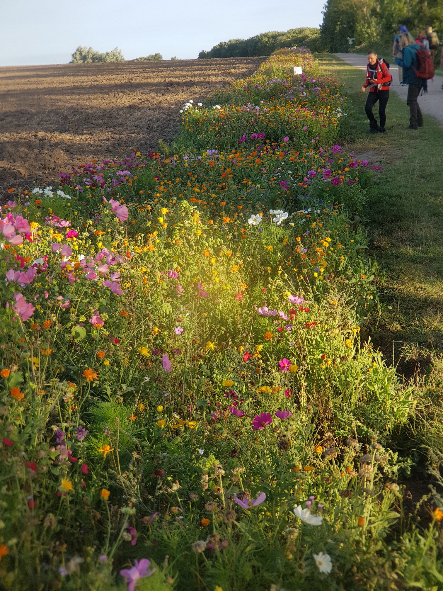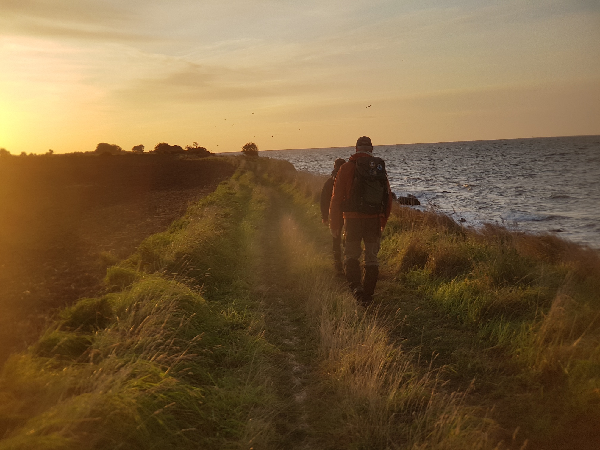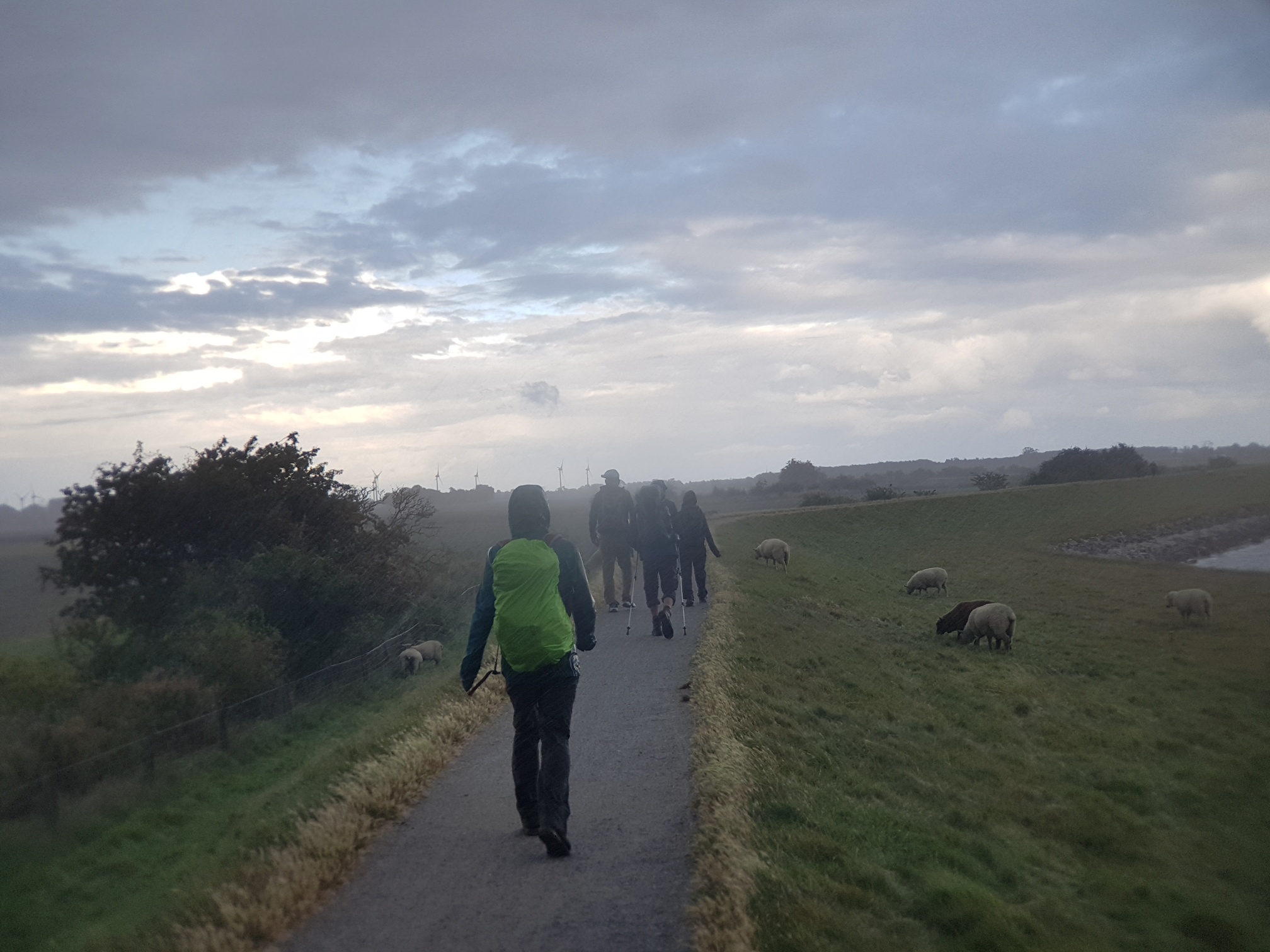 Acht Wanderer starten in die Morgendämmerung in die 68 km Fehmarnumrundung. Vorbei am Sahrensdorfer Binnensee(**Foto) und an den Hochhäusern vom Südstrand vorbei kommen wir auf dem Bohlenweg an der Südküste zügig voran. Kurz vor dem Staberhuk als östlichstem Punkt unserer Runde scheint uns die Sonne ins Gesicht. Typisch Fehmarn: Die ist gerade über einem Kohlfeld aufgegangen.