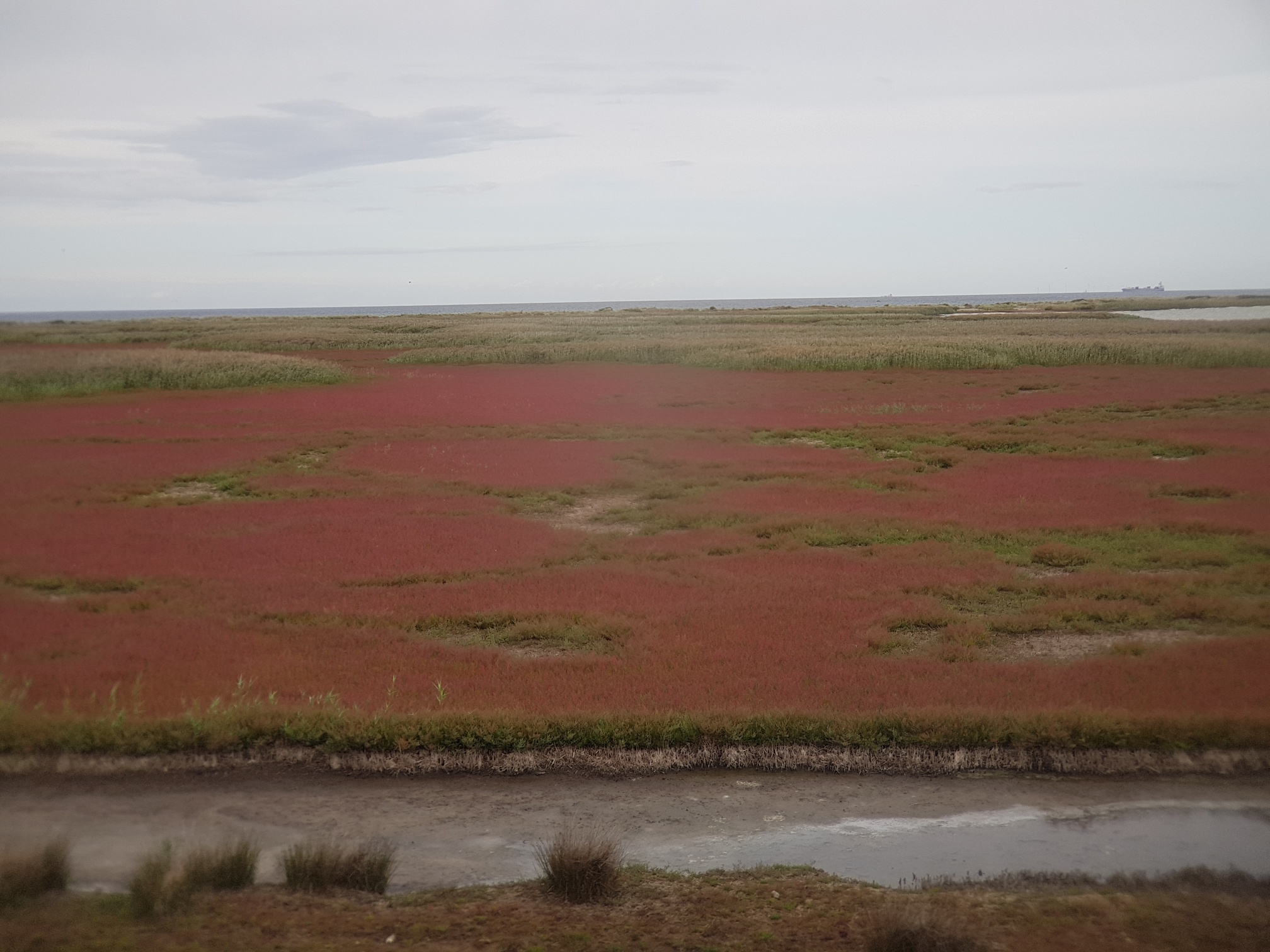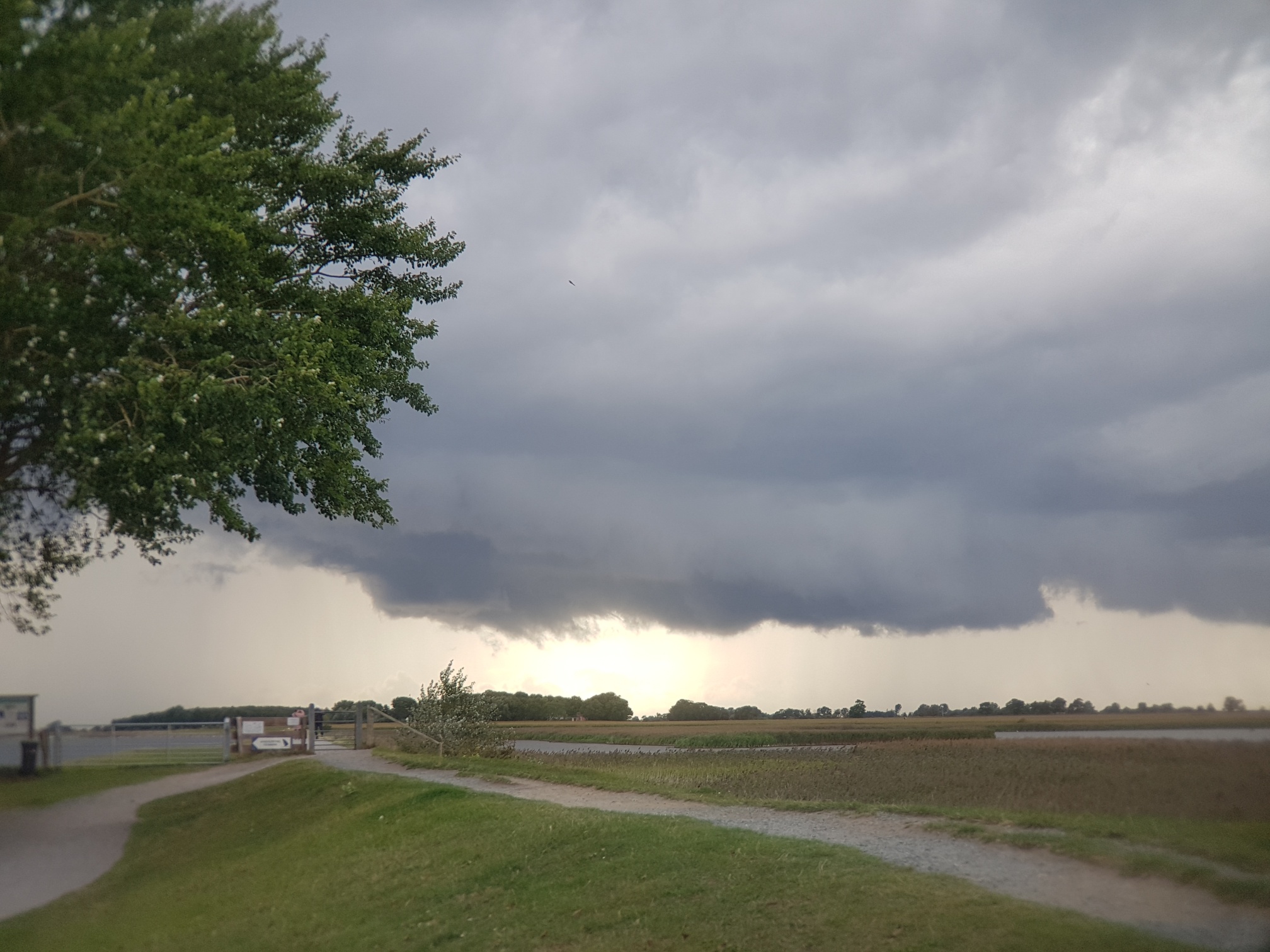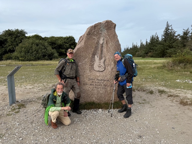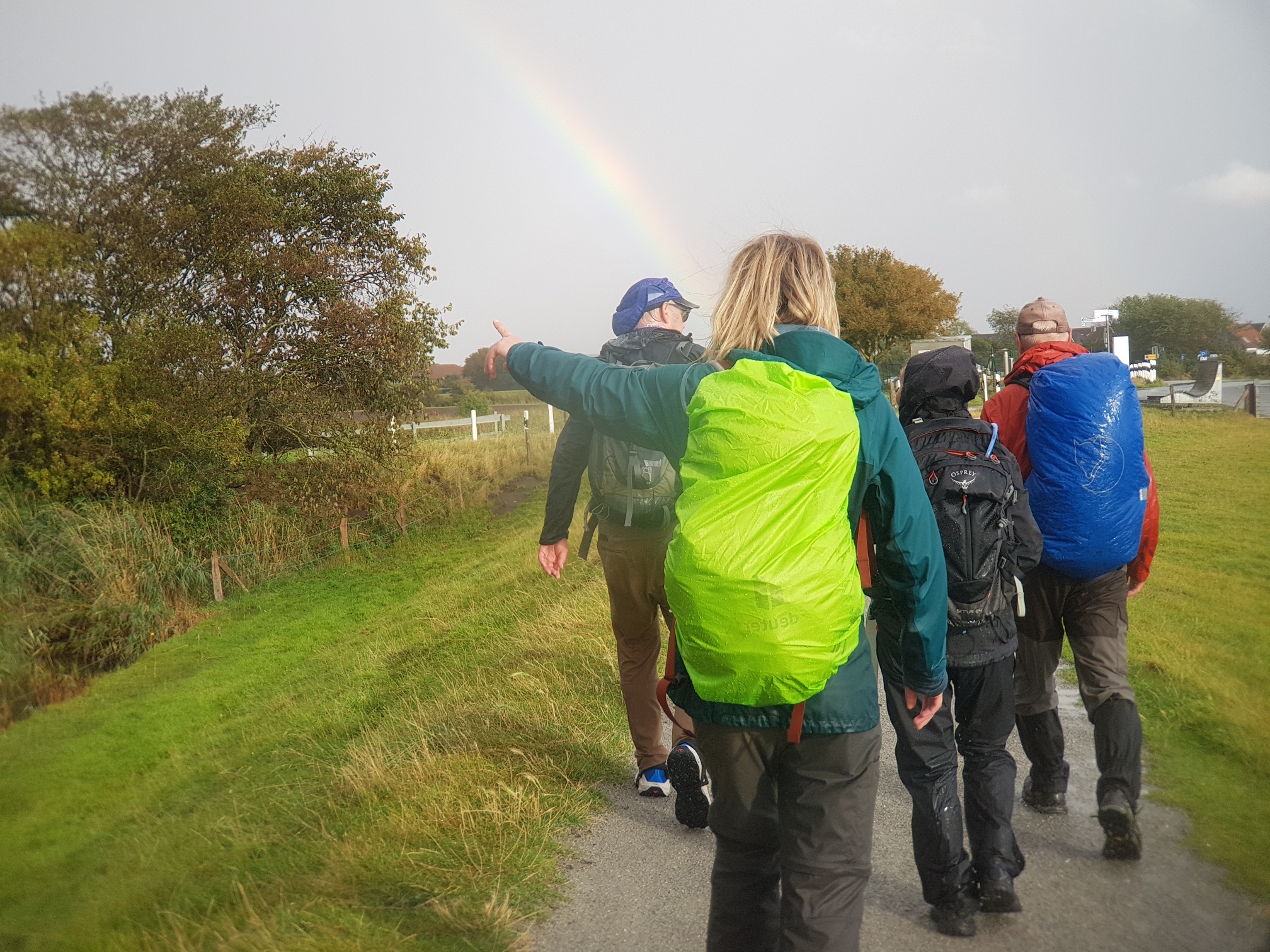 An der Nordwestecke dreht sich unsere Wanderrichtung wieder nach Süden und wir blicken auf ausgedehnte Salzwiesen. Vorbei am Jimi Hendrix Gedenkstein und am Flügger Leuchtturm freuen wir uns auf die 50km-Pause am Hafenkiosk in Orth. Danach überrascht uns allerdings ein unerwartet heftiger Regenschauer.
