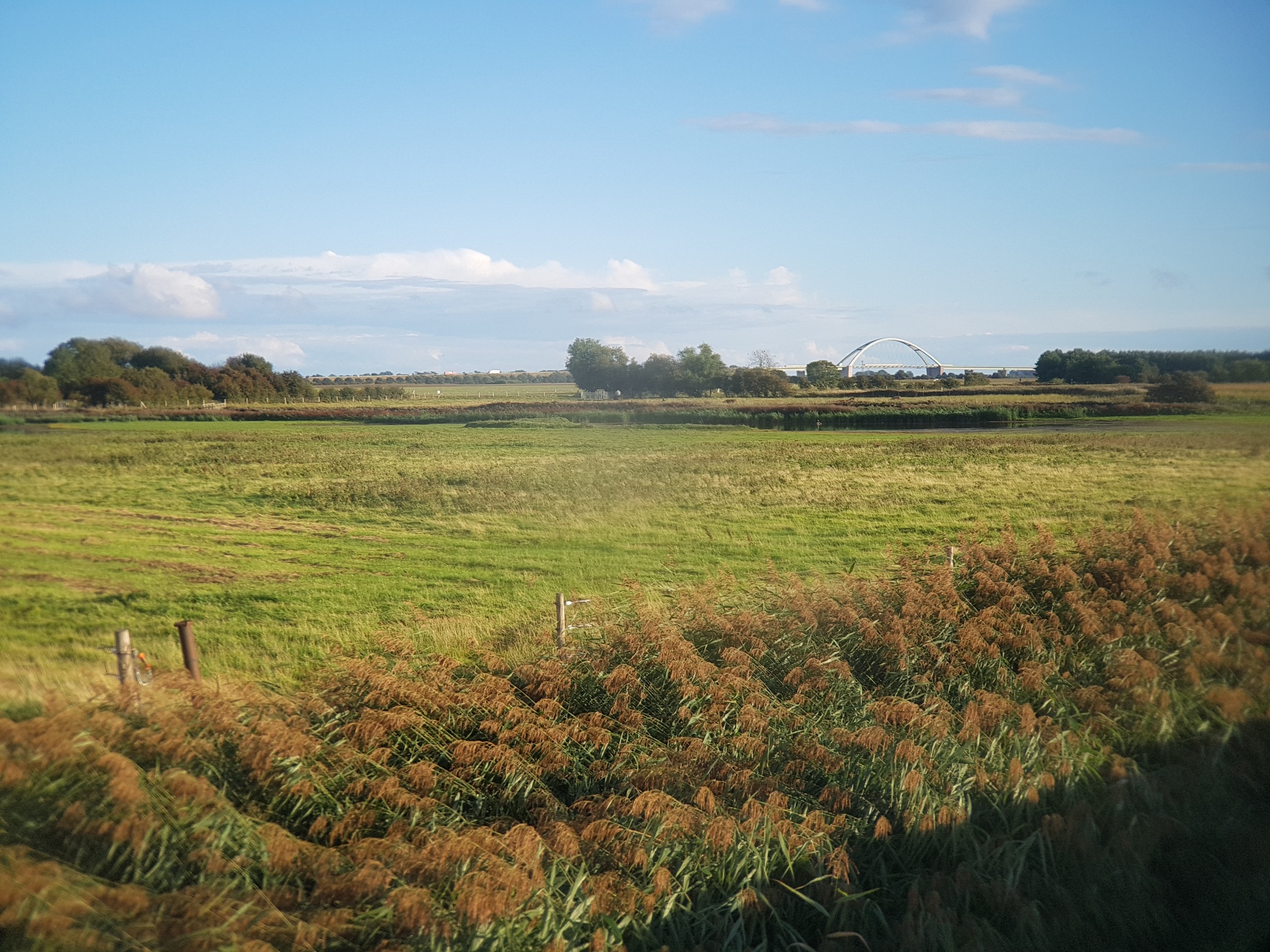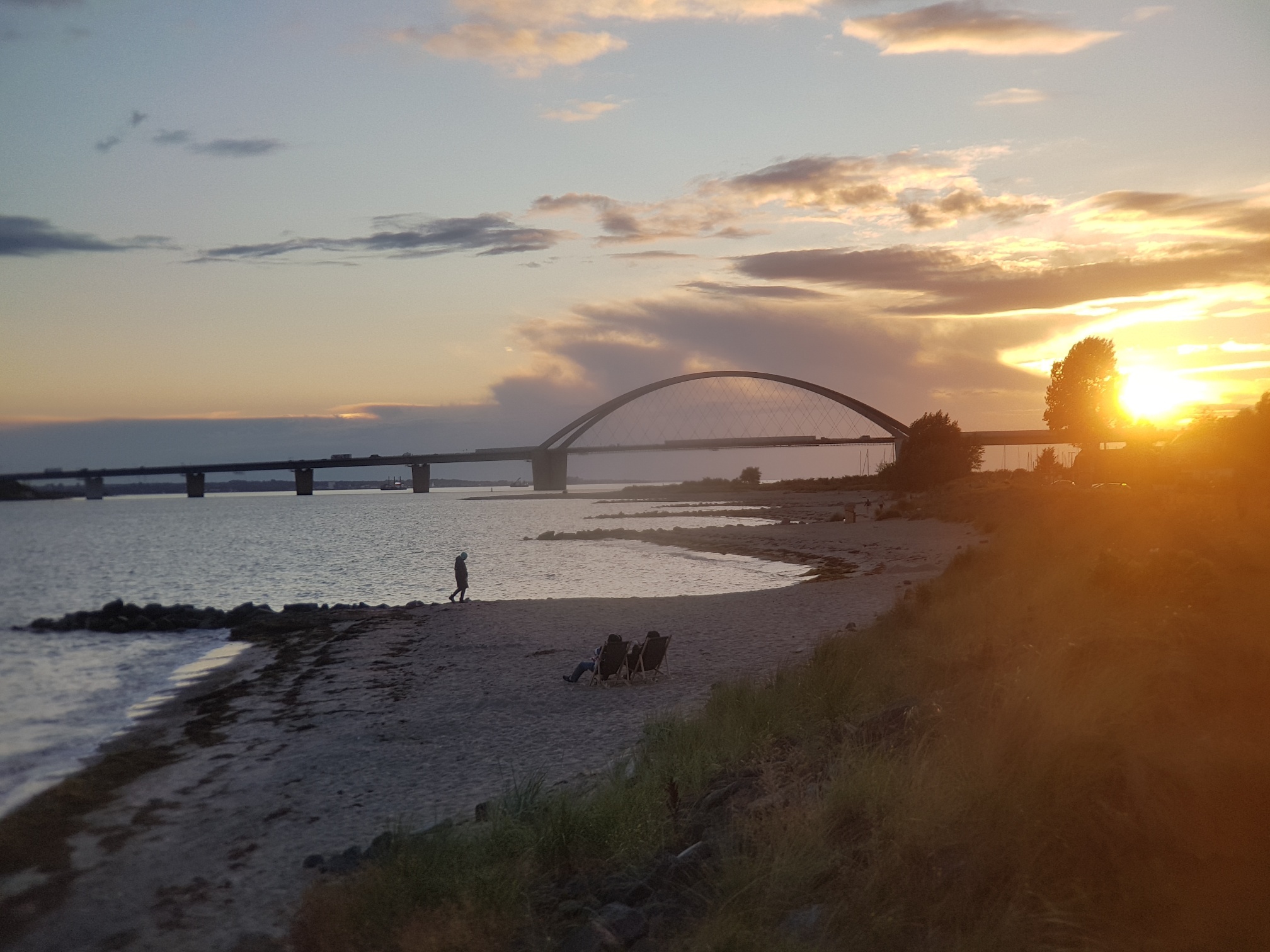 Ein erster Blick auf die Fehmarnsundbrücke kündigt die letzte Etappe unserer Rundwanderung an. Die Sonne steht inzwischen tief im Westen. Als wir nach einer letzten kurzen Pause die Brücke bei etwa km 60 unterqueren, können wir noch die Sonnenuntergangsstimmung genießen. Gegen 20:45 erreichen wir den Hafen von Burgstaaken wieder. Der Bootsname „Kehrheim“ im Hafen scheint dazu passend.