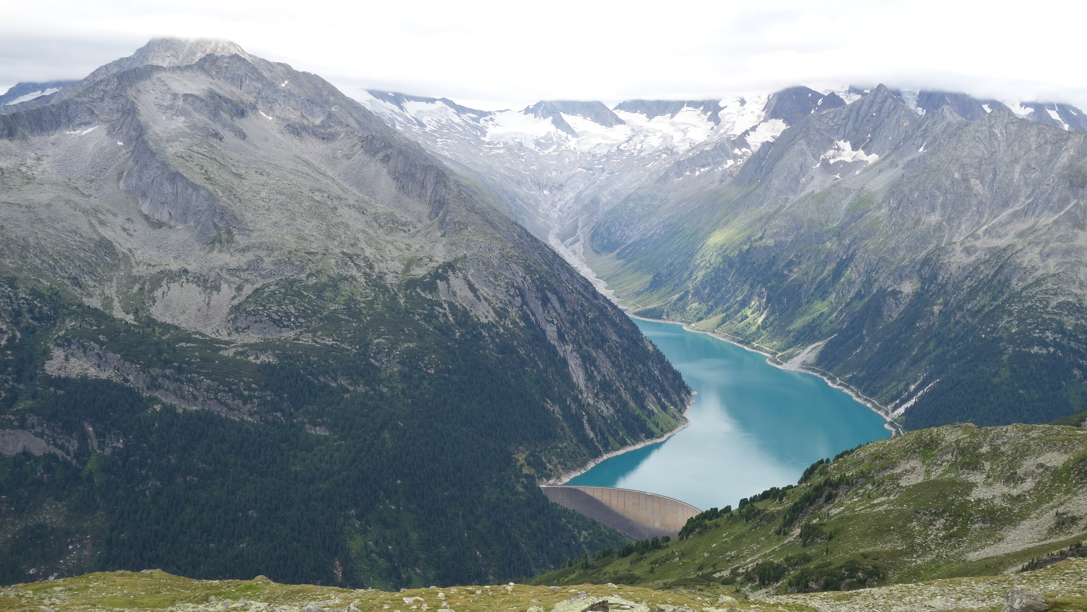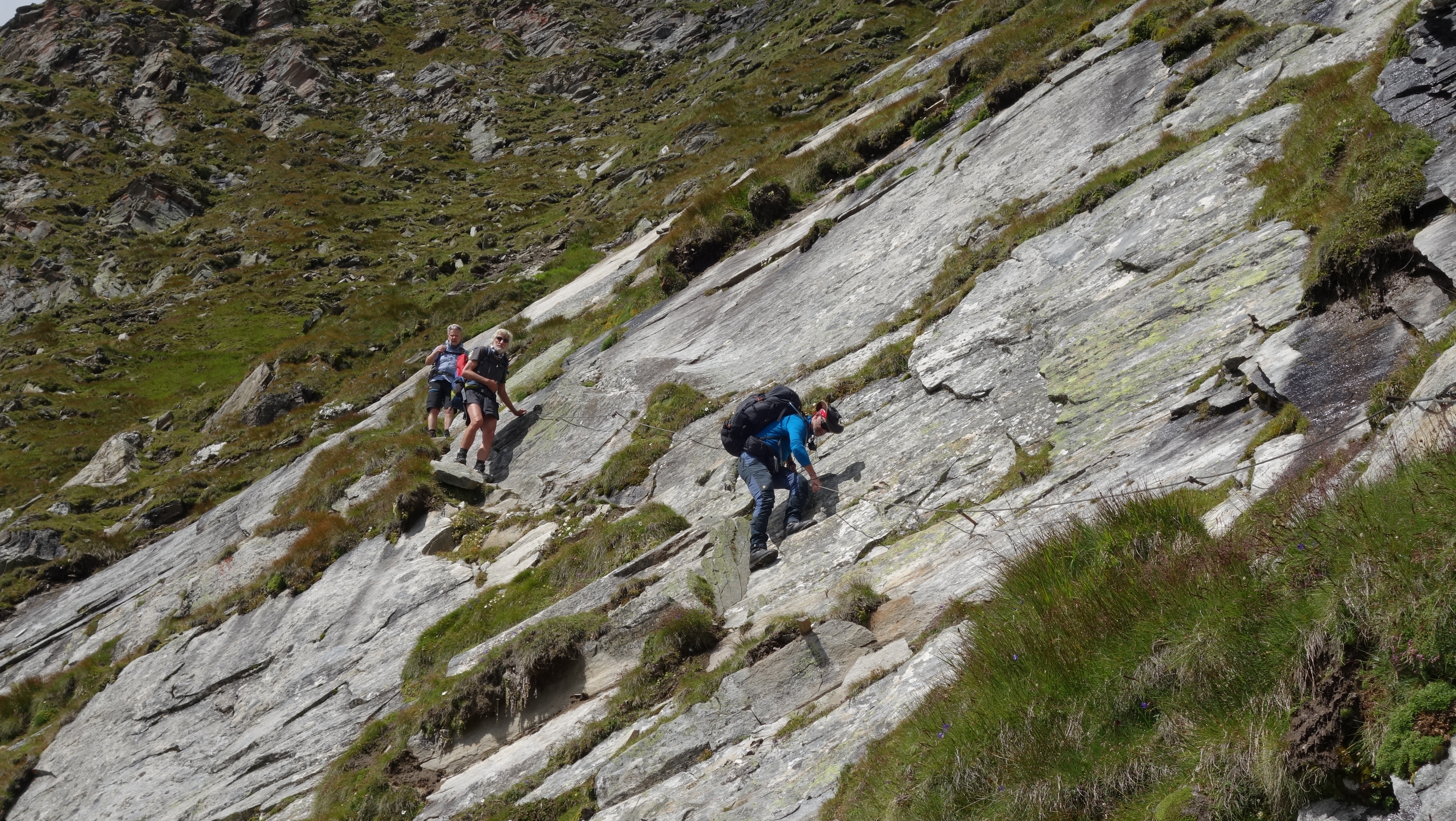 Nun steht schon die 6. Tagesetappe (ATG2-14) vom Friesenberghaus zum Pfitscher-Joch-Haus an; der Weg führt zum Olperer Haus. Kurz davor ist ein Instagram Highlight. An der neu installierten Hängebrücke wird von ca.100 jungen Menschen das Foto “ich auf der Hängebrücke über den Schlegeisspeicher“ erstellt. Trail Runner Girls rennen an uns vorbei und laufen gleich 3 Tagesetappen des Berliner Höhenweges an einem Tag. Ein junges Paar trägt nagelneue Bergschuhe in den Händen. Sie haben diese zu klein gekauft und vorher nicht ausreichend getestet! Stattdessen werden mit leichten Sommerschuhen an den Füßen die Felsplatten für diesen großen Fotomoment bestiegen. Wir wandern mit unserer nützlichen Ausrüstung über treppenartige Felsblöcke bei geringem Gefälle weiter. Auf diesem Weg sind eine Menge Bäche zu überschreiten, die durch das Rauschen der Wasserfälle schon früh zu hören sind. Die Schlechtwetter Strecke bietet die Möglichkeit auch ein Murmeltier zu sehen und die Klettereinrichtungen an der Schlegeisspeicher Staumauer zu bewundern. Auf dem Weg 524 kommt man zum Pfitscher Joch, wo Italien beginnt.