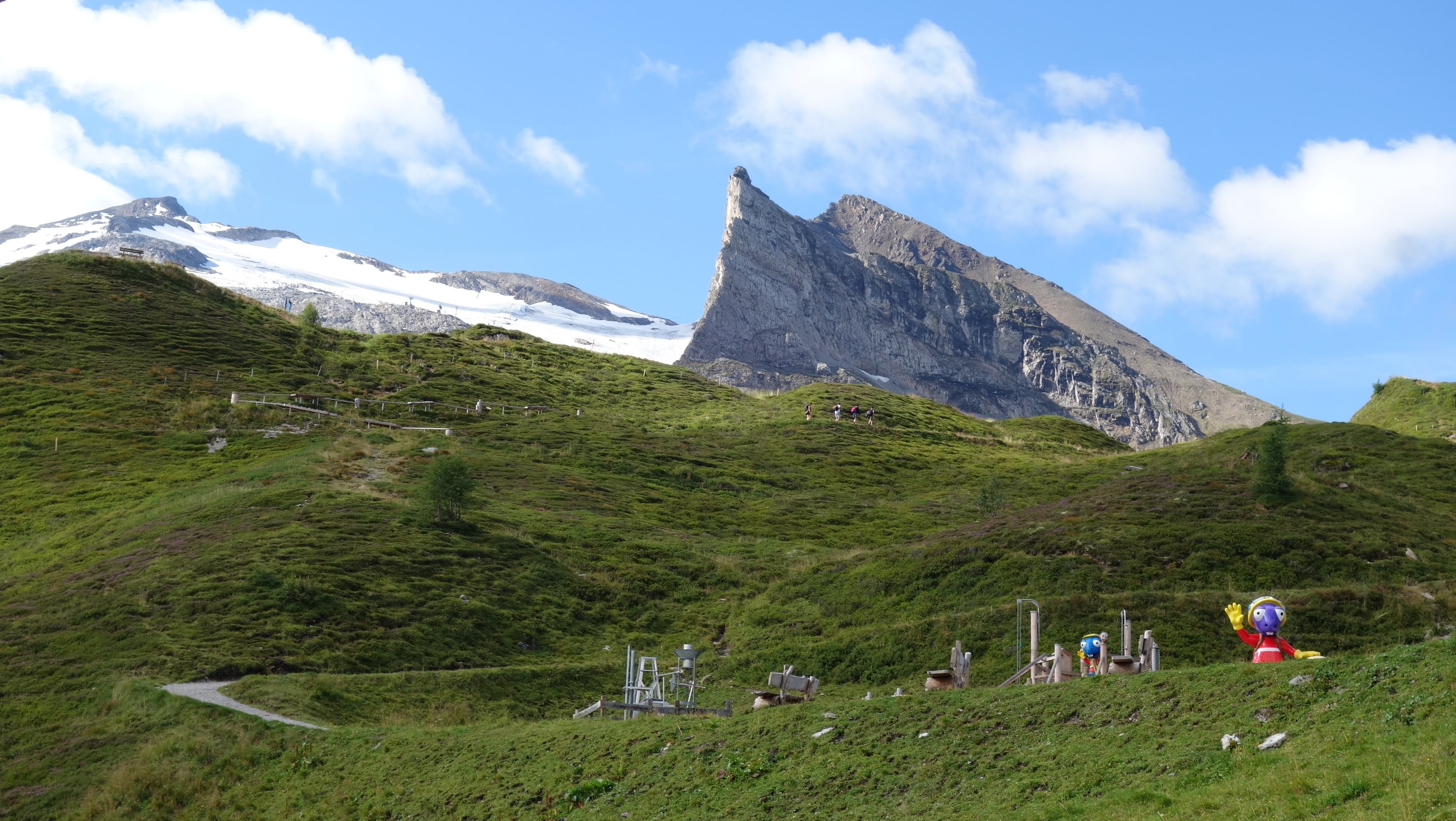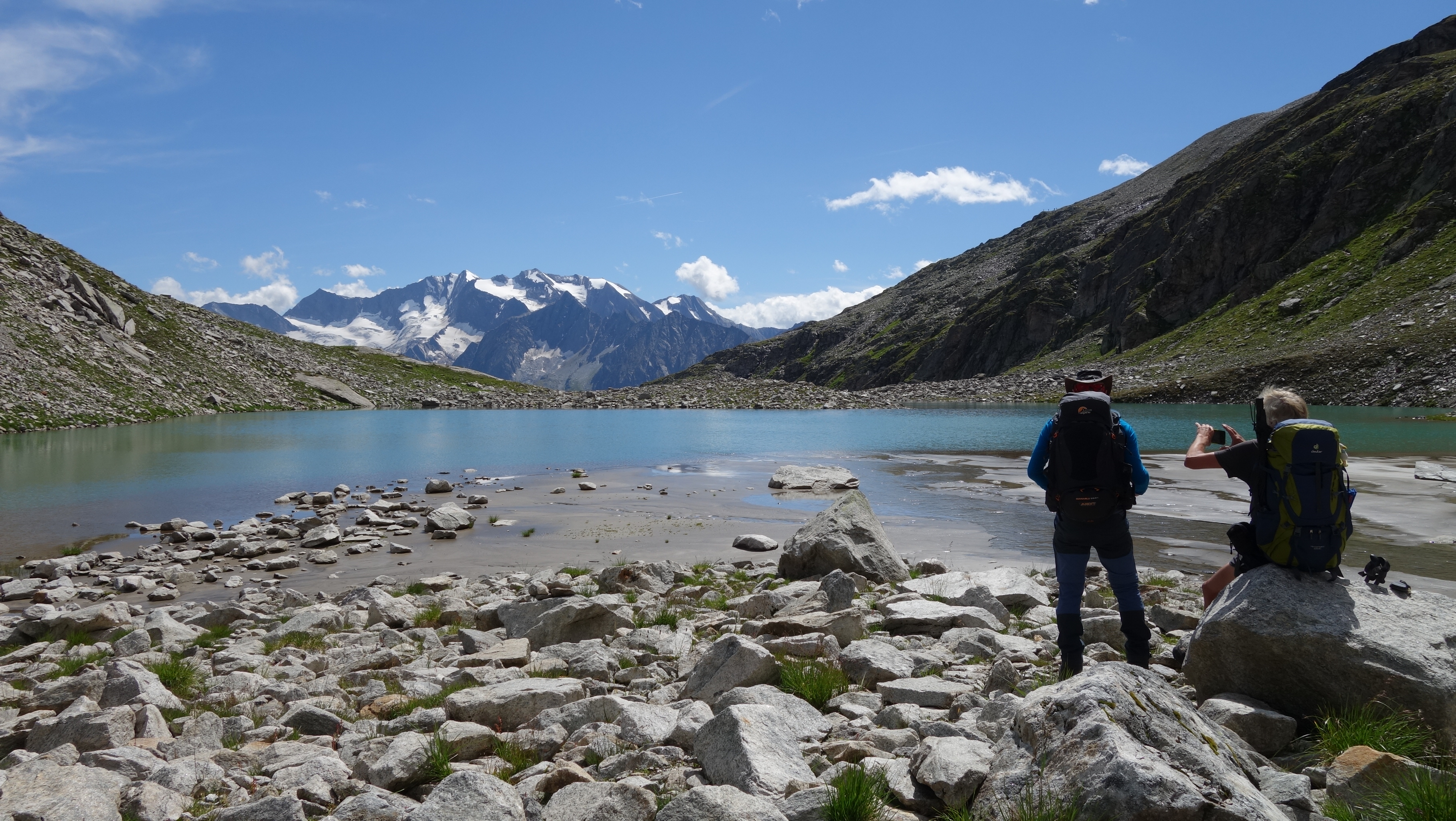 Der 5. Tag (ATG2-13) startet mit der Busfahrt von Finkenberg nach Hintertux. Die Wanderwege für diese Passage sind nicht attraktiv genug, um dafür einen extra Tag zu spendieren. Auch hier ist ein ZOsB oben an der zweiten Gletscher Bus Station. Der ursprüngliche Weg von der Station zur Friesenbergscharte ist nicht mehr begehbar, so folgen wir der Ausschilderung zum Spannagelhaus. Ab hier haben wir wieder einen deutlich gut erkennbaren und markierten Weg über viel Geröll und Steine. Wir haben Glück, dass es eine neue Brücke über den hinabstürzenden Wasserlauf gibt. Ansonsten wäre hier vermutlich unser Vorhaben plötzlich und unerwartet beendet gewesen. Das Wetter hat sich deutlich verbessert. Wir sind gut gelaunt; Fitness und Verständnis sind gut für die bevorstehende Aufgabe. Der Weg ist hervorragend von der Seilbahnseite aus präpariert. Oben (2.903 m) erwartet uns der Panoramablick auf den Großer Möseler, Schlegeiskees und Hochfeiler: eine echte Belohnung. Der Abstieg von der Friesenbergscharte ist anspruchsvoll: mit vielen Seilen gesichert, nur bei trockenem Wetter zu empfehlen.