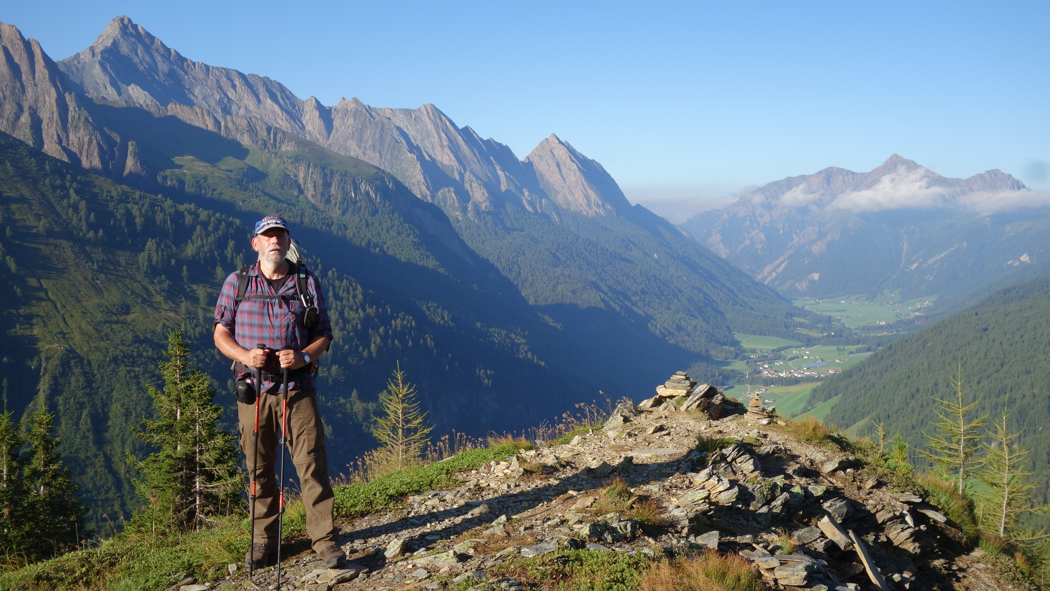 Der 1. Tag (ATG2-09 Gesamtetappe) beginnt in unserem Fall mit der Nutzung der Infrastruktur, frei nach dem Spruch von Michael Pause: „Wenn eine Seilbahn fährt – nutze sie.“ Der obere Bahnhof (1.290 m) an der Spieljochbahn verblüfft uns mit den Angeboten: Seilgarten, Kletterwand, Barfußpark, Flying Fox und viele Kinderspielgeräte. Wir begehen die schwarze Wanderroute zum Kellerjoch Gipfel mit nur wenigen anderen Wanderinnen und werden an zwei steilen Stellen mit rutschigem Untergrund daran erinnert, dass es sich um eine als schwierig definierte Wanderstrecke handelt. Wir wandern weiter zur Kellerjochhütte (guter, schneller Service). Der mit Wacholder, schönen Wiesen und purpurnem Enzian ausgestattete Weg führt uns für die erste Tourenübernachtung über den Loas Sattel zum Alpengasthaus Loas. Diese erste kürzere Etappe diente den Teilnehmern aus Hamburg zur Anpassung an Luftdruck und Gelände. Meine neuen „Partner“ - Wanderstöcke - halfen mir, auf dem Weg zu bleiben und mögliches Wackeln und Rutschen zu vermeiden. Mein Tipp: Mit Stöckern geht das alpine Bergsteigen sicherer.