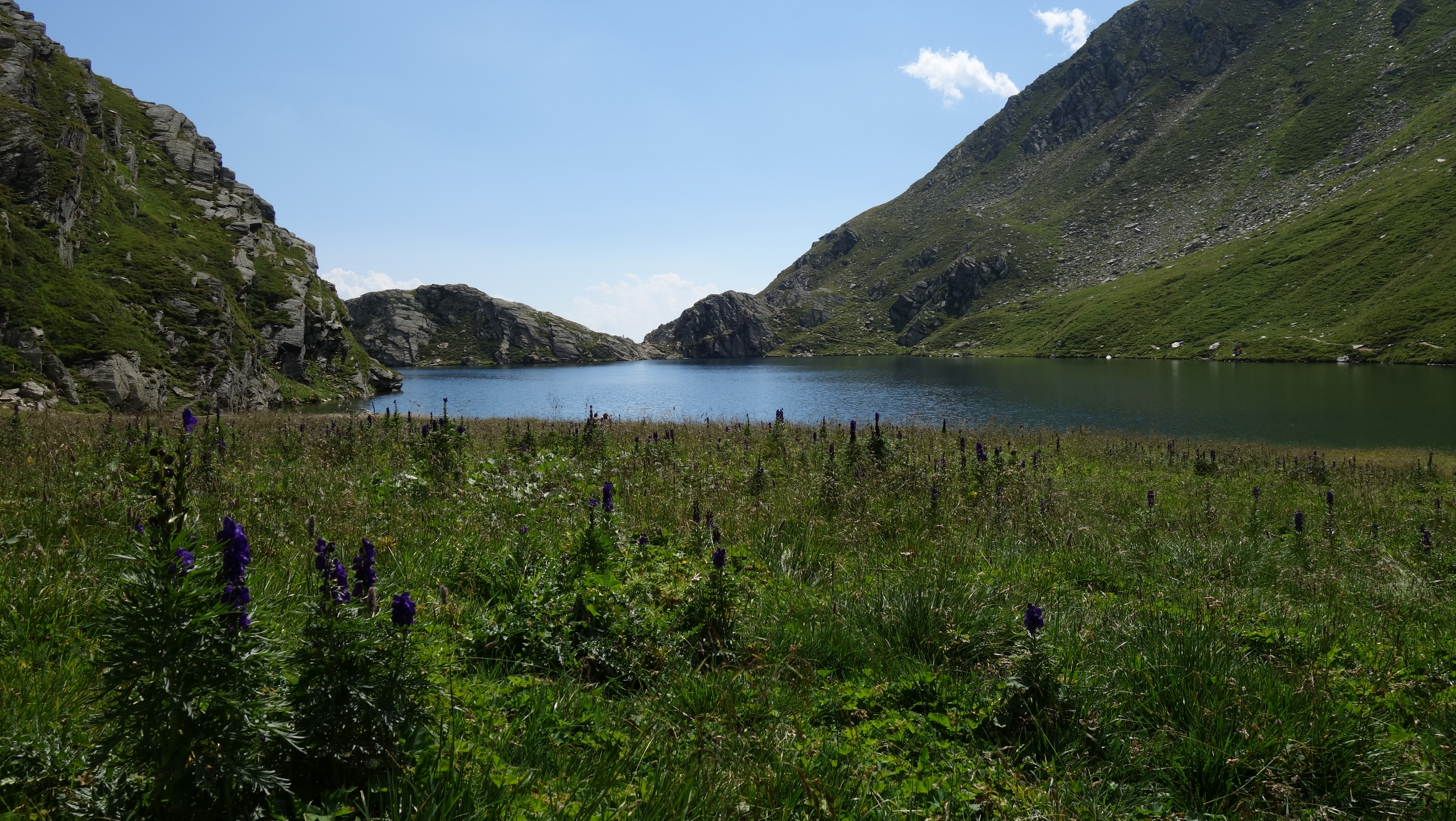 Ein unvollständiges Frühstück vom diffusen Büfett am nächsten Morgen vor dem Start zur 8. Tagesetappe (ATG2-16) zeigt später die Folgen auf der Tour von Brugger zum Schutzhaus Wieserhütte. Der Weg beginnt auf der Forststraße, die wegen umgefallener Fichten und Lärchen eigentlich nicht abgekürzt werden kann. Unser ausgewählter Weg 14 ist im Wanderangebot seit 10 Jahren gestrichen und wird nicht mehr markiert oder beschildert. Der örtliche Wanderleiter empfiehlt, wie wir im Nachhinein erfahren haben, über den attraktiveren Weg 6A (7 h Gehzeit zur Wieserhütte) zu wandern, da der auch den kleinen und mittleren Seefeldsee erschließt. Die Paulscharte (2.579 m) wird überschritten, auch könnte man noch einen relativ kurzen Abstecher zu einem interessanten Aussichtsgipfel (Seefeldspitze 2.715m) machen. Wir jedoch laufen nach GPX File und finden ab und zu eine verblichene alte Farbmarkierung. Der wilde Weg ist in der Landschaft nicht auszumachen. Wegen des geringen Frühstücks waren mehrere kleine Esspausen nötig, und wir erreichten die Furkelscharte (2.457 m) nach 5 Stunden Aufstieg. Hier erfreut einen der Blick auf den großen Seefeldsee, der sogar ausgesetzte Saiblinge im Wasser hat.