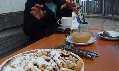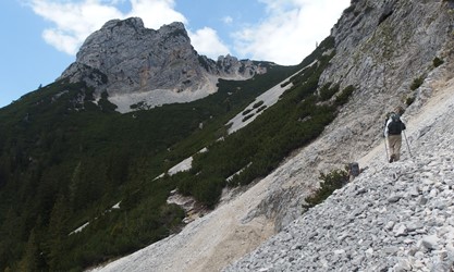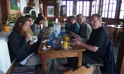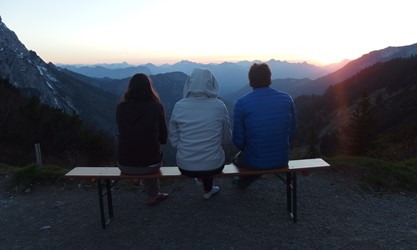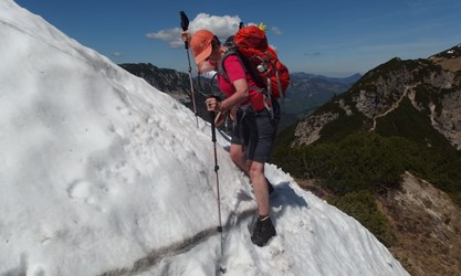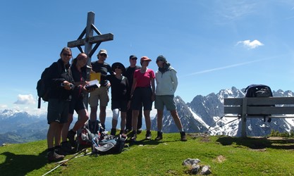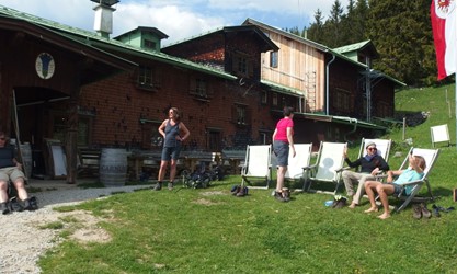 Donnerstag soll die längste Tour werden. Über den Feldalmsattel verlassen wir den Wilden Kaiser, um auf halber Höhe dem Zahmen Kaiser entlang zu wandern. Auch hier noch letzte Schneefelder, die vorsichtig überwunden werden müssen. Und auch Geröll erfordert unsere volle Aufmerksamkeit. Aber alle halten wacker durch, niemand macht schlapp. Diese letzte gemeinsame Etappe endet in der Vorderkaiserfeldenhütte. Unsere bisherigen ausgesprochen guten Erfahrungen bekommen hier dann doch einen Dämpfer. Freiwillig wollen wir auch mal die Erfahrung eines Matratzenlagers machen. Wir waren ja nur zu acht, aber die Vorstellung, hier im Sommer vielleicht auf extrem engen Raum unter dem Dach mit gut vierzig Leuten zu liegen, ist eher gruselig. Auch das Essen war wenig überzeugend! Der Blick auf Kufstein und Inntal ist jedoch traumhaft. Schön auch der liebevoll angelegte Alpengarten, der in Zusammenarbeit mit der Uni München die Flora der Alpen zeigt. Ein letztes Mal „Mäxle“ am Abend, ein letztes gemeinsames Frühstück am nächsten Morgen und dann trennen sich unsere Wege.