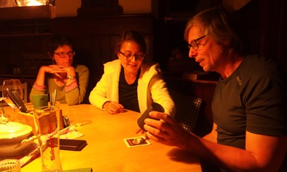 Der dritte Tag führt durch wunderschöne Wälder hoch zum Stripsenjochhaus. Die Wege werden lärmend mit einem Gebläse vom alten Laub befreit, damit wir und die vielen Wanderer, die noch kommen werden, den manchmal schmalen und steilen Pfad sicher begehen können. Das Stripsenjochhaus liegt auf 1577m auf einem Sattel. Hier kommen erstmals „alpine Gefühle“ auf. Ein traumhafter Blick auf die nahen, imposanten Gipfel und Wände vom Totenkirchl, Predigerstuhl, Fleischbank und Mitterkaiser und in zwei Täler (Kaisertal und Kaiserbachtal). Die Sonne meint es gut und hat einen großartigen Abgang. In dieser Hütte, die auch erst am letzten Wochenende geöffnet hatte, steckt noch die Kälte des Winters. Die Fenster stehen offen damit die Wärme hinein kann. Die Stube ist aber auch hier gut geheizt und wir spielen wie jeden Abend „Mäxle“. Was haben wir Spaß beim Lügen und Blöffen!
