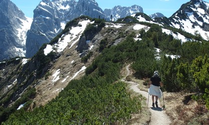 Kufstein, Sonntagmorgen. Es ist noch früh und es ist ziemlich frisch. Die Seilbahn bringt uns zum Brentenjoch, um halb zehn ist dort oben der Treffpunkt für unsere sechstägige Hüttenwanderung im Kaisergebirge. Alle sind (fast) pünktlich und wir erkennen uns wieder, hatten wir uns doch einige Wochen vorher zu einem Vorbereitungstreffen zum ersten Mal gesehen. Auf dem Adlerweg geht es gemütlich zur Kaindlhütte, nach eineinhalb Stunden beziehen wir unser erstes Quartier. Die Saison hat gerade begonnen, vor kurzem lag hier noch Schnee. Wir haben komfortable Zimmer mit frischbezogenen, kuschelig warmen Decken. Nachmittags machen wir noch eine Tour zur Walleralm, zum Einlaufen und Warmwerden, über Almen mit Tausenden von Christrosen, die nur hier wild wachsen.