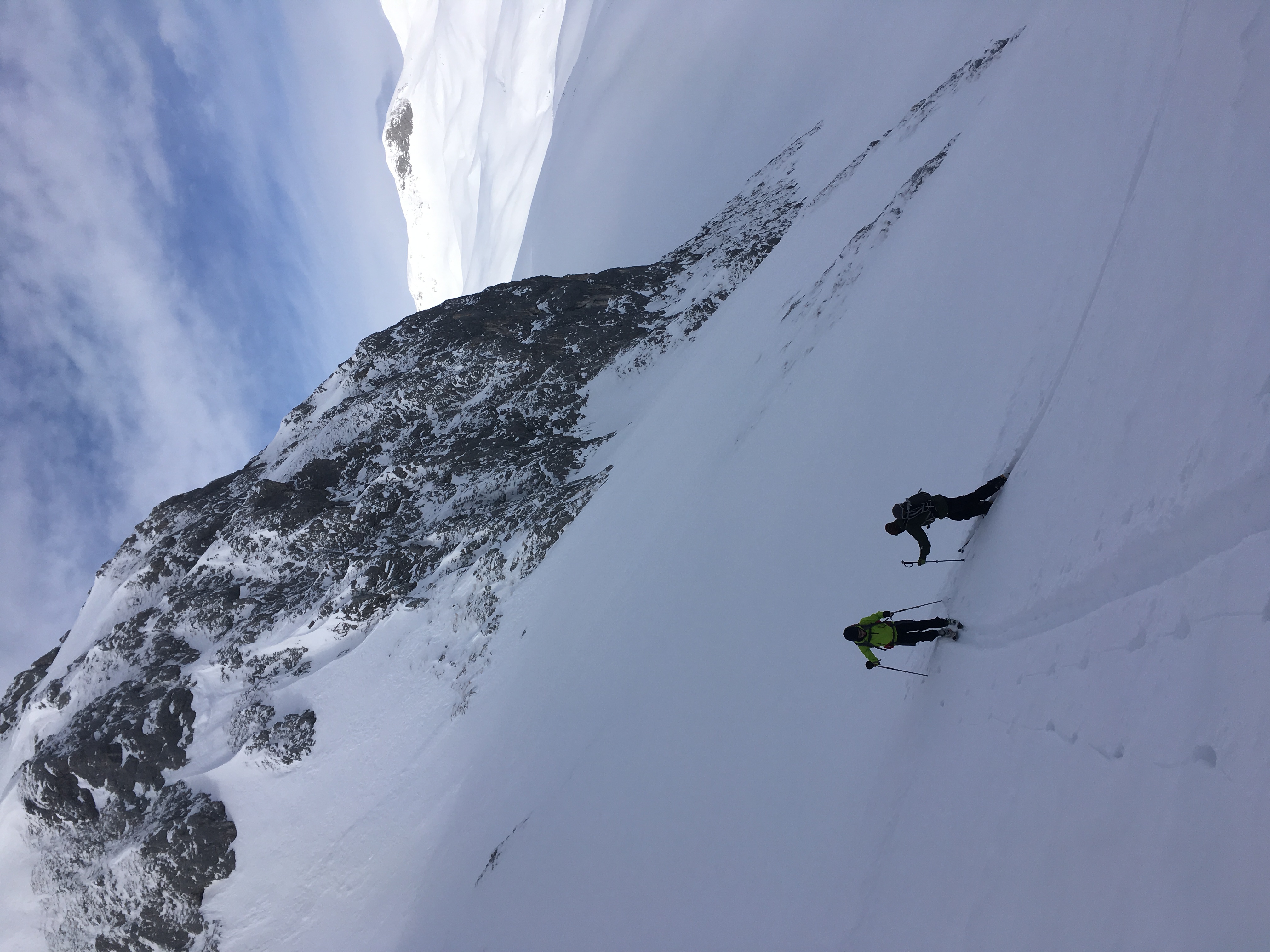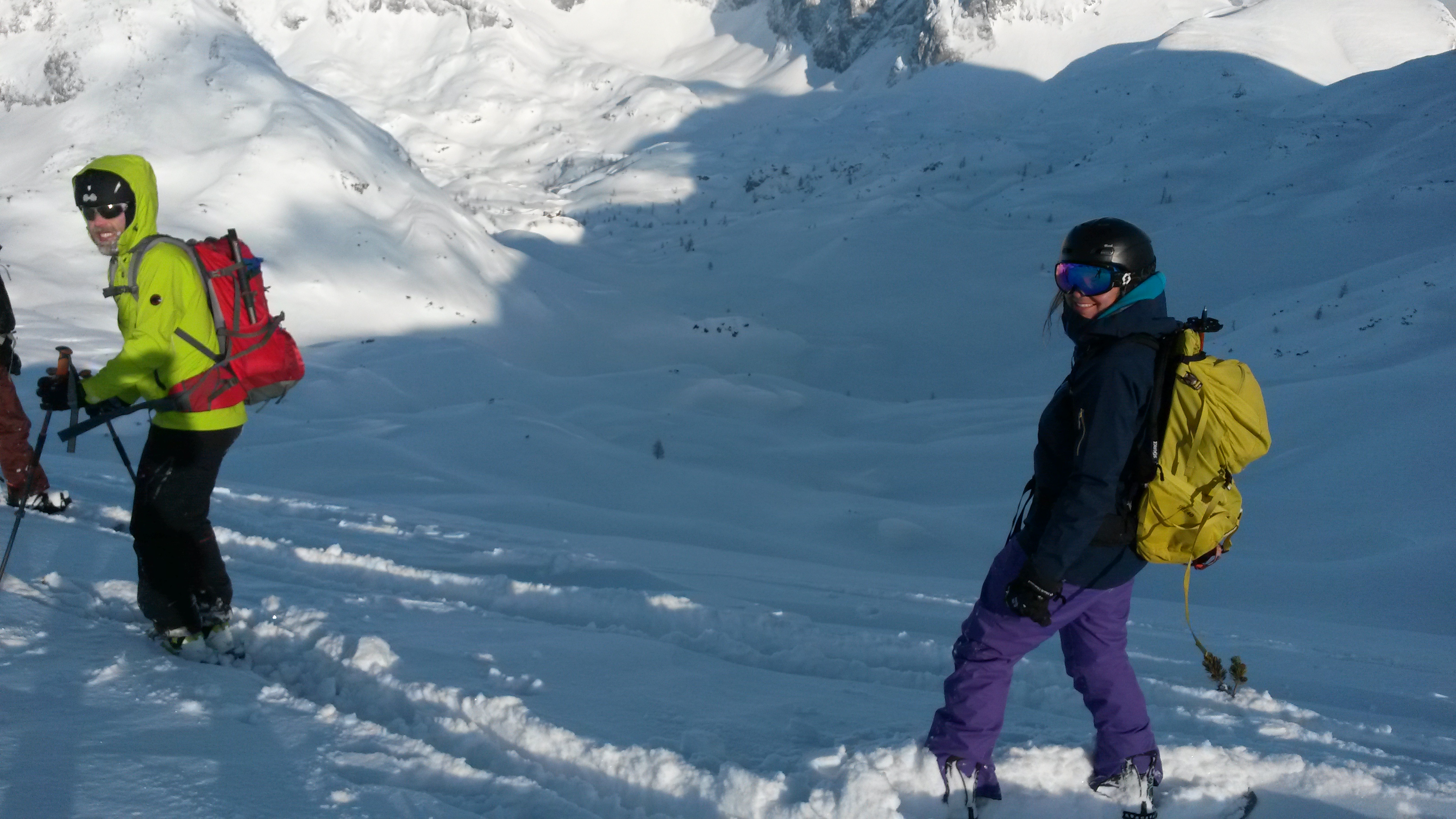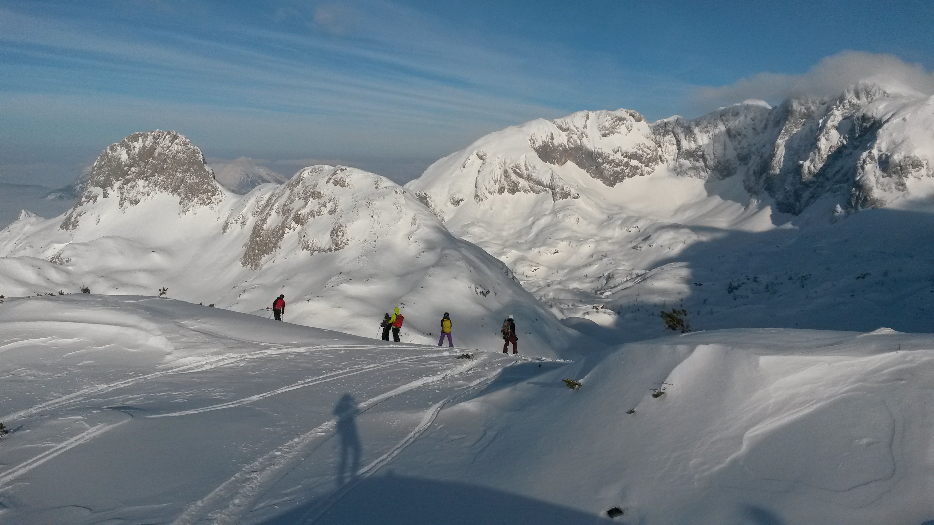 Donnerstag und Freitag standen Tagestouren an, die sich durch nie dagewesenen Pulver auszeichneten. Das Kar zum Hochkarfelderkopf mussten alle noch zweimal wieder rauf, um alles zu zerfahren. Sogar Gruppenteilung war nötig, um alle Gipfel abzuhaken. Neigungsgruppe Fels zum Fritzerkogel schloss sich Ulrich an, der Rest zum Bleikogel. Alles ohne vorgelegte Spur, dafür gelegentlich Sonne. Zum Wochenende störten dann andere Tourengeher unser Revier. Zeit für Abfahrt, Bahn, Dusche.