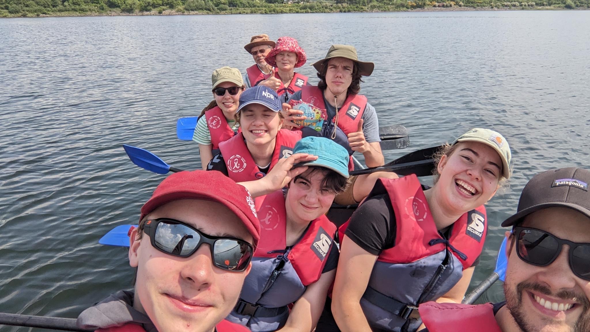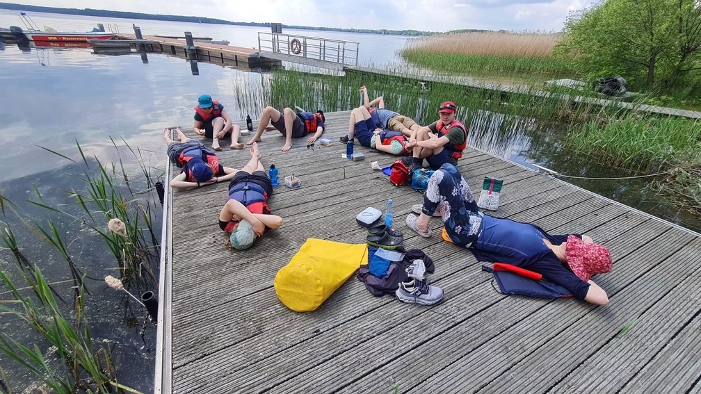 Am nächsten Morgen erwachten alle frisch und munter und fielen über das Frühstück her. Gestärkt und voller neuer Energie brachen sie zum Senftenberger See auf. Nach einer kurzen Einweisung brachen sie, ausgerüstet mit Schwimmwesten und Katies, auf ins Abenteuer. Die nächsten vier Stunden wollten sie mit ihrem 10er-Kanu die atemberaubende Artenvielfalt des Lausitzer Seenlandes erkunden. Nach etwa zwei Stunden und ungefähr genau so viel Jammerei erreichten sie schließlich einen Steg. Am Ufer angekommen, legten sie sich in die Sonne und hatten eine Snacktime. Nachdem sie ihre Energiereserven wieder aufgefüllt hatten, nahmen sie das Ruder erneut in die Hand und begaben sich auf die Rückfahrt. Neben zahlreichen Begegnungen mit unterschiedlichsten Fortbewegungsmitteln auf dem Wasser kam es zur Traumabewältigung der Osterkanufahrt 2018. Außerdem kam es zu einer wilden Wasserschlacht, die bei einzelnen Teilnehmern zu Unmut führte. Als sie durchnässt am Steg ankamen, verließen einige deswegen fluchtartig das Boot, während andere noch eine zweite Wasserschlacht starteten und abschließend vom Kanu sprangen, um noch eine Runde zu baden. Zunächst mussten sie noch das Wasser aus dem Boot schöpfen, bevor sie sich erschöpft, aber glücklich auf den Weg zum Campingplatz aufmachen konnten. Dort ließen sie den Tag, nach einem leckeren Abendessen, mit einer Runde Werwolf ausklingen.