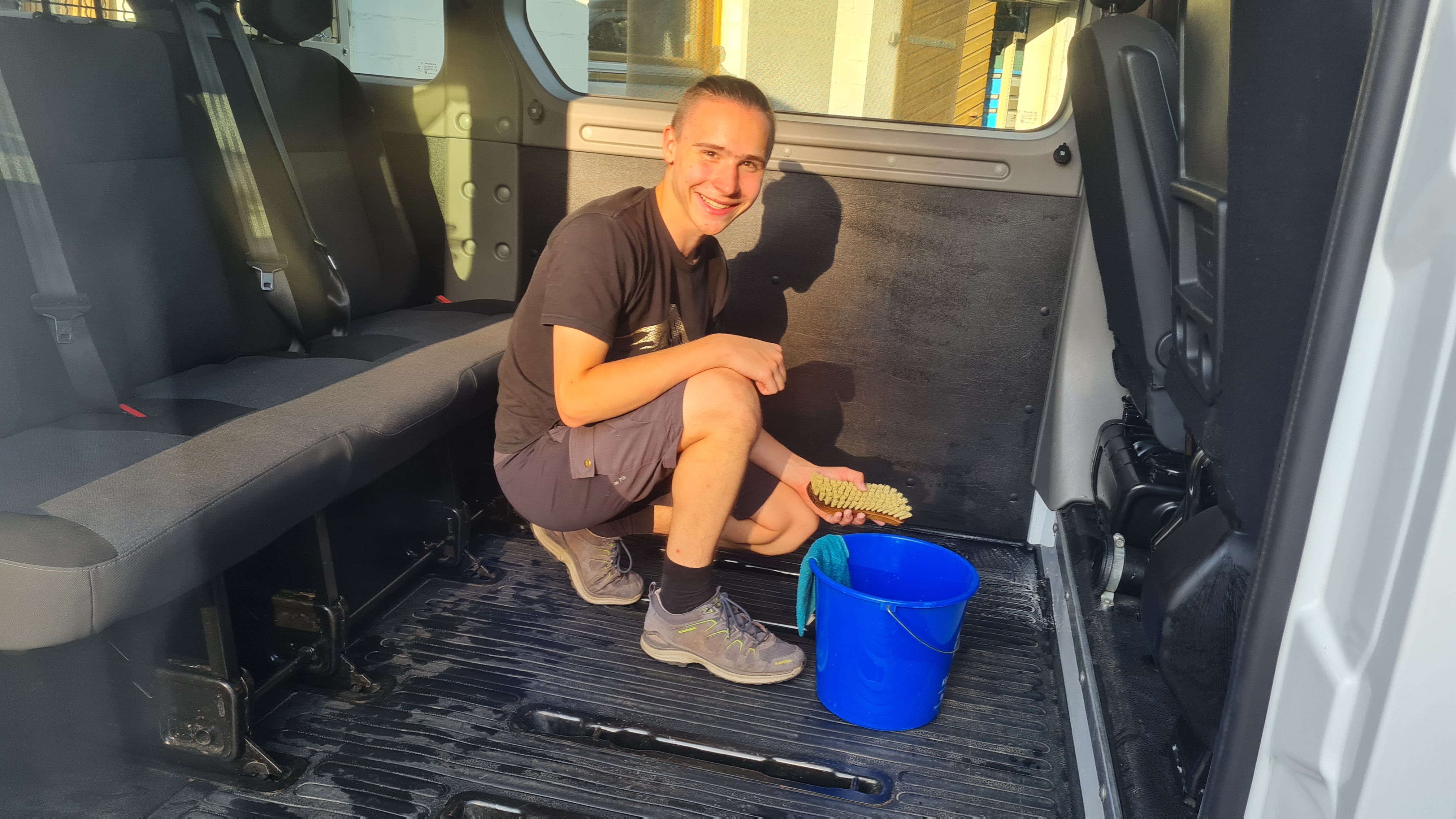 Ich, Euer Jugendbus, stehe vor dem Kletterzentrum und befördere hauptsächlich Jugendgruppen. Aber auch andere Gruppen erfreuen sich meiner Transportmöglichkeiten. Ich bin ein Neunsitzer und habe hinten sehr viel Platz für Gepäck, Klettergeraffel, Skier, Snowboards, Wanderrücksäcke, Essensbevorratung und ihr glaubt nicht, was ich noch so alles transportieren kann. Hier sei nur mal das alljährliche Pfingstcamp erwähnt. Da bin ich immer mittendrin und voll dabei. Ich komme viel rum und weit weg. Leider finden es alle blöd wenn ich dreckig bin. Aber wenn die Gruppen heimkommen, haben sie nicht unbedingt meine Säuberung im Fokus. Nun, mein neuer Betreuer Joost fand, dass ich mal eine Grundreinigung verdient habe, welch Glück tirili. In Kaltenkirchen wurde ich über zwei Stunden mit Schrubbern bearbeitet. Auch und gerade von oben, wo sich ja schon Moos angesiedelt hatte. Von dem Saharastaub und Blütenstaub ganz zu schweigen. Mein Reinigunstrupp, Jörg und Joost, haben sich danach erstmal mit Crêpes bei den Kochs´s gestärkt. Währenddessen konnte ich mich etwas an dem neuen Glanz erfreuen. Mit neuem Elan widmete sich nun der Putztrupp, verstärkt durch Rike, meinem Innenraum. Alle Schapps und alles was nicht niet- und nagelfest war, wurde ausgeräumt. Selbst die Sitzbänke haben sie ausgebaut. Mit Staubsauger wurde alles Grobe entfernt. Danach war viel Wischwasser nötig, um mit Schruppbürsten und Lappen nun den Dreck zu entfernen. Viele Utensilien sind nun in beschrifteten Kisten verstaut. Abends um halb zehn, also über drei Stunden später, ging es zurück zum KLZ. Mein Putztrupp hat ganze Arbeit geleistet. So vertrete ich die JDAV gerne anstatt als Scheppelchese in der Ecke zu stehen. Mit einem netten Nachtreffen, nach einer Ausfahrt, könnte man doch regelmäßig eine Endreinigung gleich mit einplanen. Das würde mich als Jugendbus sehr freuen, wenn ich euch schon überall hinbringe. Oder halt mit einer Aktion Gruppen übergreifend, das wäre auch lustig. Was meint Ihr?