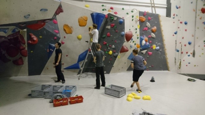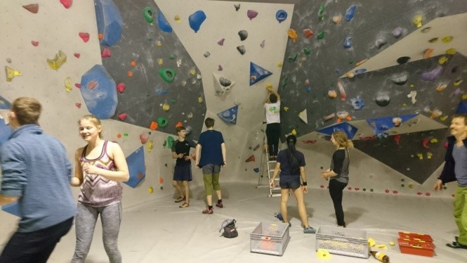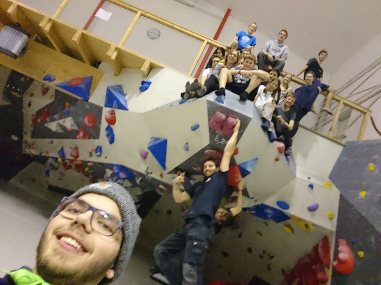 Nach der Pizza ging’s dann richtig los! Die Halle leer, die Musik laut und die Motivation stetig zunehmend. Als Hauptaktivität des Abends war der Schrauber-Workshop geplant und in 2er Gruppen wurden zahlreiche Ideen an die Wand gebracht. Es sind unglaublich coole Routen entstanden. Es wurde gesprungen, geschoben, gehookt, gestützt und am Ende war es so weit und die Schrauber durften sich an den Startschildern verewigen.