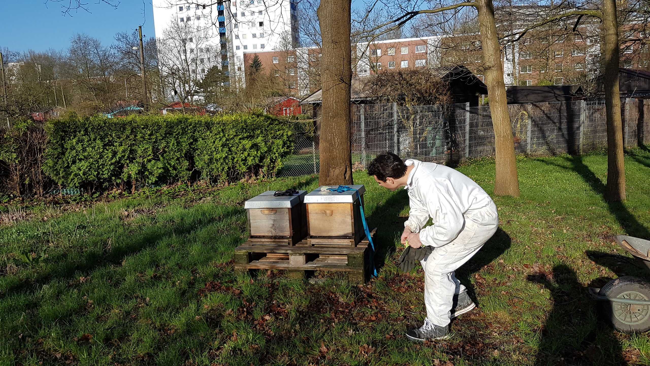 Diese Verbindung wird nun mit dem Einzug von zunächst zwei und später weiteren zwei Bienenköniginnen und ihren Völkern gekrönt. Seit dem 17. April 2018 sind die fleißigen Bienen in unserer näheren Nachbarschaft in den Kleingärten unterwegs und bestäuben Blüten, sammeln Nektar und helfen fleißig bei der Produktion von Honig.